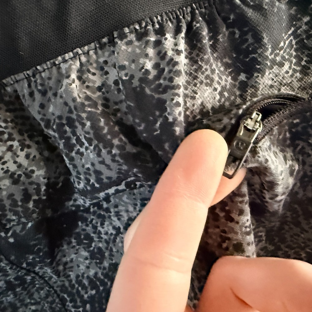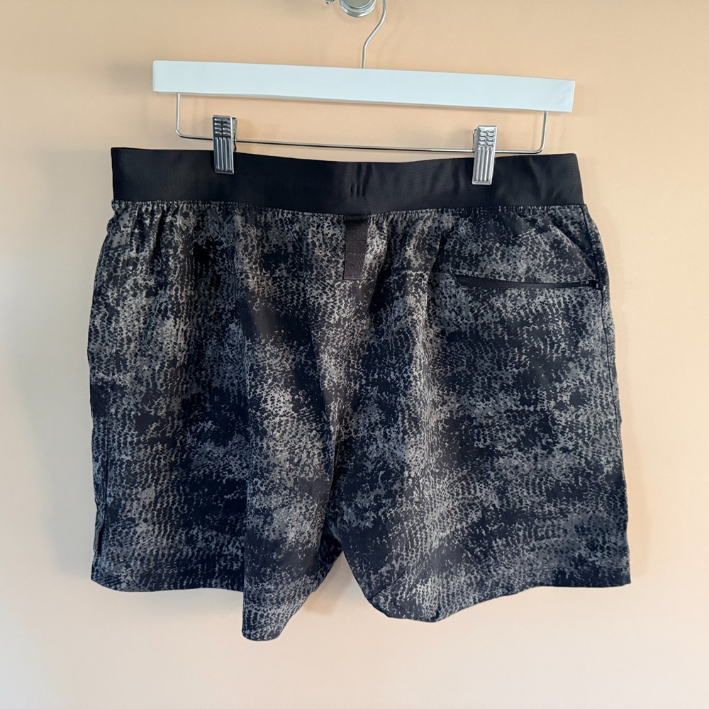The product is a pair of Lululemon men's medium athletic running shorts in a stylish grey digital camouflage pattern. These flexible shorts feature a drawstring closure, athletic fit, and 7-inch inseam, making them perfect for activewear occasions such as gym training or running. The blended fabric with stretch fabric ensures comfort and flexibility for various spring and summer activities. It is a machine washable garment with easy care instructions for convenience. Ideal for men looking for high-quality athletic shorts that combine style and performance.