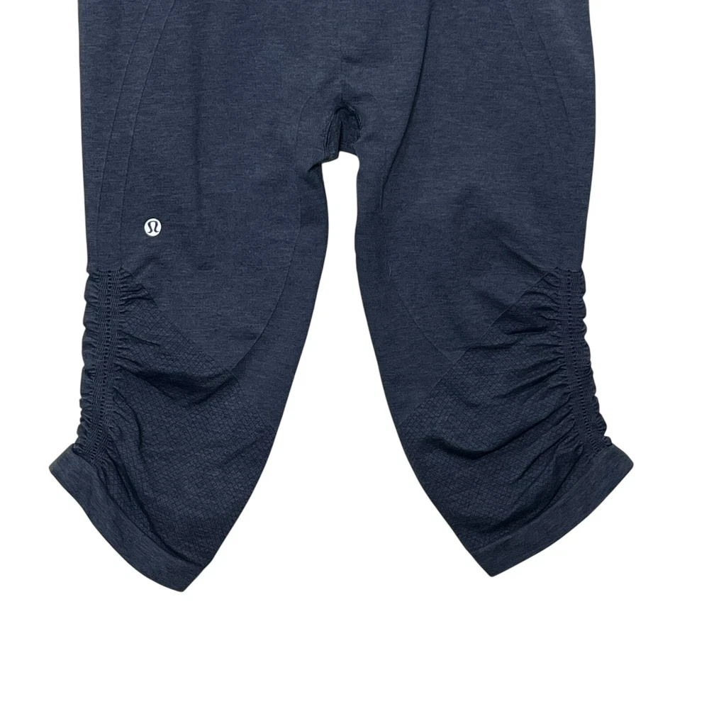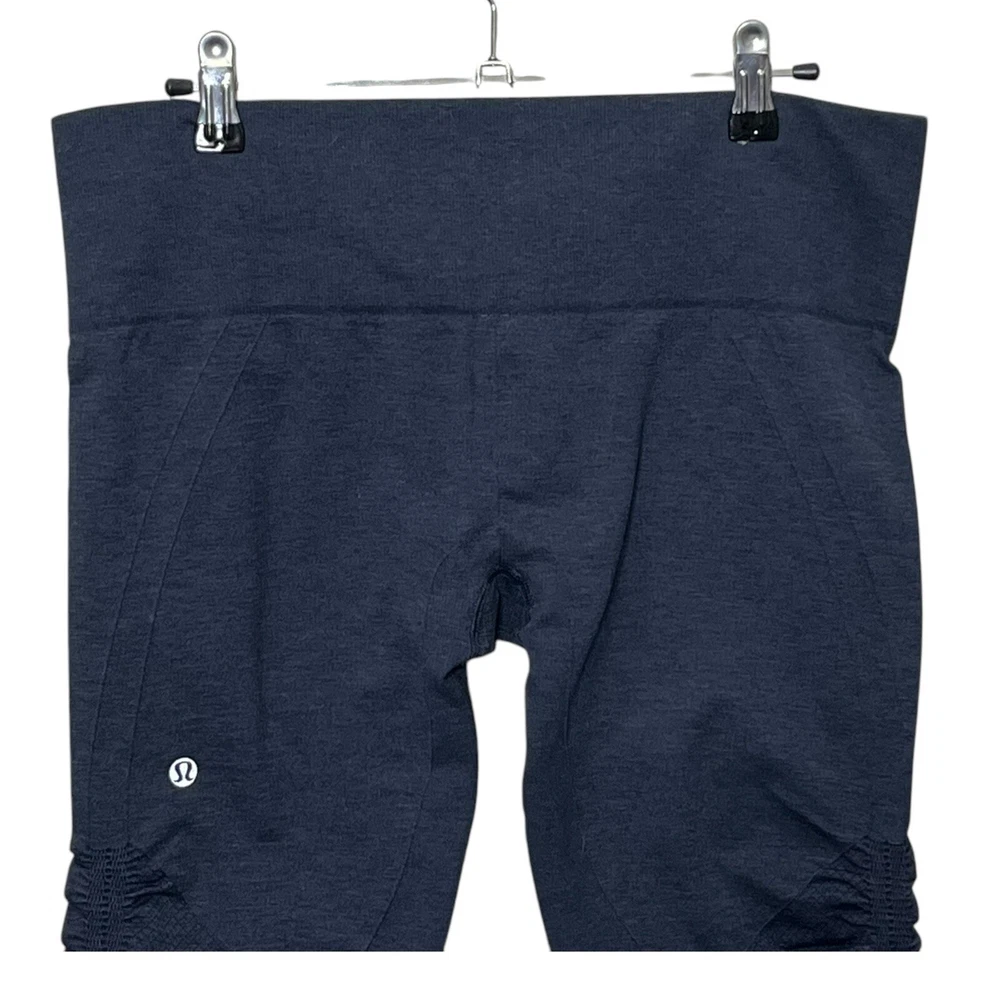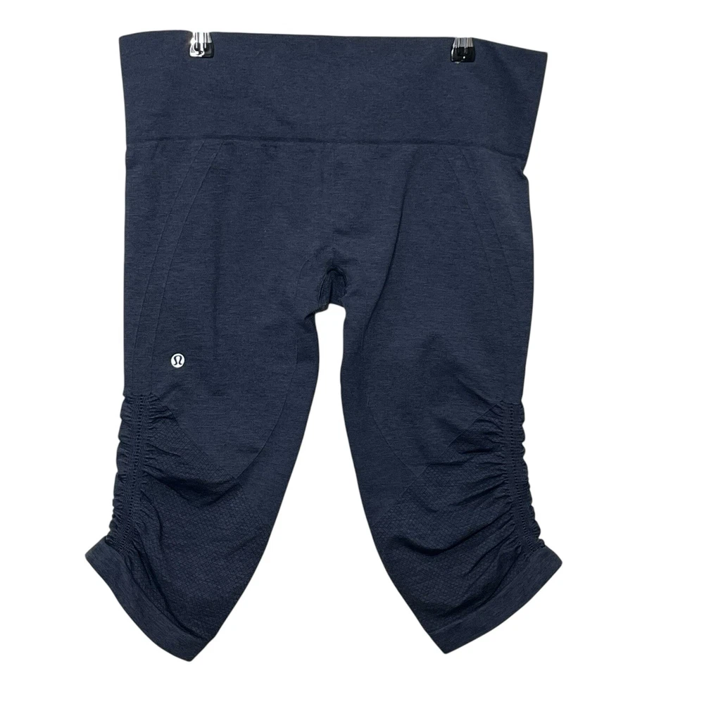 Lululemon Heathered Cadet Blue In the Flow Capri Leggings Women’s Size 10 Approximate Measurements taken flat:waist 15.5 ,rise 9, inseam 16 Pre-owned; in great condition. No rips, stains or holes. Please see all photos for condition details.