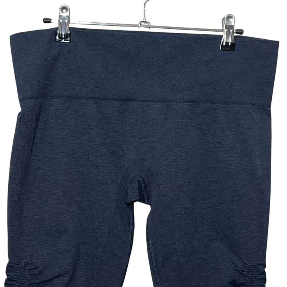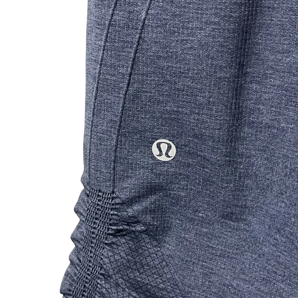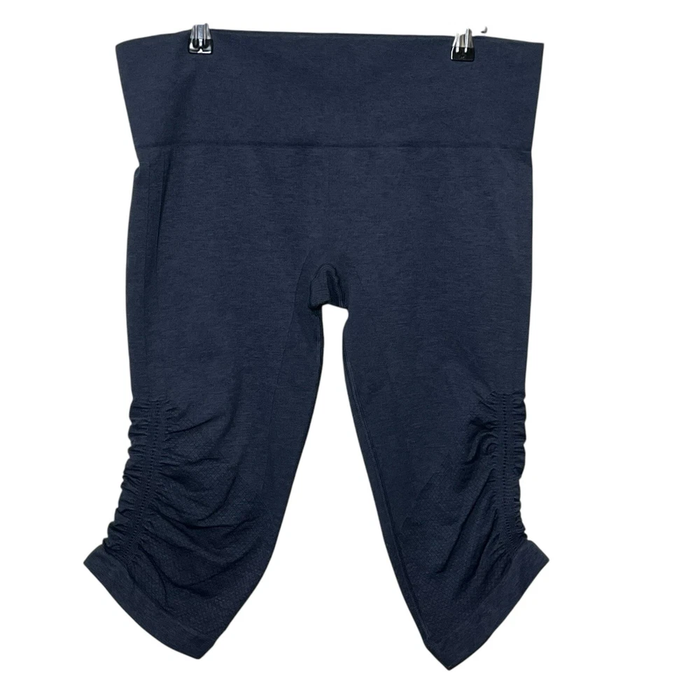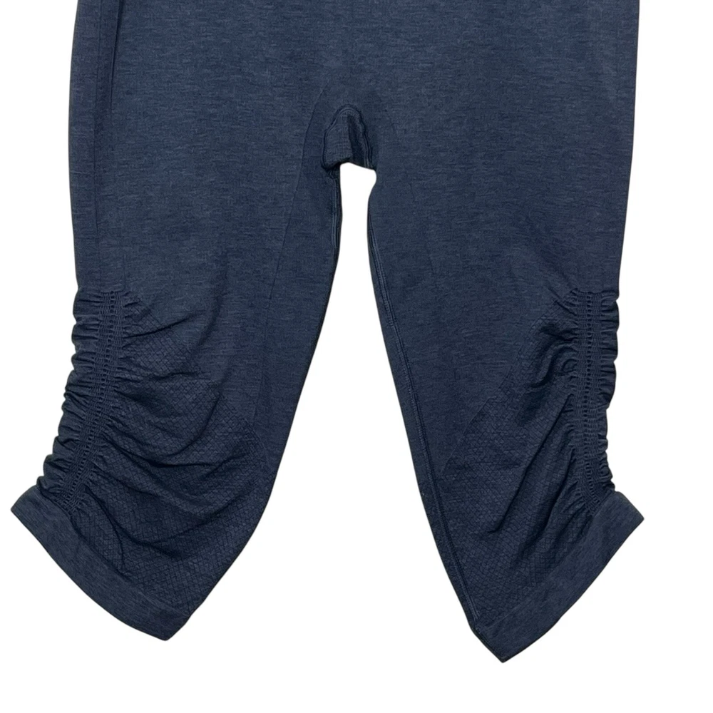 Lululemon Heathered Cadet Blue In the Flow Capri Leggings Women’s Size 10 Approximate Measurements taken flat:waist 15.5 ,rise 9, inseam 16 Pre-owned; in great condition. No rips, stains or holes. Please see all photos for condition details.