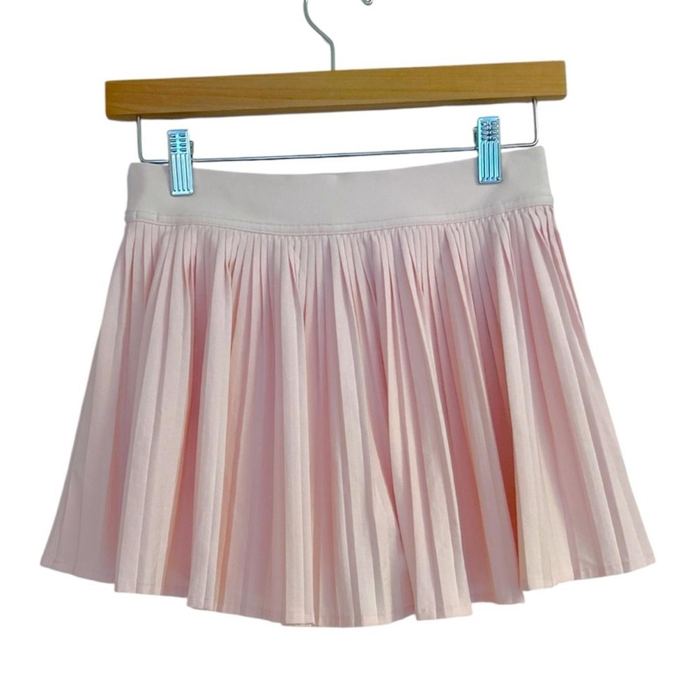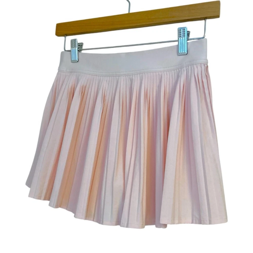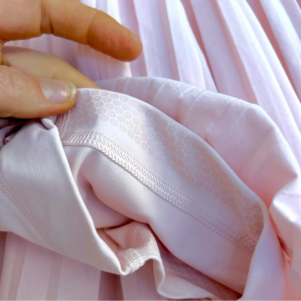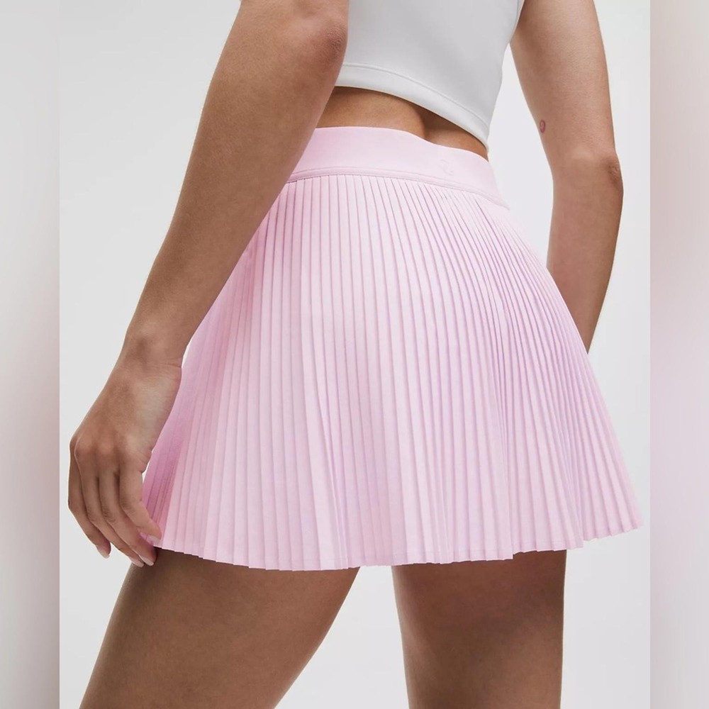 Lululemon Varsity High-Rise Pleated Tennis Skirt in Pink Organza, Size 4 • Lightweight • Four-way stretch • Sweat-wicking • Quick-drying Built-in Luxtreme™ fabric liner is sweat-wicking and four-way stretch with a cool, smooth feel • High rise Skirt length is measured at the centre front, from the top of the waistband to the hem Skirt length: 12.5" • Liner length for all sizes: 3" • Drop-in pockets on the liner • Silicone grippers on the hem prevent ride-up • Built-in liner offers extra coverage Front Lining: 87% Nylon, 13% Lycra Elastane Back Lining: 69% Nylon, 31% Lycra Elastane Waistband: 87% Nylon, 13% Lycra Elastane Body: 86% Recycled Polyester, 14% Elastane