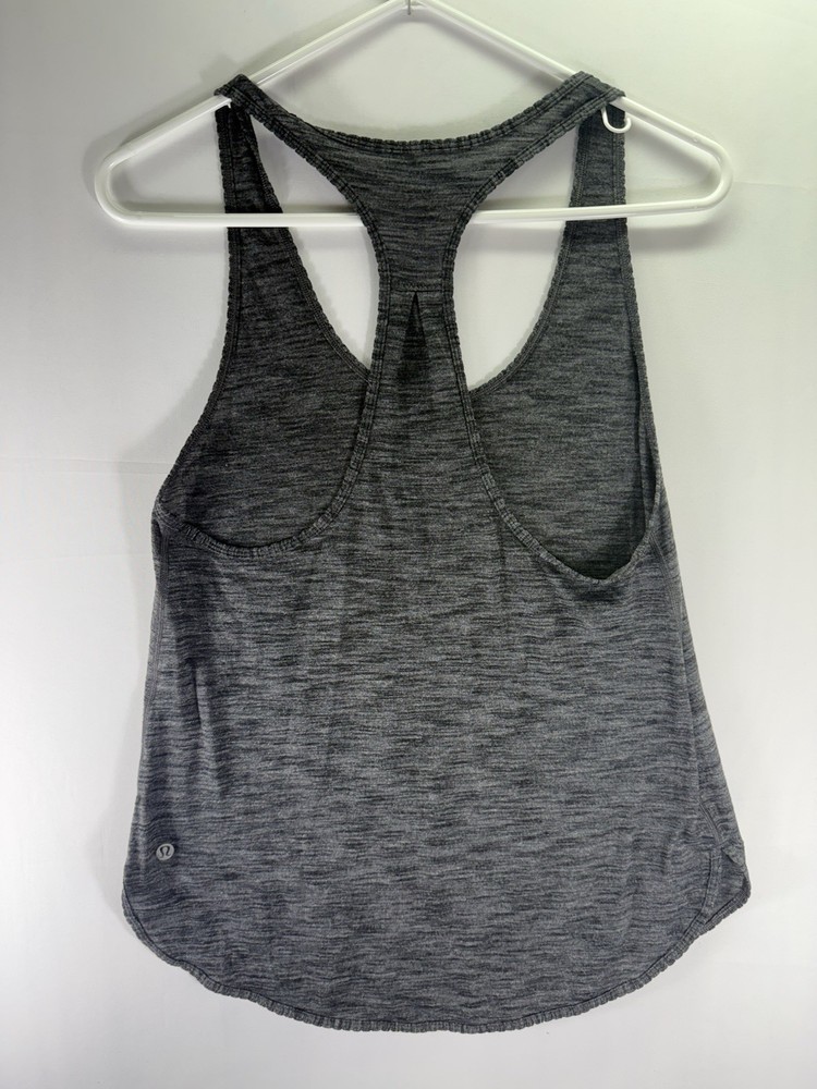 The Lululemon Racer Back Tank Top in Women's Size 6 Heathered Gray is a versatile activewear piece perfect for summer and spring workouts. Made from a blended fabric of spandex and cotton, this tank top features a scoop neckline, pullover closure, and a racerback strap design for added comfort and breathability. With a stylish solid gray color and a gym-themed design, this Lululemon tank is ideal for gym and training activities, offering a collarless, tagless, and machine washable construction for easy care and maintenance.