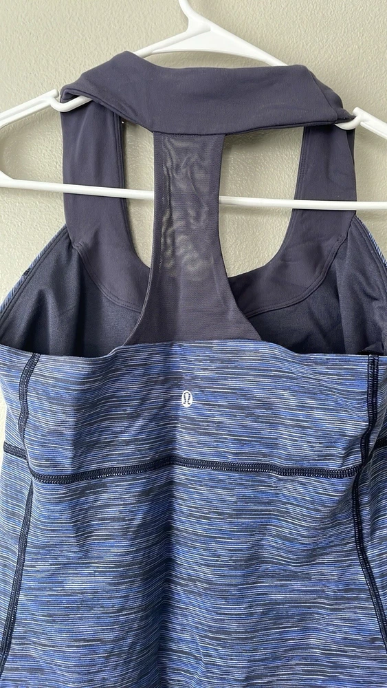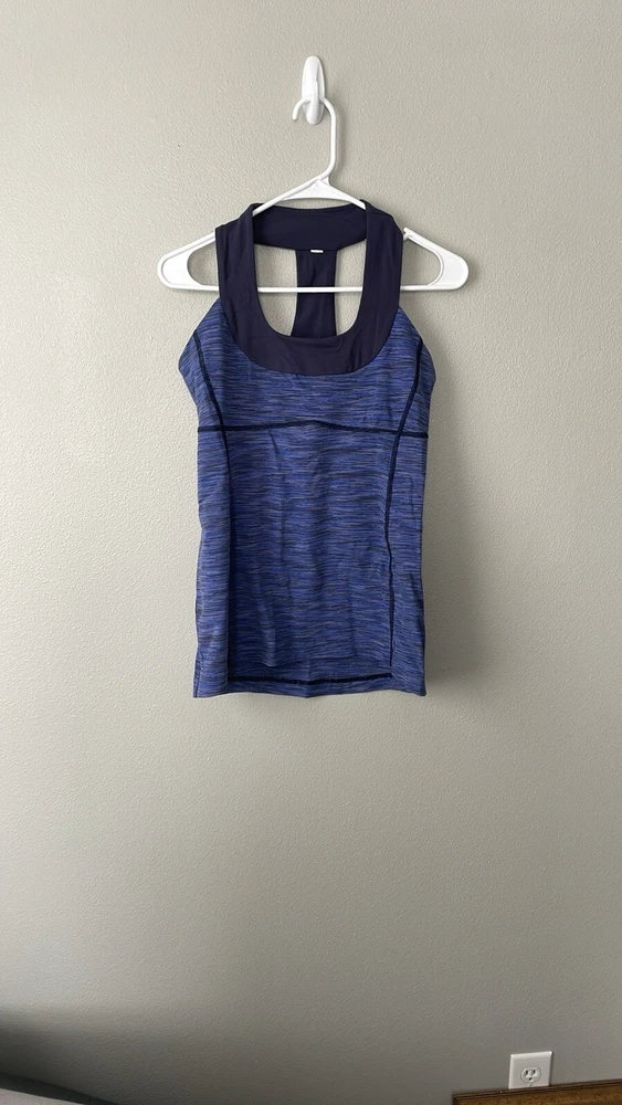 Lululemon Scoop Neck Tank Top Luon Size 8 Color: Space Cadet Blue Style Number: W1F34S Condition: great condition. Doesn’t include pads for the sports bra though. We designed this tank to be an all-purpose piece for the busty and long-torsoed yoginis in our midst. The wide straps and scoop neck give us support so we can focus our backbends without worrying about whether the girls are going to make a run for it.