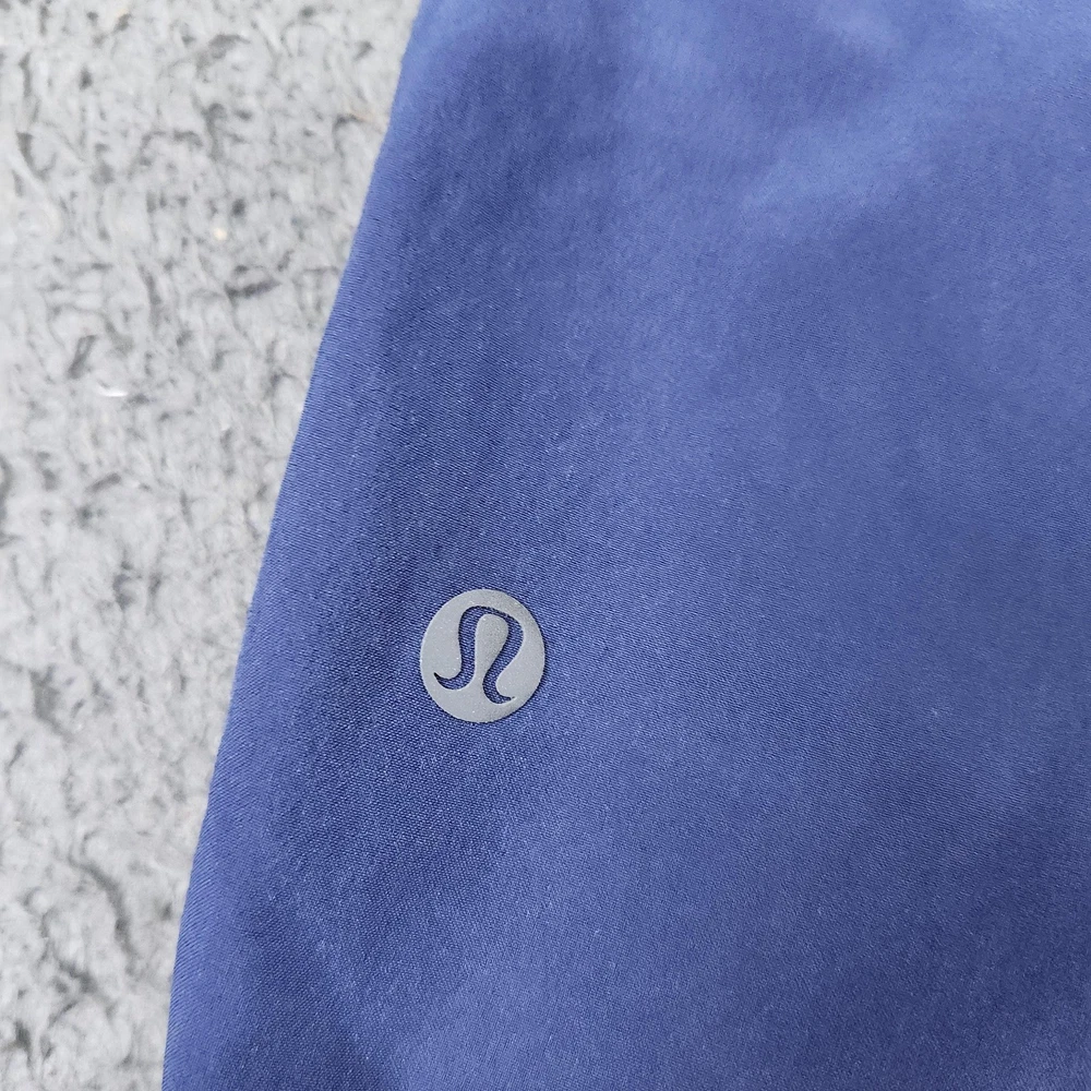 Brand: Lululemon. Style: Mens athletic shorts with a built-in liner designed for running, gym workouts, and other training activities. Color: Blue solid tone. Size: Mens Large, as indicated on the interior size label. Material: Lightweight recycled polyester and elastane performance fabric with a soft knit liner and mesh paneling, according to the interior care tag. Country of origin: Made in Philippines, with design noted as "Designed in Vancouver" on the interior tag. Design details: Wide elastic waistband, double-layer construction with integrated liner for added coverage and support, and a curved hem for ease of movement. Pockets and storage: Front hand pockets with concealed zipper closures to secure small essentials during activity. Branding and accents: Reflective Lululemon logo printed near the lower back leg and branded interior care and content tag. Features and use: Stretch, lined, and lightweight athletic shorts suitable for running, gym training, and warm-weather activewear. Tag details: Interior tag lists Lululemon branding, size L, recycled polyester and elastane fabric content, and printed care instructions.