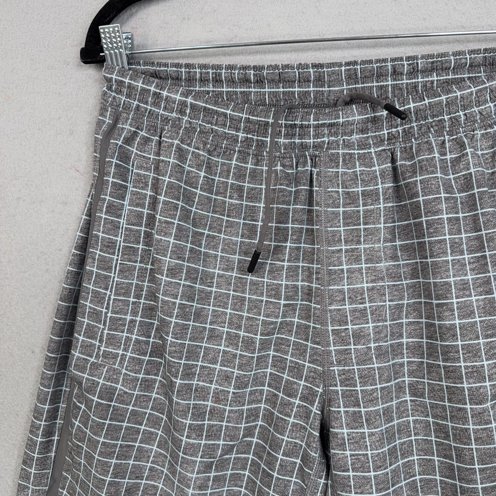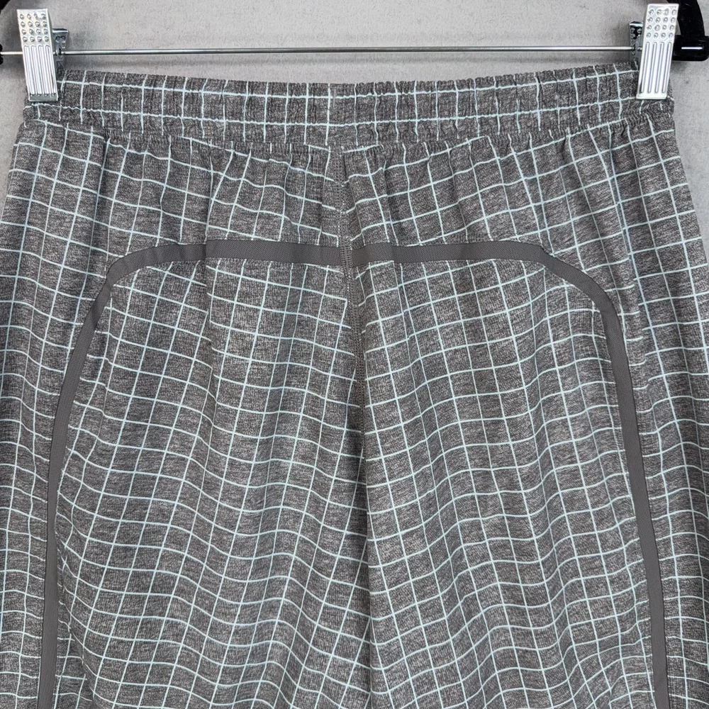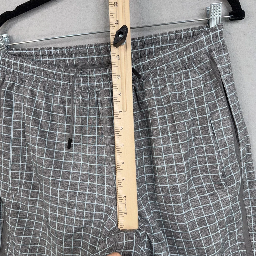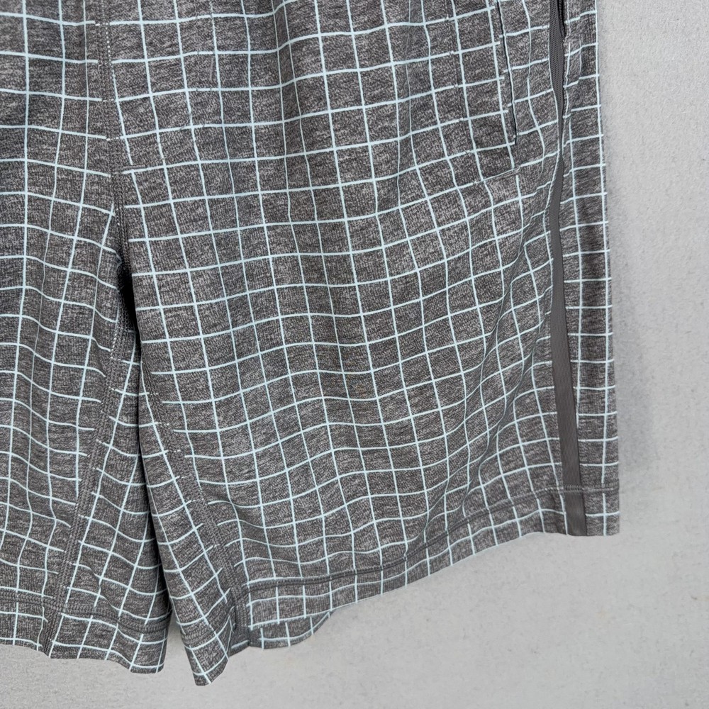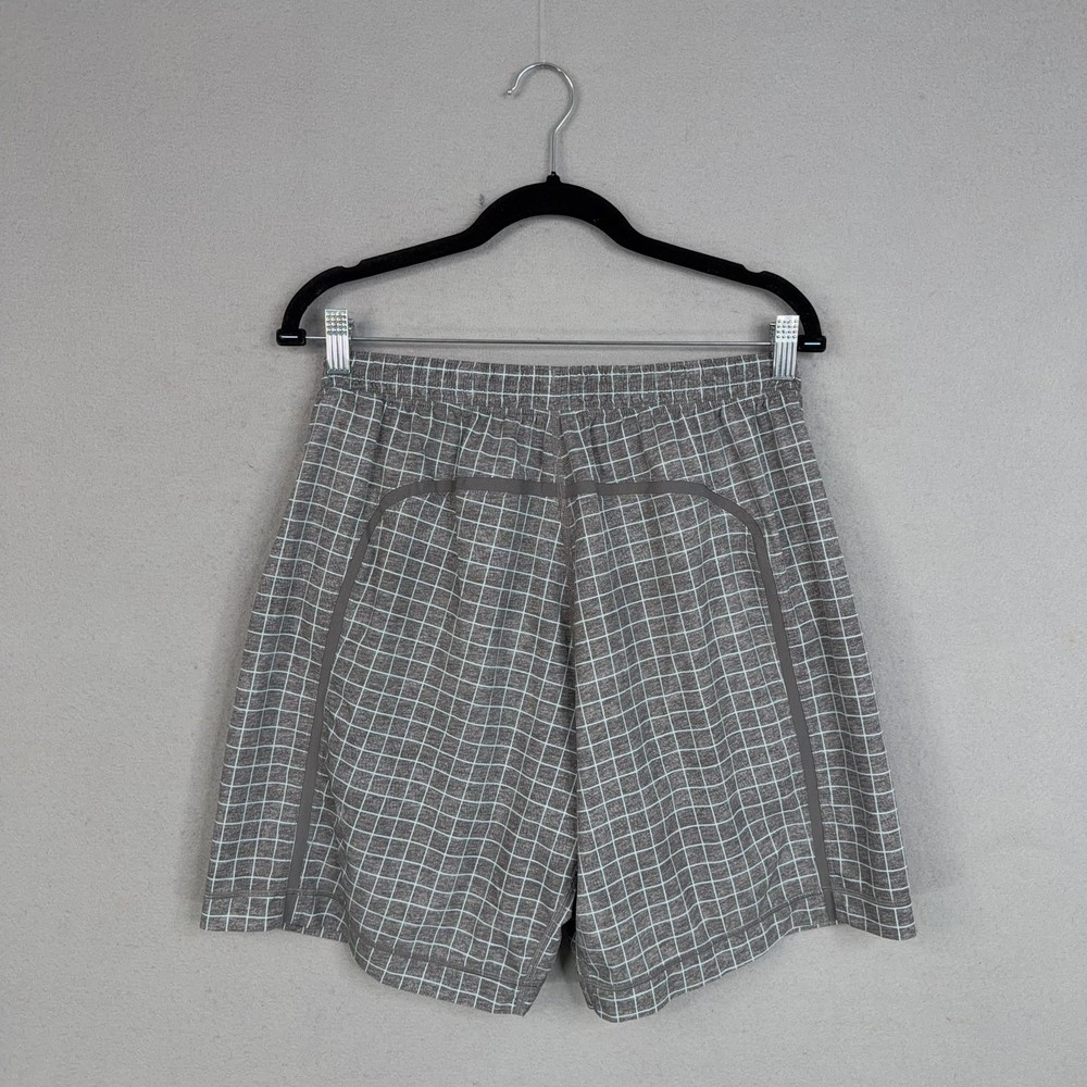 Lululemon Shorts Mens Medium Gray Check Running Athletic Lined Pre-owned Lululemon athletic shorts with light overall wear from prior use. Fabric is clean and intact with no holes or tears, and the grid print remains crisp throughout. Elastic waistband, drawstring, inner liner, and zip pockets are structurally sound with zippers and stitching secure. Reflective Lululemon logo at the back leg is clear; no original packaging or hangtags included. Brand: Lululemon. Style: Mens lined athletic running shorts. Color: Heathered gray body with light grid check pattern and solid gray trim. Size: Mens Medium per circular interior size dot. Material: Performance knit fabric; fiber content not specified on visible labels. Fabric type: Lightweight jersey outer shell with smooth built-in stretch liner short. Details: Elastic waistband with internal drawstring, two front zip hand pockets, and straight hem leg openings. Features: Integrated inner liner for added coverage, breathable performance fabric for training, and secure zip pockets for small essentials. Branding and logos: Small Lululemon reflective logo on the lower back leg and size dot at the interior hem. Country of origin: Not listed on the available tags. Intended use: Designed for running, gym workouts, cross-training, and everyday athletic wear. Special notes: Allover grid check pattern adds visual interest to a versatile performance short. 25293 Measurements: Previous washings may change sizing on the tag. Refer to photos above for all measurements. Compare our measurements to one of your favorite garments. Measurements are approximate. All items are bagged and sealed after being photographed, then stored in a smoke free environment. Washed per eBay standards. I carefully package and ship daily. Contact me with any questions. Thanks