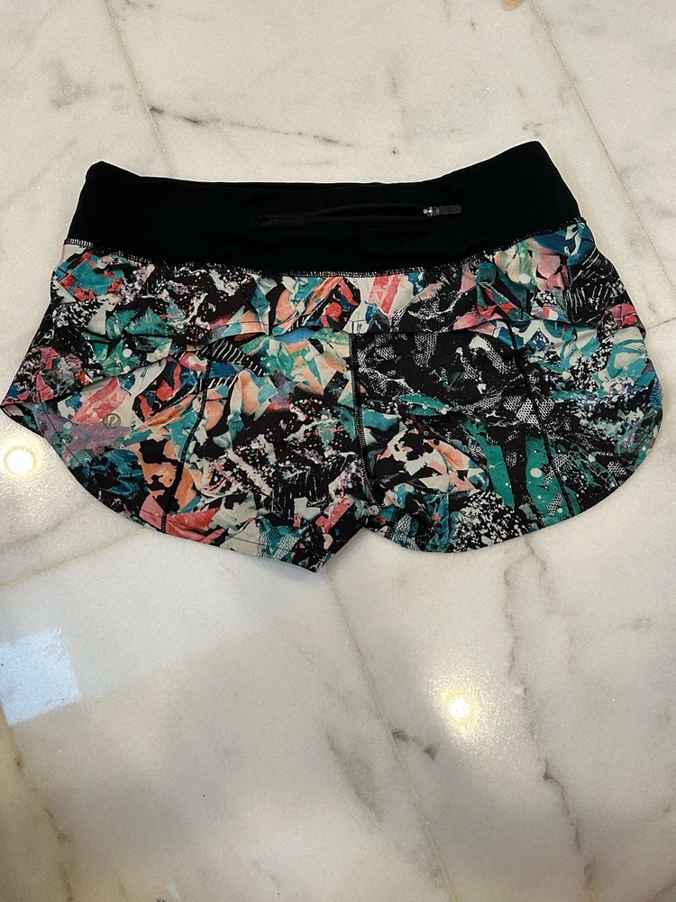 The product is a lot of two Lululemon Speed Shorts in size 4 with a 2.5" inseam. These athletic shorts feature a pull-on closure, multicolor design, and are made of Swift material. Ideal for activewear, the shorts are lined, stretchy, moisture-wicking, and breathable, making them perfect for gym workouts, yoga, or running. The Lululemon brand ensures quality and a comfortable fit for women looking for stylish and functional athletic apparel.