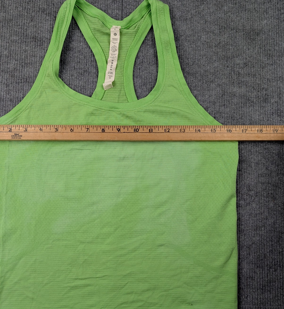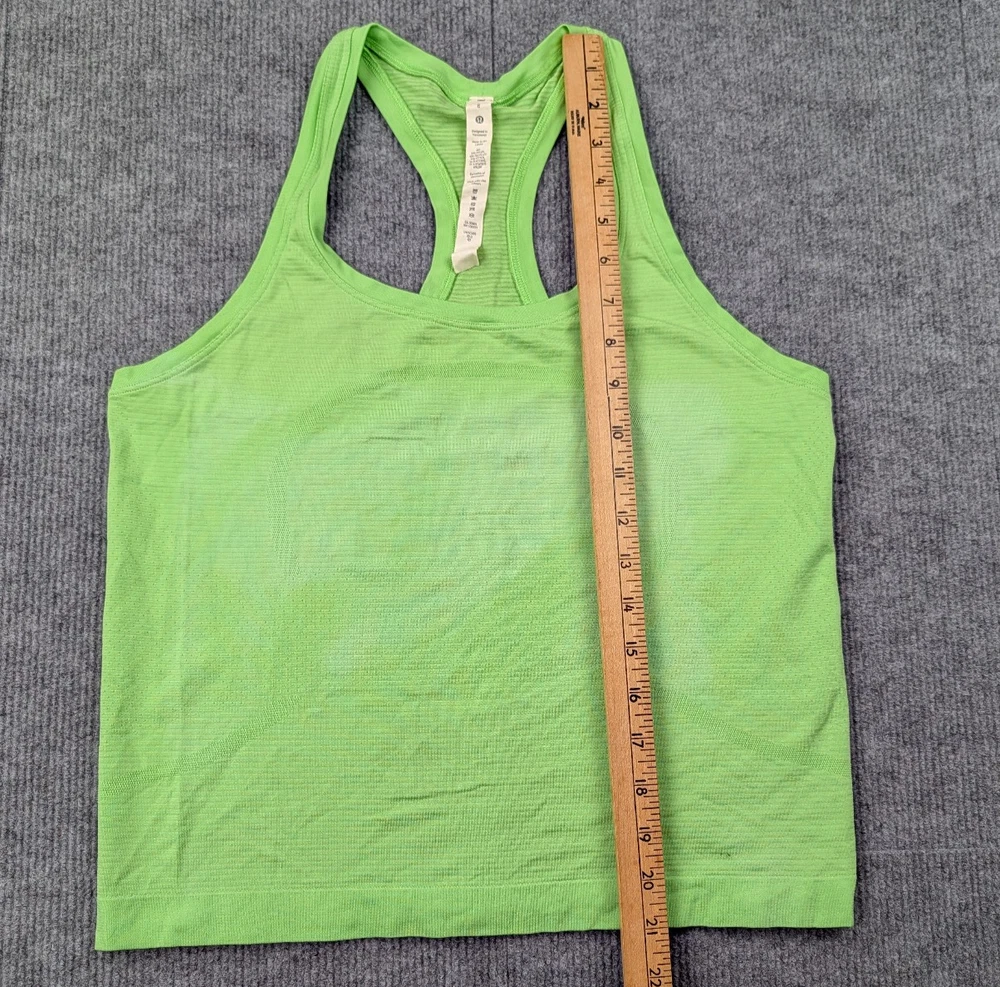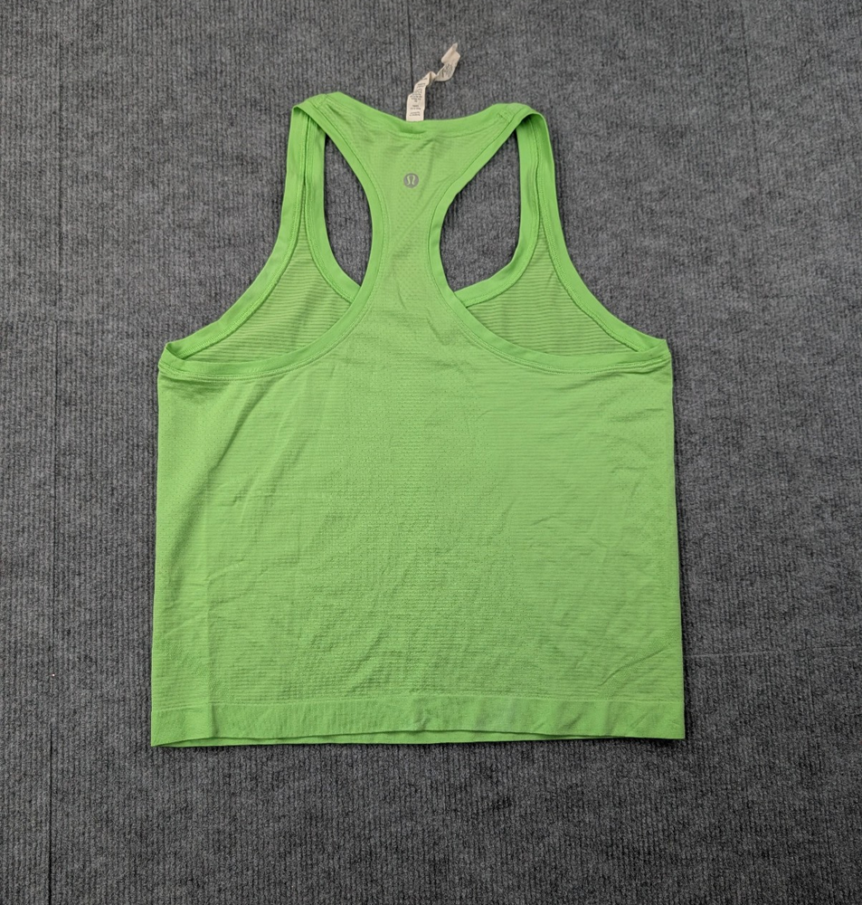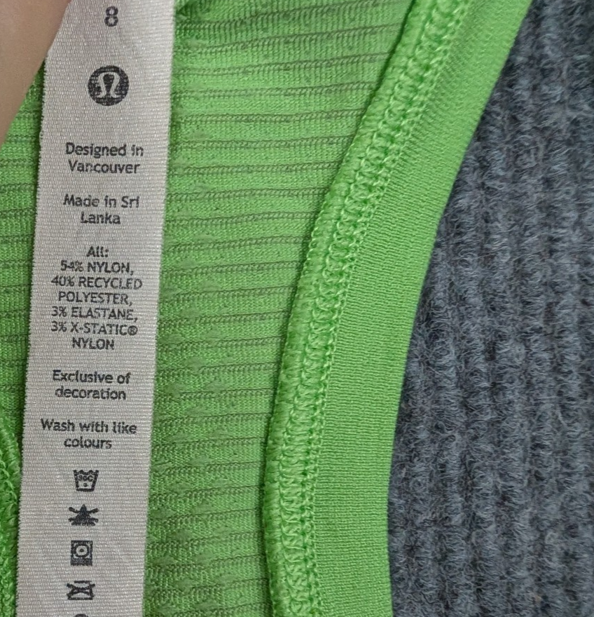 Brand: Lululemon Type: Tank Top Gender: Womens Size: 8 Color: Green Style: Athletic, Workout Neckline: Scoop Neck Sleeve Length: Sleeveless Fit: Athletic Material: Nylon / Recycled Polyester / Elastane (blend) Closure: Pullover Occasion: Activewear, Gym, Yoga, Running, Training Country/Region of Manufacture: Sri Lanka Condition: Pre-owned