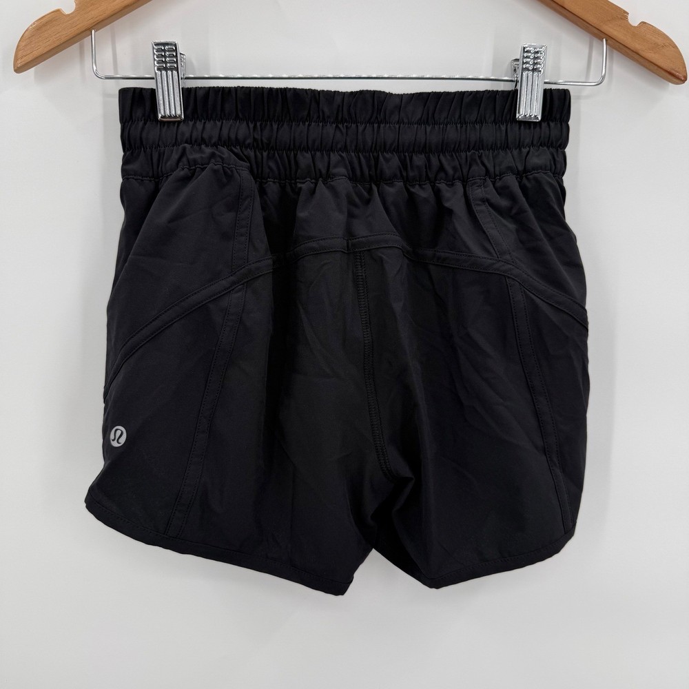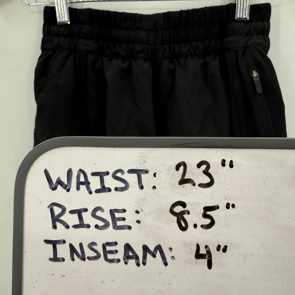 Lululemon Speed Up shorts in black. These athletic shorts feature a high-rise waistband with a comfortable elastic gathering and a drawstring. A zippered pocket on the back right hip provides secure storage for essentials. The Lululemon logo is visible on the left hem. Measurements: • Waist: 23 in • Rise: 8.5 in • Inseam: 4 in Department: Women Style: Athletic Performance/Activity: Running & Jogging, Gym & Training, Cross Training, Dance, Walking Inseam: 4 in Fit: Athletic Material: Polyester Blend, 100% Polyester, 100% Nylon, Elastomultiester, Lycra® elastane Fabric Type: Microfiber Keywords: Lululemon shorts, athletic shorts, running shorts, training shorts, high rise, zipper pocket, quick dry, breathable, performance, athleisure, sporty, active shorts, fitness shorts