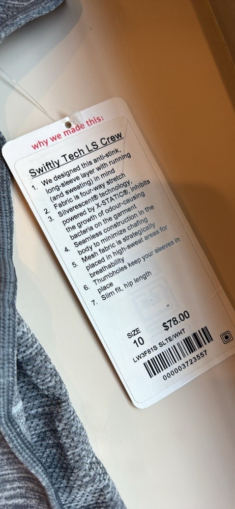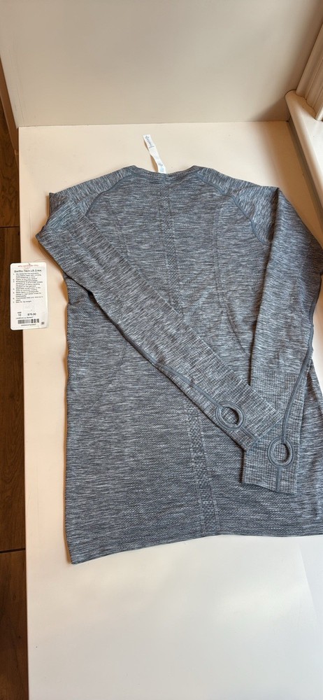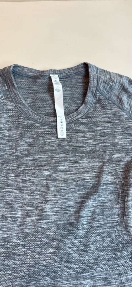 The Lululemon Women's Long Sleeve Swiftly Tech in size 10 is a stylish and functional activewear piece perfect for the active woman. Made with lightweight nylon material, this top features a solid gray color, long sleeves, a crew neck, and a pullover closure. Easy to care for with machine washable instructions, this top is ideal for summer, fall, and spring seasons. The Lululemon Swiftly Tech line ensures quality and performance, making it a versatile and comfortable choice for workouts or casual wear.