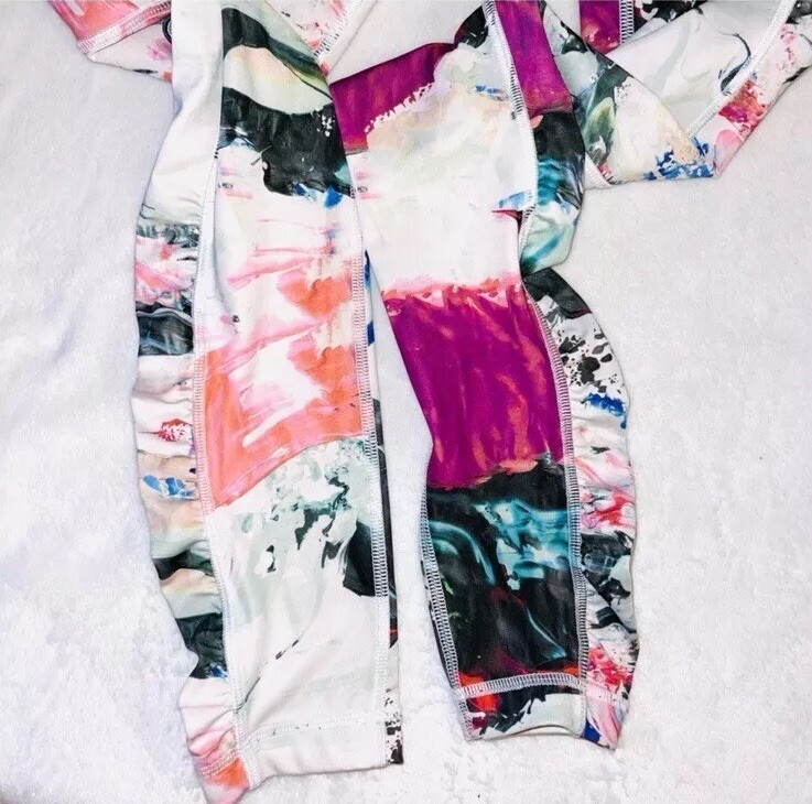 Full length Ruching at the hem Side pockets & pocket in the back top Waist 13” Length 38” Rise 8” Inseam 29”
