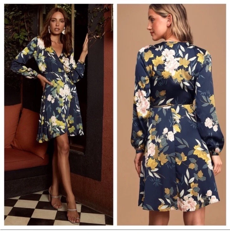 This elegant wrap dress by Lulus features a beautiful floral print in navy blue, perfect for any romantic occasion. The dress has a V-neckline with a pleated and ruffled accent, along with a layered and bowed closure. The long balloon sleeves and slimming design make this dress both stylish and comfortable. Made of high-quality polyester satin, this dress is machine washable and easy to care for. It comes in size XL and is suitable for various occasions such as weddings, holy communions, parties, and even casual and formal events. The dress has a short length and is perfect for summer, fall, and spring seasons. This dress is sure to make you feel like a princess on your next vacation or at your next party.