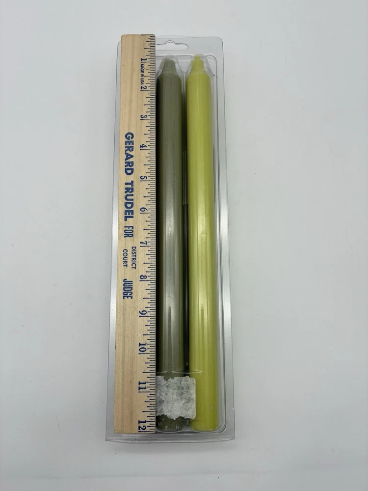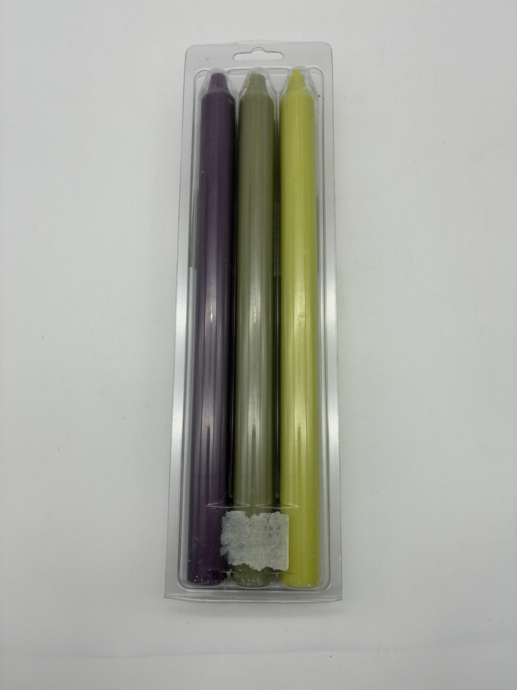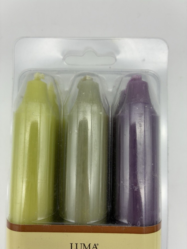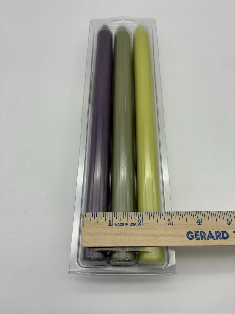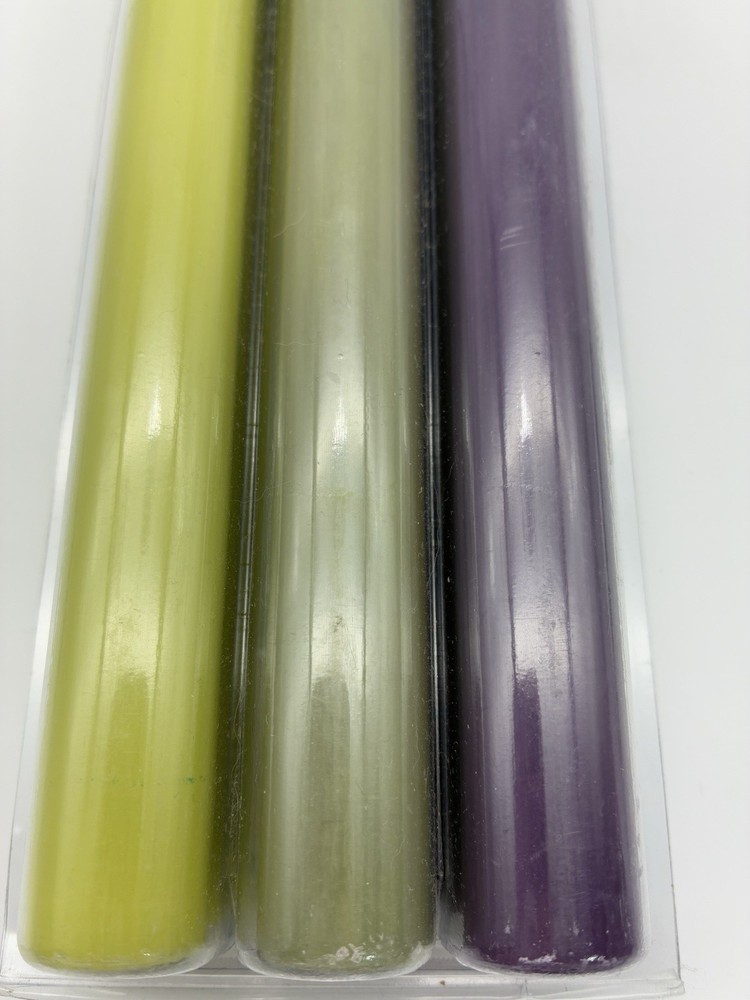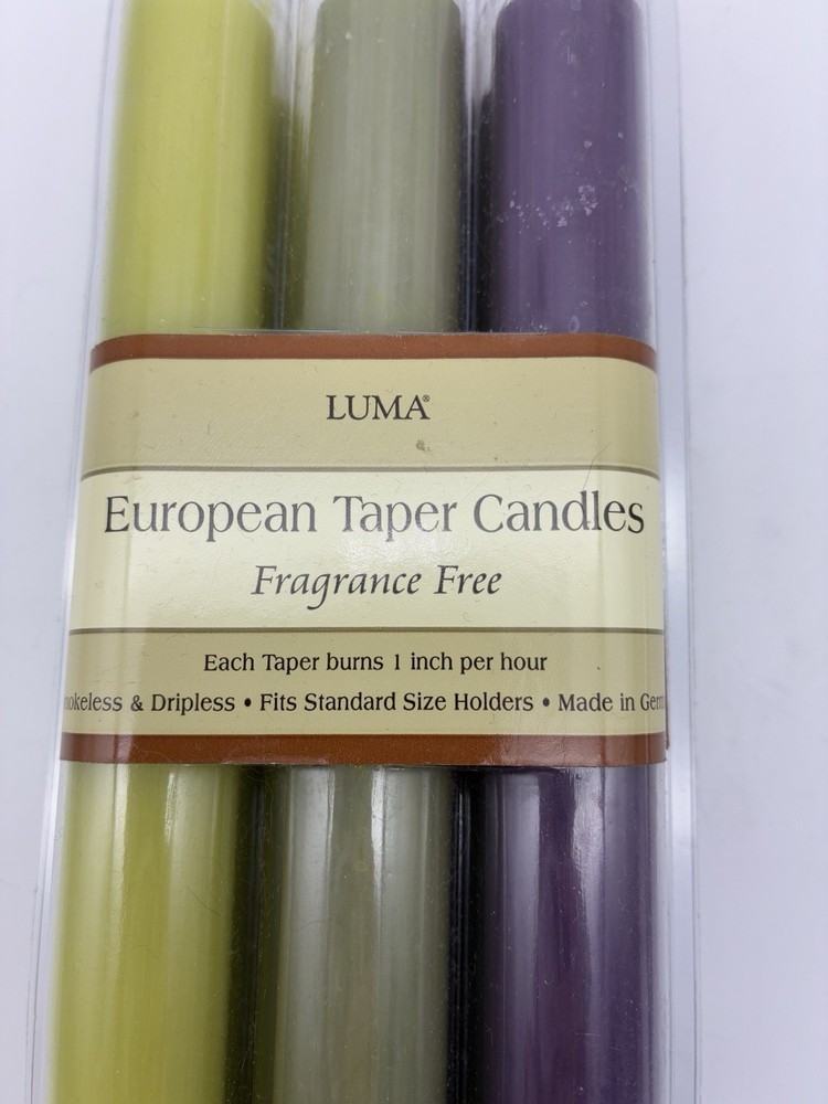 Luma European Taper Candles Set Of 6 Twelve Inch Candles Purple Green Lt Green. Condition is new. Shipped USPS Ground Advantage. • Burns 1 inch per hour • Dripless and smokeless • Fragrance free • Made in Germany • New in package, please see all photos