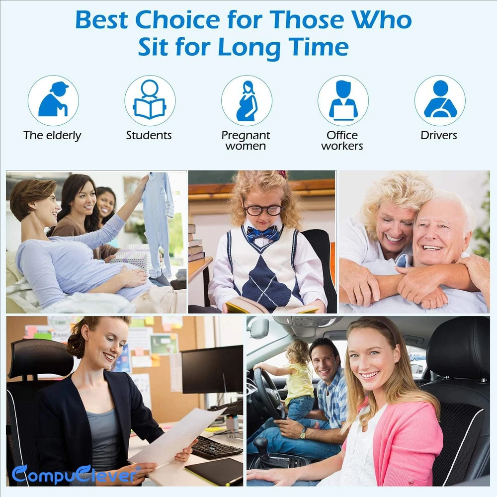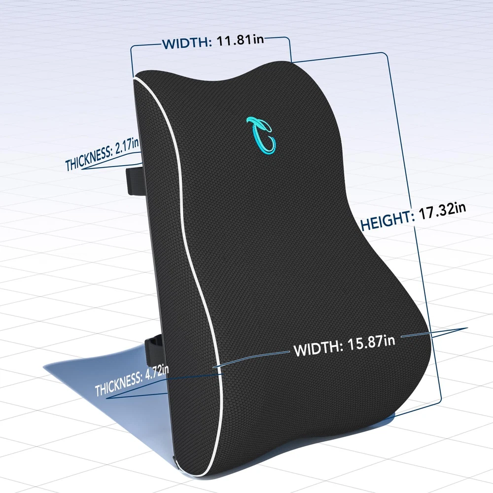 [Ergonomic Lumbar Back Support Pillow] - Alleviates Back Pain: lumbar support pillow is designed to relieve upper, mid and lower back pain or tightness, provide comfortable soft support for a health sitting posture, reduce spine pressure. This backrest is suitable for all types of people, even those weighing over 200 lbs. If you spend long-time sitting in office chair, gaming chair, desk or computer chair or driving in car or truck, this car seat back pillow will help you a lot. It is also recommended for surgery recovery and who suffers from Lumbosacral & Spondylosis [Premium Slow Rebound Memory Foam - Never Flatten] - The office chair back support features deluxe, high-density, durable and thick memory foam, which offers a firm and comfortable support while retaining its density. It can be used for a long time without deformation. The lower back pillow provides optimal lumbar support while sitting and leaning on chair back. Whether you're driving a car, sitting in a chair and watching TV, playing games, studying at desk, or working, our chair support pillow is specially designed to enhance your comfort and alleviate back pain [Updated 3D Mesh Cover- Breathable & Hypoallergenic] - We selected an updated 3D mesh fabric for removable and machine washable mesh cover. Smooth, not rough texture. It ensures excellent air circulation, keeping your back cool and dry long time. The car back pillow fabric can reduce sweat and is suitable for all seasons. Ideal for drivers, office ladies, gentlemen, teachers, students, wheelchair users and the elderly, and others who can benefit from a breathable lumbar support pillow, also be perfect as a pillow for couch, recliner, travel plane seat, train seat and so on [Two Adjustable Straps - Hold In Place] - EASY or Convenient to USE. Orthopedic backrest with two adjustable elastic straps ensuring back cushions stays on the seat without any slipping or sliding. Our back cushion features a designed curve and waist-embracing shape to provide continuous back support. You can take or carry it on any seat if you want. The two straps allow the backrest to fit perfectly on almost any office chair, computer chair, armchair, sofa, couch, car seat, SUV, Tesla, truck, wheelchair or recliner [Excellent Presents for Friends and Families] - This premium quality ergonomic lumbar support cushion is nice for friends, parents, office staff, drivers, and so on. We offer a 60-day return and refund policy for you at any time. Perfect presents for Mother's Day, Valentine's Day, 2024 New year for men and women, Father's Day, Birthdays, Thanksgiving, Christmas presents, etc. This lumbar support pillow and back support for car seat drivers is a thoughtful and heartwarming option for your loved ones. Please Note: 1. It is recommended to move your car seat back 1-2 inches when you use this lumbar pillow in your car. 2. If your upper back needs more support, please place the wider & thicker lower end upwards to upper back area. 3. If your seat surface is too small, it is not recommended to use this lumbar support. Because it is ergonomically designed to achieve a more comfortable experience, the bottom part of the back cushion has some thickness, which may occupy your seat area. 4. What you will receive is lumbar support pillows, the chairs in pistures are not included