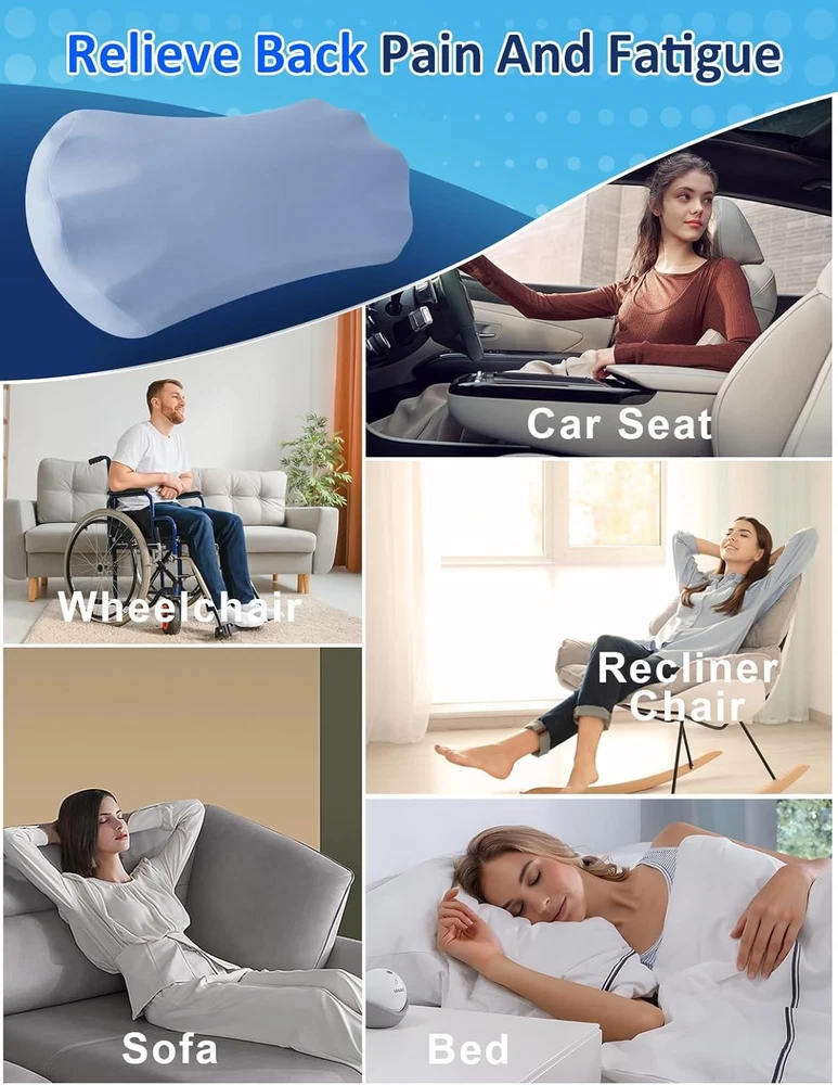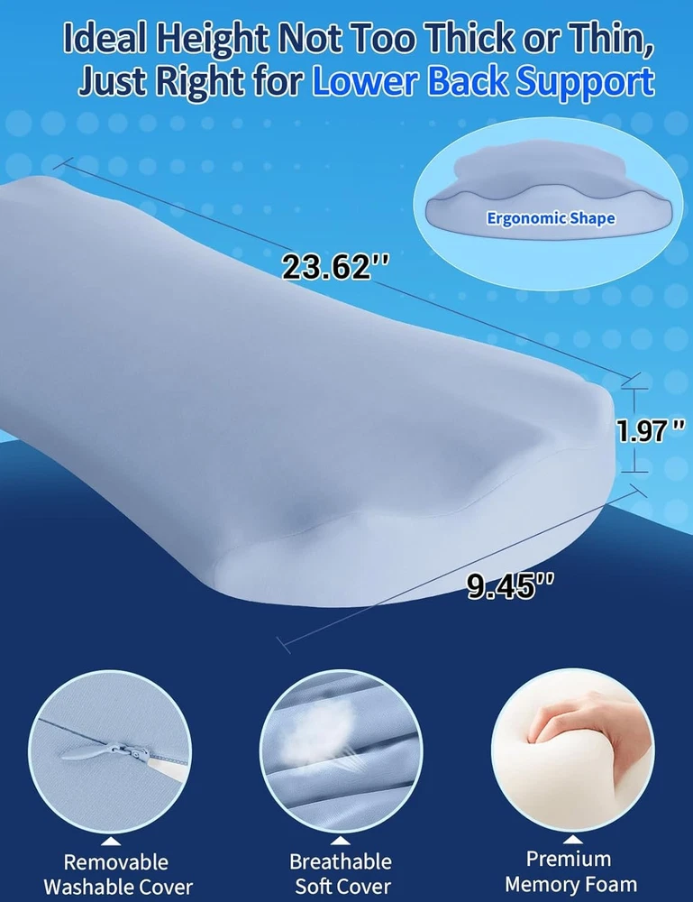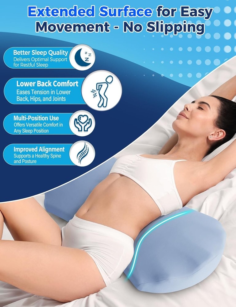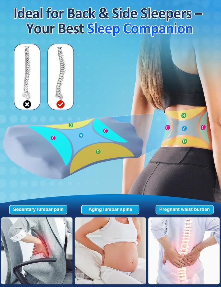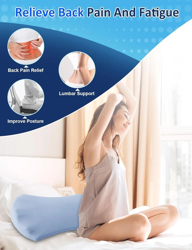 About this item 【All-Night Back Comfort for Side & Back Sleepers】– Designed as a lumbar support pillow for bed. Place it under your lower back to gently fill the gap between body and mattress for side & back sleepers, improving alignment and nightly comfort. 【High-Density Memory Foam】– Slow-rebound core contours to you and holds its lift all night, delivering steady lower-back support without collapsing. 【Breathable, Washable Cover】– Soft knit fabric with a hidden zipper; zips off for machine wash to keep your sleep setup fresh and hygienic. 【Versatile Bed Use】– Also be used under knees, under legs, under feet or as a leg elevation bolster to provide comfort and effective pain relief where you need it. Bed support pillow for back and side sleepers to provide lower back pain, hip pain, leg pain and joint pain relief. 【Natural Fit, Personalized Comfort】– We want to emphasize that while our pillow is designed to suit a wide range of preferences and needs, it might not be the ideal fit for all body types or comfort preferences. This is a common characteristic of products designed for ergonomic support and comfort. We encourage giving the pillow a fair trial period to adapt to its feel and support. 【Warm Tips】– This lumbar support pillow is made of medium-density memory foam and is designed for soft, cushioned support — not firm orthopedic correction. It offers mild elevation and is best suited for back or side sleepers looking for gentle lower back comfort.