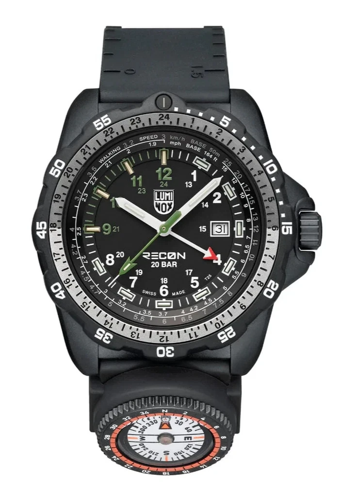 Description Engineered for precision, durability, and real-world tactical performance, the Luminox XL.8837.2 GMT Navigation Watch is built in collaboration with renowned tactical specialist Andrea Micheli . Designed for professionals who rely on accuracy in the field, this rugged 46mm timepiece combines advanced materials with mission-ready functionality. Crafted with an ultra-lightweight yet exceptionally strong CARBONOX™ case , the watch features a unidirectional rotating bezel with a two-tone aluminum ring insert for reliable timing and navigation. Its bold dial includes vibrant grasshopper-green indexes (9–12) and a matching second hand for enhanced visibility and standout styling. A scratch-resistant sapphire crystal with anti-reflective coating ensures clarity in all environments, while the 200-meter (660 ft) water resistance rating makes it suitable for swimming, diving, and extreme conditions. Powered by a Swiss-Made RONDA 515.24H quartz GMT movement , the XL.8837.2 allows you to track two time zones simultaneously , perfect for global missions, travel, or international operations. The black nitrile rubber strap includes integrated map scales, ruler markings , and even Morse code on the underside—plus a detachable compass —transforming the watch into a complete navigation instrument. Thanks to Luminox Light Technology (LLT) , this watch maintains a constant self-powered glow for up to 25 years , ensuring readability in total darkness. The XL.8837.2 is also part of Luminox’s sustainability initiative as a fully CO₂-neutral watch , compliant with Greenhouse Gas Protocol scopes 1, 2, and 3. Watch Details Model: XL.8837.2 Movement: Swiss-Made RONDA 515.24H Quartz (GMT + Date) Functions: Time, Date, GMT 2nd Time Zone Weight: 99g Swiss Made Sustainability: CO₂-neutral production (scopes 1, 2, 3) Technical Specifications Movement RONDA 515.24H Swiss Quartz GMT 2nd Time Zone + Date Constant glow technology (LLT) lasting up to 25 years Case Material: CARBONOX™ Size: 46 mm Thickness: 13.5 mm Water Resistance: 200 meters / 660 ft / 20 ATM IP Black 316L Stainless Steel Screw-on Case Back Uni-directional Rotating Bezel with Two-Tone Aluminum Insert Crown & Crystal IP Black Stainless Steel Protected Push/Pull Crown Sapphire Crystal with Anti-Reflective Coating Strap Black Nitrile Rubber Strap Includes Map Scales & Ruler Markings Morse Code on Back of Strap Width: 24 mm Comes with a Detachable Compass