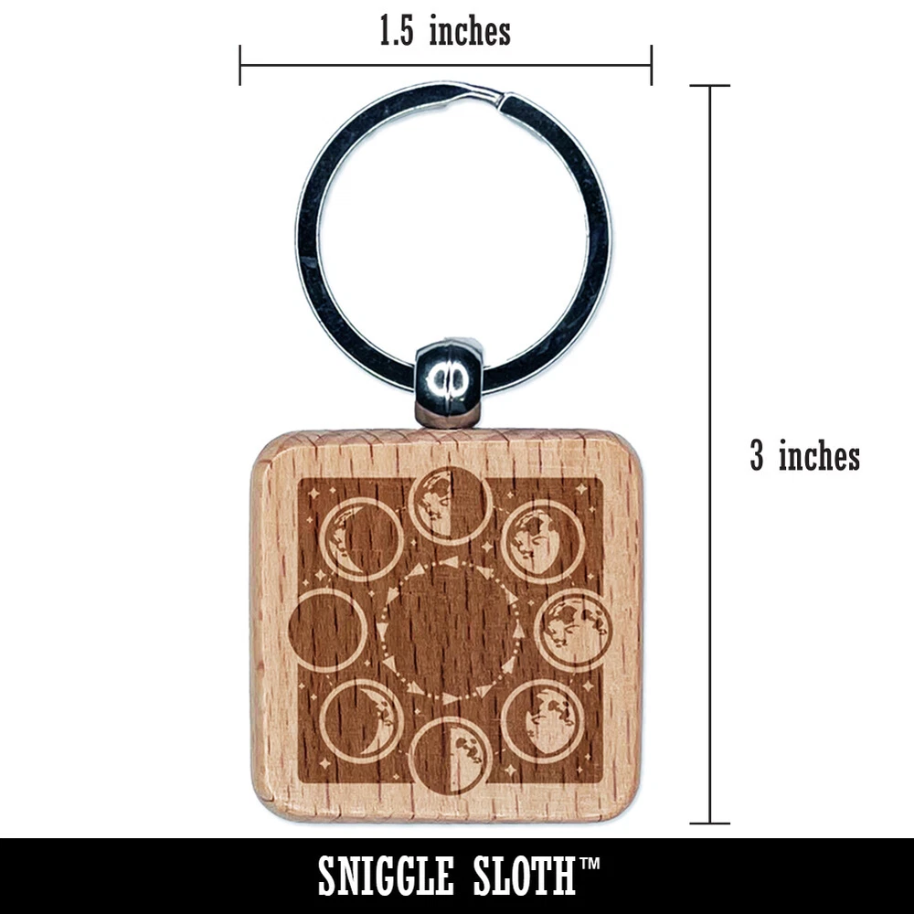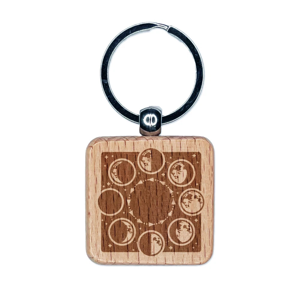 Lunar Moon Phases New Full Waxing Waning Engraved Wood Square Keychain Tag Charm