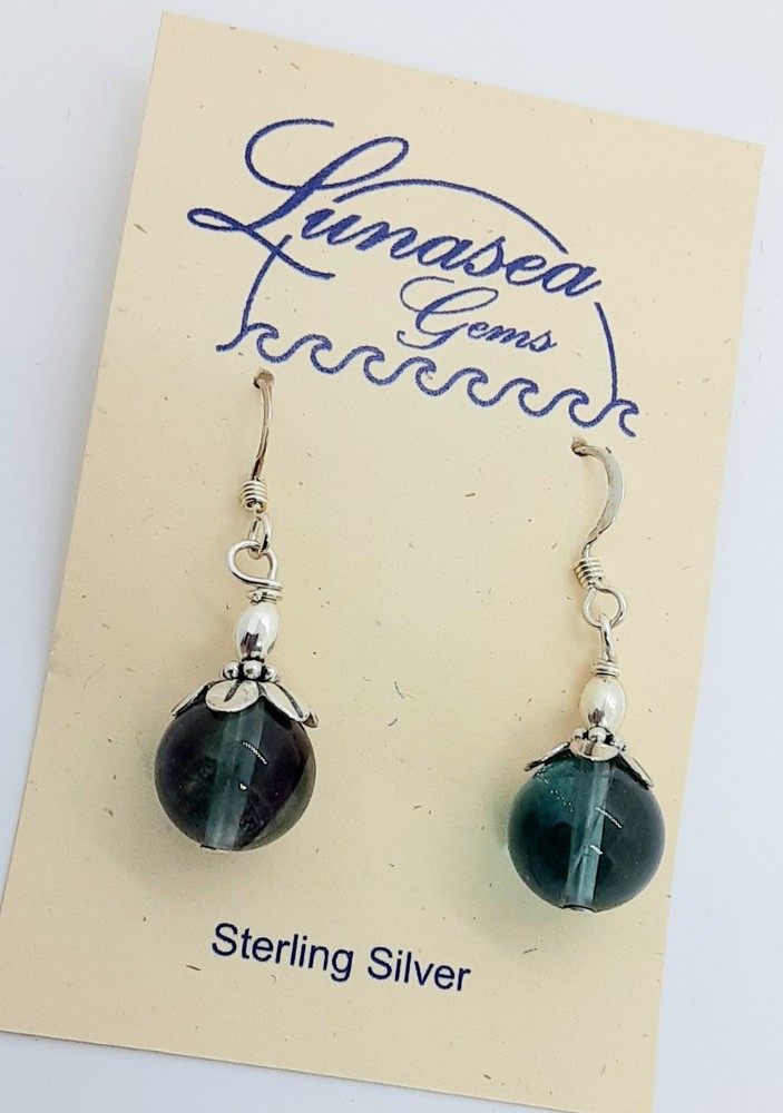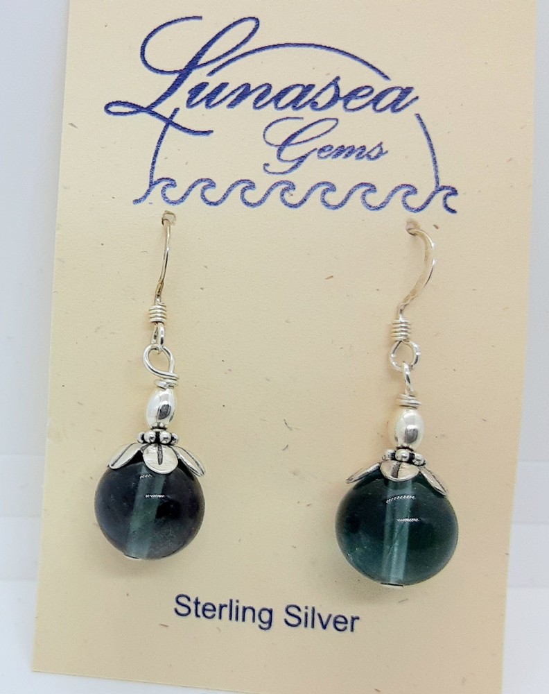 BEAUTIFUL FLUORITE & STERLING SILVER BEADED DANGLE EARRINGS. DESIGN INCLUDES A 12mm ROUND FLUORITE GEMSTONE BEAD TOPPED WITH STERLING SILVER 5mm RICE BEAD ALONG WITH A PRETTY STERLING SILVER FLOWER CAP & RONDELLE. EARRINGS HANG 3/4" FROM FRENCH EAR WIRES. SAFETY BACKS ARE INCLUDED. ALL FINDINGS ARE STERLING SILVER. ANOTHER GREAT PAIR FROM LUNASEA TREASURES of NEW ENGLAND. BE SURE TO CHECK OUT THE OTHER JEWELRY PIECES I HAVE LISTED.