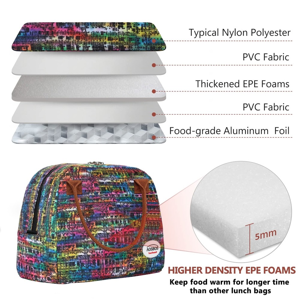 [ PREMIUM QUALITY ] - Our insulated lunch bag boasts scratch-resistant polyester material, sturdy zippers, and a reinforced handle. It's lightweight, tear-resistant, and built to last. [ EXCELLENT INSULATION ] - The food-aluminum foil lining, padded with thickened EPE foam, provides good insulation performance, ensuring that your food stays warm, cold, and fresh for longer than other lunch boxes bag or paper bags. [SPACIOUS DESIGN] - Measuring 11.8L x 6.5W x 8.2H, our lunch tote can easily accommodate a full meal for person, including bento boxes, drinks, fruits, and snacks. The front pocket is perfect for storing utensils, napkins [ HUMANIZED DESIGN ] - We've added convenient features to make carrying your lunch more comfortable. With side pockets on the side, you can keep your small items such as card, keys close at hand. Good after-sales service – We value your experience very much. If you have any questions about our products, please feel free to let us know and we will provide you with a solution within 24 hours Kind Reminder: THIS ITEM IS NOT INTENDED FOR USE BY CHILDREN 12 AND UNDER