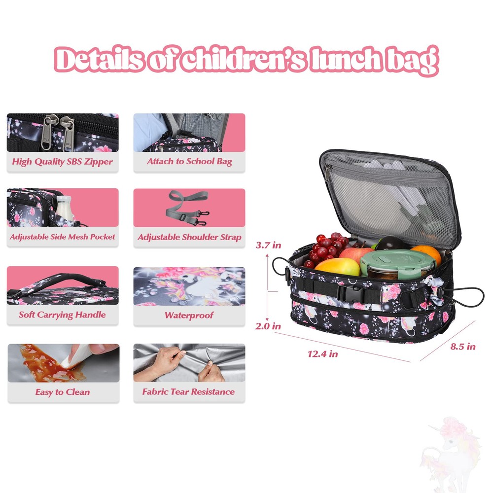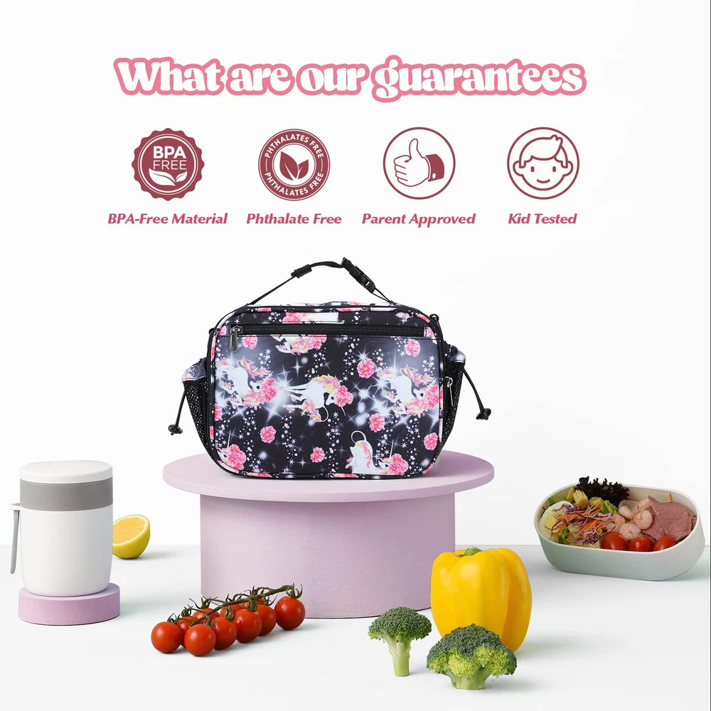 Description The lunch box is specially designed for children. With the concept of “smaller size but larger capacity”, this lunch box for is expandable and foldable. This insulated lunch bag prints with various vivid and interesting patterns. There are 7 kinds available.These reusable lunch box is suit for boys and girls.They could be used in various situation such as school, home, park and so on. Durable:lunch box uses high-quality nylon and SBS zipper.The high-quality SBS zipper used in the lunch box for makes it easy and smooth for children to use.Printed with various vivid and interesting patterns, making children's childhood full of joy.This durable lunch bag could be used in various situation such as school, home, park and so on.The recommended age grading is more than 3 years old. Insulated and Safe: lunch bag is made of thickened PEVA insulating liner and sponge, which is non-and BPA-free. This food-material is suitable for children to use. This lunch box can keep food and beverages at a constant temperature for up to 16 hours. Expandable & Foldable: With a reinforced zipper, top compartment of expandable lunch box can be easily expanded with a simple zipper action.The original measure is 12.4*8.5*3.7 inch (L*W*H),storing 6 L. And the expandable measure could be 12.4*8.5*5.7 inch (L*W*H),storing 9L, which can meet children’s different storing needs. Multi-Pockets: There are retractable mesh pockets on both sides of the lunch box for boys and girls, which can hold towels or small water bottles. There are pockets on the front and back of the reusable lunch bag, the front pocket can hold children's cutlery and the back pocket can hold keys, toy and note book etc. A zippered mesh pocket inside the bag could be used for snacks. Multiple Carrying Choices: Detachable and adjustable straps,handle,buckle,and hooks allow you to hold lunch bag by hand/shoulder.Or you can attach this lunch box to your backpack to keep your hands free.