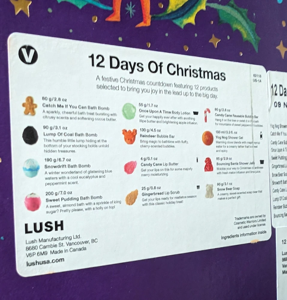 Lush Cosmetics Advent Calendar 12 Days of Christmas w/ 12 Bath Products SOLD OUT. New in package. Lush Cosmetics 12 Days of Christmas Advent Calendar. Sold out, limited edition item. Calendar is filled with 12 festive Lush products, including bath bombs, bubble bars and lotion. See last photo for details on what's included in the calendar. SKU: myclstSP1724L