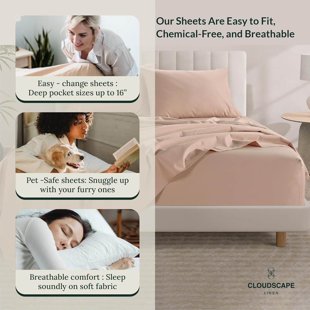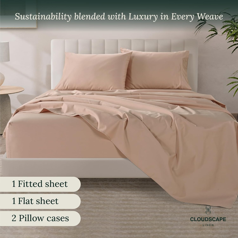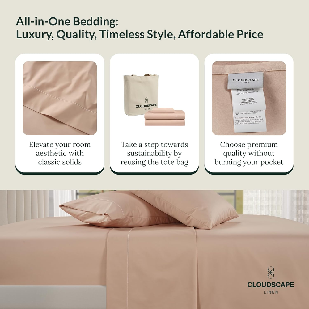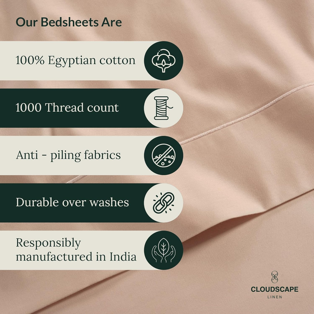Store New Arrivals Add to Favorite View Feedback Contact 100% Egyptian Cotton Sheets Queen Size - 4 Pcs, Sepia Rose Sheets Queen Size Set | 1000 Count Egyptian Cotton Sheets Queen Size | Hotel Luxury Bed Sheets Set Queen | Upto 17"Deep Pocket Queen Sheets Description Age Range Description Adult Seasons All Fitted Sheet Pocket Depth 17 Inches Weave Type Sateen Color Sepia Rose Pattern Solid Material Egyptian Cotton Sheets Queen Size Material Type Egyptian Cotton Sheets Queen Size Additional Features Cooling, Long Lasting, Fade Resistant, Deep Pocket, Shrink Resistant Theme luxury sheets queen size, high quality sheets queen size, luxury bed sheets, hotel quality sheets, queen sheet set egyptian cotton, 1000 count egyptian cotton sheets queen, best egyptian cotton sheets, queen egyptian cotton sheet set, 1000 thread count sheets queen, egyptian cotton sheets queen Style Name Modern Thread Count 1000 Occasion luxury bed sheets, hotel quality sheets, cotton sheets queen size set, egyptian cotton sheets queen size, cotton queen sheet set Included Components Pillowcase, Fitted Sheet, Flat Sheet Subject Character 100% Egyptian Cotton Sheets Queen Size Pillowcase Quantity 2 Product Care Instructions Machine Wash, Do not Bleach Size Queen EXPERIENCE SUPREME COMFORT AND LUXURY: Experience the Ultimate Comfort with our sepia rose 1000 thread count Egyptian cotton sheets queen size for your queen size mattresses. Treat yourself to unparalleled luxury with our premium 100% Egyptian cotton high thread count sheets queen size bed fitted sheets set. With a high 1000 TC egyptian cotton, these sheets offer a silky-smooth texture that promises a cozy and sumptuous night's sleep, offering a luxurious feel reminiscent of five-star hotel bedding. A COMPLETE 4 PIECE SEPIA ROSE QUEEN SIZE SHEET SET: This set comprises 1 deep fitted sepia rose queen sheet set of Egyptian cotton with deep pockets and fully elasticized edges measuring 61" x 81" + 16, ensuring a snug and secure fit on queen size mattresses. Accompanied by 1 flat sheet measuring 94" x 104" and 2 pieces, queen size Egyptian cotton sepia rose pillowcase measuring 20" x 30", luxury bed sheets are the perfect addition to your queen size bed for a restful night's sleep. LUXURY COOLING COMFORT: SILKY SOFT, BREATHABLE & DURABLE: Indulge in the perfect blend of comfort and durability with our glorious 1000 thread count sheets queen. Crafted from 100% Egyptian Cotton, these Deep pockets Egyptian cotton queen size bedding sets offer superior softness and smoothness. With a breathable sateen weave, they provide better airflow and temperature regulation for a cloud-like sleep experience. EFFORTLESS MAINTENANCE & EASY CARE: These 100% Egyptian cotton queen size sheets have strong stitching and are easy to maintain. Just wash them in cold water and dry them on low heat or delicate setting to keep them soft and high quality. Please note, that there may be a slight variance of up to +/- 5% in the thread count due to manufacturing process limitations. Our 1000 thread count cotton sheets are a popular gift choice pack on Christmas, Mother’s Day, Summer, and ThanksGiving. SUSTAINABLE, AFFORDABLE & CERTIFIED LUXURY: At Cloud Scape Linen, we are committed to Sustainable and ethically sourced practices with minimal use of chemicals in manufacturing. Our hotel quality sheets queen size cotton bed set and pillowcase sets are proudly OEKO-TEX certified and come packaged in a reusable fabric bag, reducing unnecessary waste and promoting sustainable practices. Product Description 4 PIECES, 1000 TC SEPIA ROSE 100% EGYPTIAN COTTON QUEEN SIZE LUXURY SHEETS EXPLORE MORE COLOR VARIETIES WITH THE LUXURIOUS QUEEN SIZE BED SHEET SET Customer Reviews 4.2 out of 5 stars 184 4.2 out of 5 stars 184 4.2 out of 5 stars 184 4.2 out of 5 stars 184 4.2 out of 5 stars 184 4.2 out of 5 stars 184 4.2 out of 5 stars 184 Price $88.99 $ 88 . 99 $79.39 $ 79 . 39 $88.40 $ 88 . 40 $88.99 $ 88 . 99 $79.49 $ 79 . 49 $84.99 $ 84 . 99 $88.99 $ 88 . 99 Material 1000 TC Egyptian Cotton Sheets 1000 TC Egyptian Cotton Sheets 1000 TC Egyptian Cotton Sheets 1000 TC Egyptian Cotton Sheets 1000 TC Egyptian Cotton Sheets 1000 TC Egyptian Cotton Sheets 1000 TC Egyptian Cotton Sheets Fits Sizes Fits Upto 17" Fits Upto 17" Fits Upto 17" Fits Upto 17" Fits Upto 17" Fits Upto 17" Fits Upto 17" Product Care Easy Machine Wash & Dry Easy Machine Wash & Dry Easy Machine Wash & Dry Easy Machine Wash & Dry Easy Machine Wash & Dry Easy Machine Wash & Dry Easy Machine Wash & Dry Fade and Stain Resistant Yes Yes Yes Yes Yes Yes Yes STANDARD 100 by OEKO-TEX Yes Yes Yes Yes Yes Yes Yes 100% Inspected & Certified ✔ ✔ ✔ ✔ ✔ ✔ ✔ DISCOVER MORE COLOR AND SIZE VARIETIES FROM 1000 TC EGYPTIAN COTTON BED SHEET Add to Cart Customer Reviews 4.2 out of 5 stars 184 4.2 out of 5 stars 184 4.2 out of 5 stars 184 4.2 out of 5 stars 184 4.2 out of 5 stars 184 4.2 out of 5 stars 184 4.2 out of 5 stars 184 Price $85.39 $ 85 . 39 $166.99 $ 166 . 99 $82.99 $ 82 . 99 $69.89 $ 69 . 89 $103.19 $ 103 . 19 — $103.99 $ 103 . 99 Material 1000 TC Egyptian Cotton Sheets 1000 TC Egyptian Cotton Sheets 1000 TC Egyptian Cotton Sheets 1000 TC Egyptian Cotton Sheets 1000 TC Egyptian Cotton Sheets 1000 TC Egyptian Cotton Sheets 1000 TC Egyptian Cotton Sheets Fits Sizes King Size Fits Upto 17" Split King Size Fits Upto 18" Full Size Fits Upto 16" King Size Fits Upto 17" Calking Size Fits Upto 17" Twin Size Fits Upto 15" Calking Size Fits Upto 17" Product Care Easy Machine Wash & Dry Easy Machine Wash & Dry Easy Machine Wash & Dry Easy Machine Wash & Dry Easy Machine Wash & Dry Easy Machine Wash & Dry Easy Machine Wash & Dry Fade and Stain Resistant Yes Yes Yes Yes Yes Yes Yes STANDARD 100 by OEKO-TEX Yes Yes Yes Yes Yes Yes Yes Number of Pieces 4 5 4 4 4 3 4 100% Inspected & Certified ✔ ✔ ✔ ✔ ✔ ✔ ✔ What exactly is 1000 thread count, and why is it important to consider when purchasing sheets? It Measures the number of threads woven in