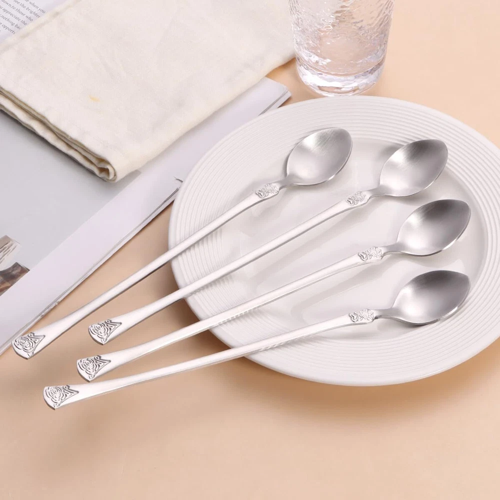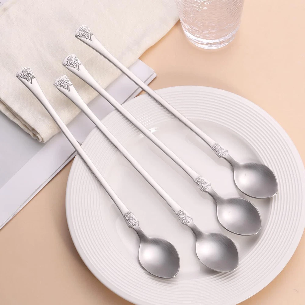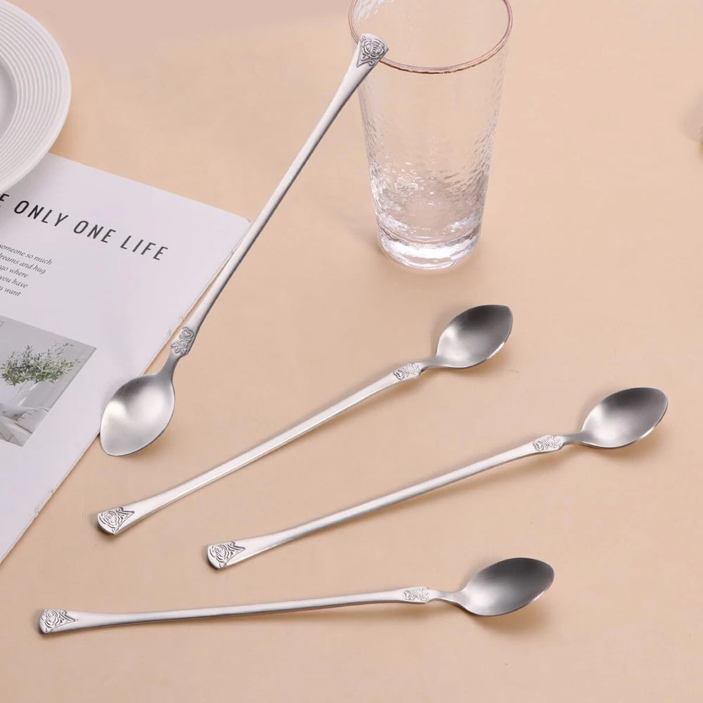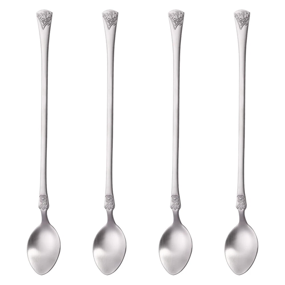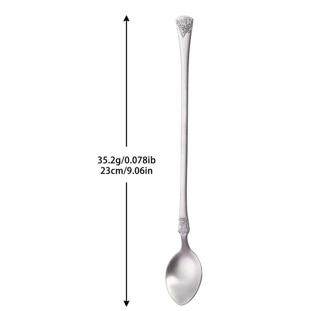 SET OF 4 ICE TEA SPOON: 4 pieces 9 inch long handle spoons, large quantity to meet various purposes of your daily life. Great for Bar, home, party use,daily use or special events QUALITY MATERIAL: Our ice tea spoons are made of food grade material 18/10 Stainless Steel with extra thick ergonomics handle,safety,Non-toxic and odorless and durable high-matte stain finish ATTRACTIVE DESIGN: Fashionable and unique, with creative designs featuring rose and heart patterns on the handles that are suitable for all daily mixing needs PERFECT LONG HANDLE: The classic straight tail thickened handle is convenient and comfortable grip, can directly lead to the bottom of Ice cream soda glass, sundae and dessert cup, milk shake, etc.Very suitable for digging food in the corners of deep jars and mango headed ice spoons DISHWASHER SAFE: Our long ice tea spoons have matte stain finished surface and smooth edge definitely no rough spot make them are easy to clean, can be directly placed in the dishwasher for cleaning, save your time HOW TO PACKAGE: Each product has an independent packaging bag, and all products are packaged in an exquisite gift box that can be used as gifts