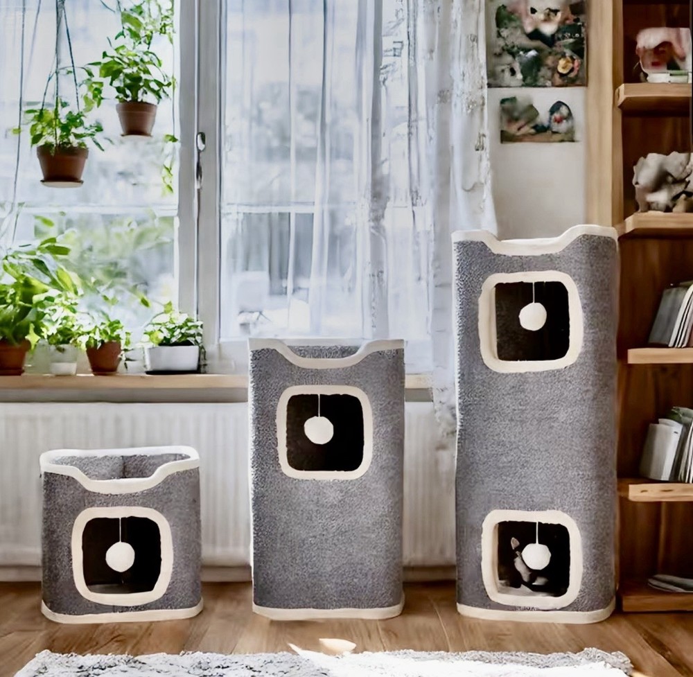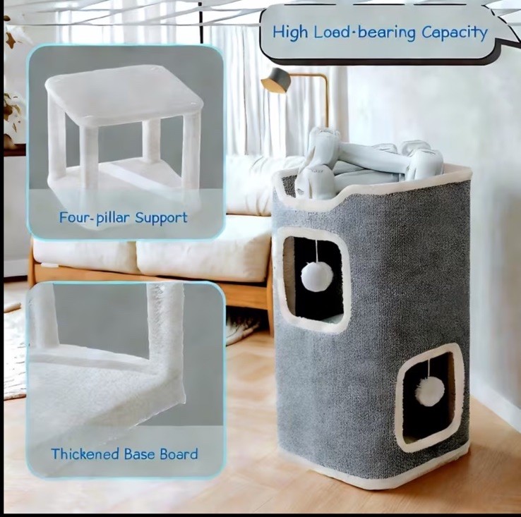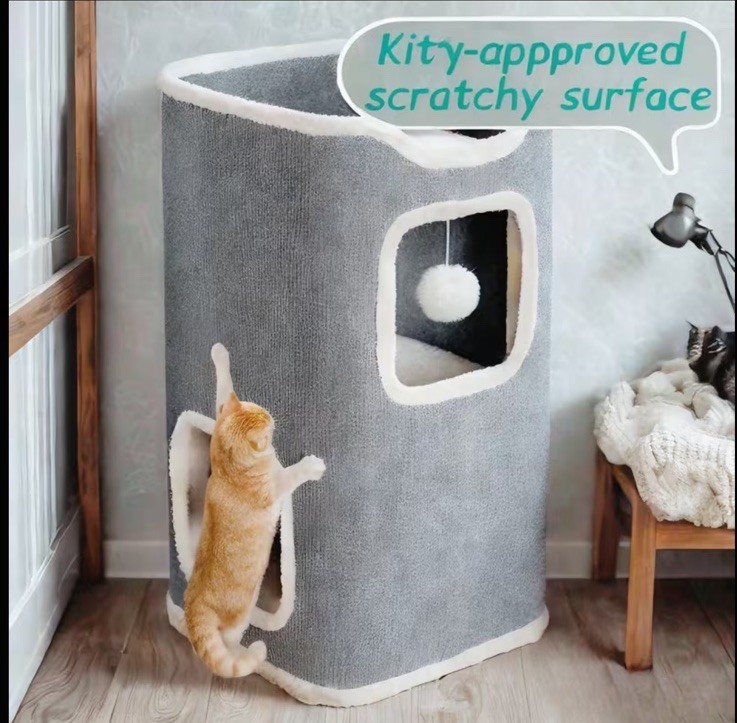 The Luxurious Cat Condo Duplex is a stylish and spacious cat condo designed for ultimate feline comfort. Made with soft carpeting material, this duplex condo provides a cozy and safe environment for your beloved pets to relax and play. The carpeting material adds a luxurious touch to the overall design, making it a perfect addition to any pet-friendly home with 2 Floors
