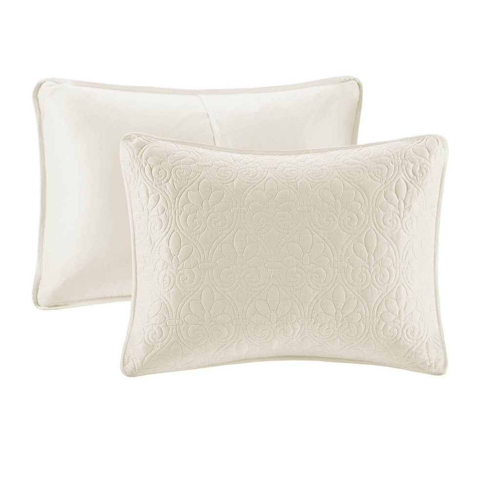 The Madison Park Quebec Reversible Coverlet Set offers a charming cottage-inspired update to your bedroom. The coverlet and shams (1 in Twin/TwinXL) flaunt a classic stitch pattern that creates a rich depth and texture on the face of the bedding set. Prewashed cotton filling provides added comfort and durability making it the perfect for use in the summer or as a layering piece in the winter. FEATURE Soft microfiber fabric in dusty ivory all over floral pattern quilting Set includes: 1 coverlet, 2 standard shams Face: 100Percent polyester filling: 100Percent cotton Measurements: 90-by-90-inch coverlet, 20-by-26-inch standard shams Machine washable