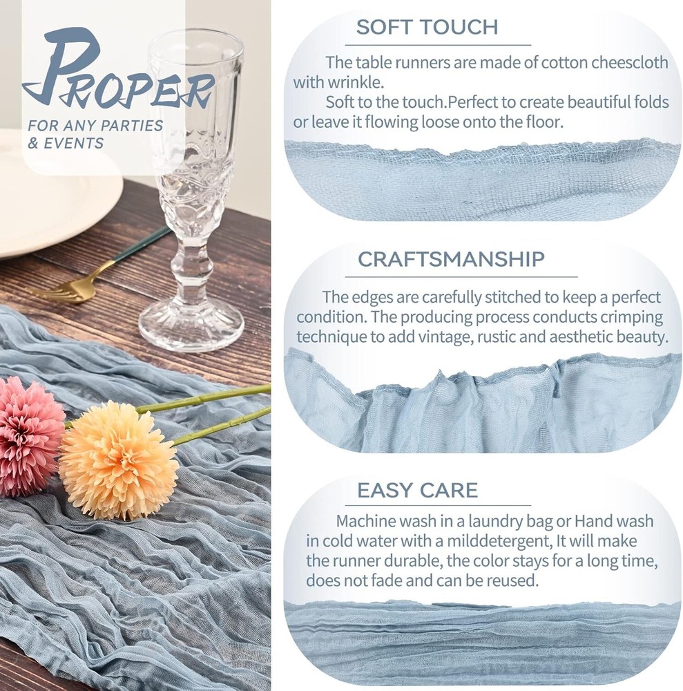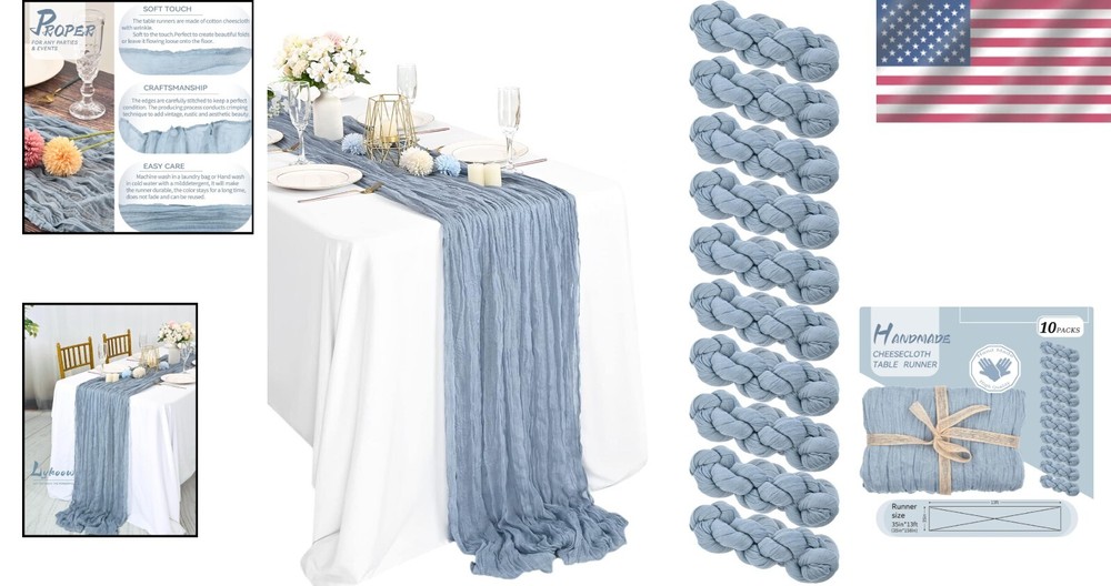 Luxurious Hand-Dyed 10 Pack Table Runners - Dusty Blue Cheesecloth for Weddings ‹ › ‹ › ‹ › ‹ › ‹ › ‹ › ‹ › ‹ › ‹ › Luxurious Hand-Dyed 10 Pack Table Runners - Dusty Blue Cheesecloth for Weddings Transform your events into stunning displays of elegance with our exquisite 10 Pack of Dusty Blue Cheesecloth Table Runners. Each runner, meticulously crafted from soft cotton and linen, measures approximately 35" wide and 13 feet in length, making them perfect for both rectangular and round tables. Features: Includes 10 packs of Dusty Blue cotton and linen gauze table runners. Each runner measures 157 inches long - ideal for diverse table shapes. Perfect for wedding arches, table settings, chair belts, curtains, and home decor. Made from soft, reusable, washable, and fade-resistant cheesecloth. Unique wrinkled texture offers an elegant and rustic appearance. Easy to care for; machine washable or hand wash with mild detergent. Guaranteed high quality with long-lasting color retention. Benefits: Elevate your special occasions with luxurious, hand-dyed table runners. Create stunning, flowing designs with ease. Versatile enough for every occasion, from weddings to dinner parties. Effortless maintenance with no ironing needed, preserving the wrinkled texture. Why Choose Our Cheesecloth Table Runners? Are you searching for the perfect finishing touch to enhance your event decor? Our Luxurious Hand-Dyed Cheesecloth Table Runners are designed to embody elegance and rustic charm, making them the ideal embellishment for weddings, bridal showers, and more. With a promise of high quality and satisfaction, our table runners maintain their beautiful color and texture even after repeated use. Don’t compromise on style; let our Dusty Blue Cheesecloth Runners be the highlight of your special occasions. Order your set today and indulge in the art of beautiful gatherings! Shipping Free & Fast Shipping - We offer free shipping to most of the USA with a normal delivery time of 3-7 days. However, due to the current situation, additional delivery time (up to 3 weeks) may be required for some items. Alternative Carriers - We may use alternative carriers (e.g. USPS, FedEx, UPS, etc.) to ensure your package arrives safely and on time. Due to the use of multiple carriers, we are unable to provide a tracking number automatically. Handling Time - Orders are processed and shipped within 1-2 business days of receiving cleared payment. Shipping Restrictions - Shipping to Alaska, Hawaii, Puerto Rico, Guam, and other US territories may incur shipping charges or delivery restrictions. Please contact us before ordering, or your order can be refunded/cancelled. State Restrictions - There may be restrictions based on your state of purchase. For example, certain items may not be shipped to California due to state regulations. Contact for Tracking Updates - If you require tracking updates or have any concerns about the delivery of your order, please feel free to contact us, and we will be happy to assist you. Return 30-Day Hassle-Free Returns - We want you to be completely satisfied with your purchase. If you are not, you can return the item within 30 days of receiving it for a full refund or exchange. Easy Return Process - To start a return, simply contact us and we will provide you with a prepaid return shipping label and detailed instructions. Restocking Fee - There are no restocking fees for returns. However, the buyer is responsible for return shipping costs if the return is not due to a seller's error. Refund Processing Time - Refunds will be processed within 5 business days of receiving the returned item in its original condition. Payment We accept all major credit cards, PayPal, and Apple Pay for your convenience. Your payment information is secure and encrypted to ensure a safe and seamless transaction. Please complete your payment within 3 days of purchase to avoid any delays in shipping. Feedback Your feedback is extremely important to us. We strive to provide the best products and customer service possible. If you are satisfied with your purchase, please take a moment to leave us a positive review. If you have any concerns or issues with your order, please contact us before leaving negative feedback. We are committed to resolving any problems and ensuring your satisfaction. Contact Us If you have any questions or concerns, please feel free to reach out to our customer support team. You can contact us through the eBay messaging system. We are available Monday to Friday, 9:00 am to 5:00 pm EST, and we will do our best to respond to your inquiry within 24 hours. Buy it now and enjoy a pleasant shopping experience! UPC: Not Set Unit Quantity: 10 packs Material: Cotton,Linen,Cheesecloth,Gauze,Polyurethane (PU) Theme: Not Set Occasion: Christmas,Valentine's Day,Wedding,Bridal Shower,Engagement Banquet,Birthday Parties,Ceremony,Dinner Party,Tea Party,Bachelorette Party,Thanksgiving,Special Occasions Features: Machine Washable,Reusable,Washable,Fade Resistant,Wrinkled Texture,No Ironing Required Department: Adults,Unisex Character: Not Set Brand: Unbranded Color: Dusty Blue Type: Table Runner Pattern: Solid Style: Rustic Shape: Rectangle MPN: Not Set Country/Region of Manufacture: Not Set Item Length: Not Set Character Family: Not Set Item Width: Not Set Model: Not Set Unit Type: ft Care Instructions: Not Set Personalize: Not Set