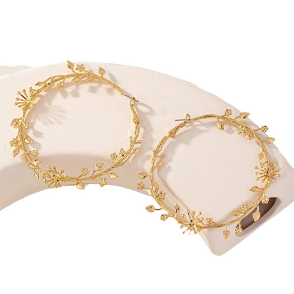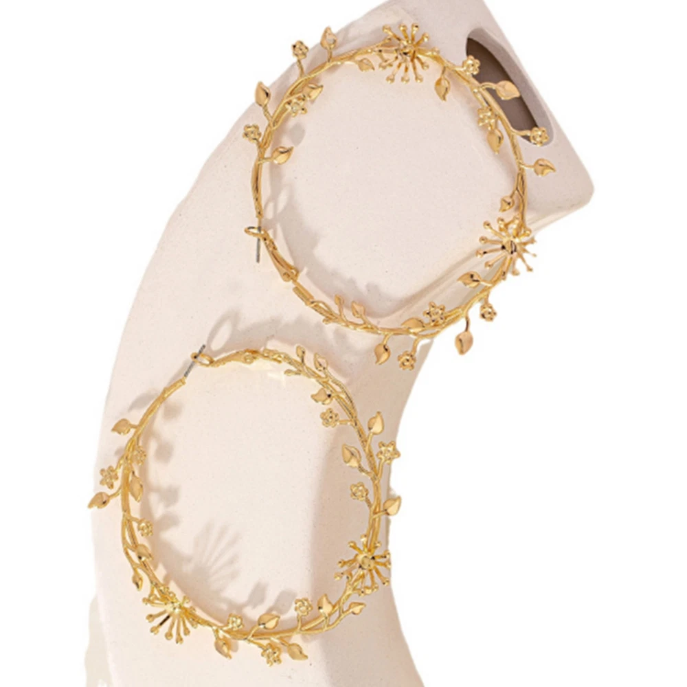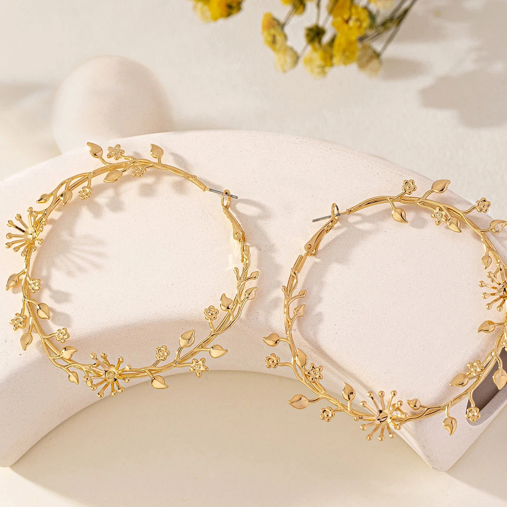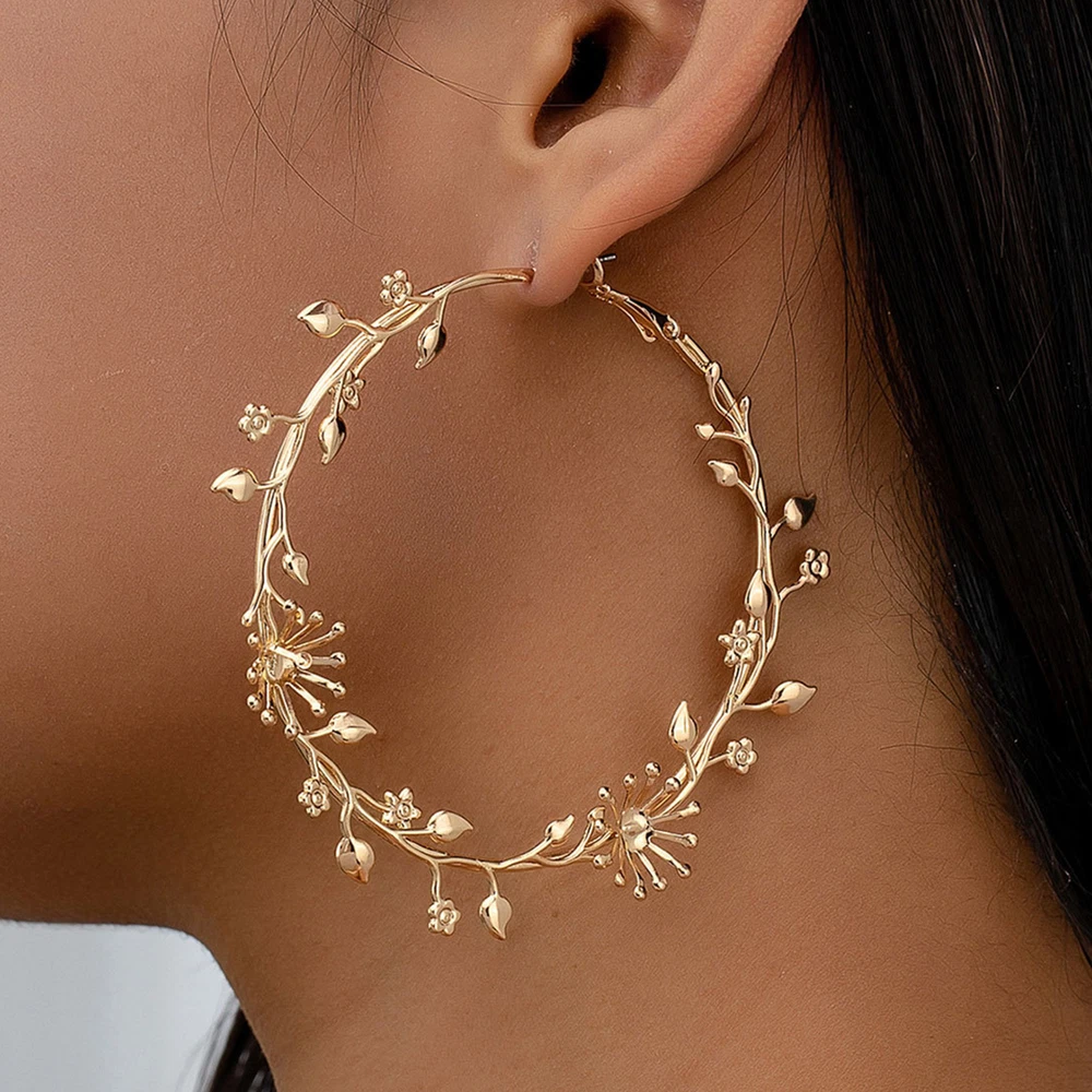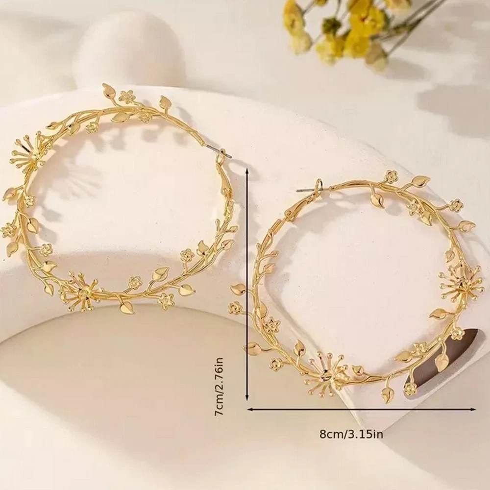 Luxurious Large Vintage Floral Vine Hoop Earrings Golden Circle