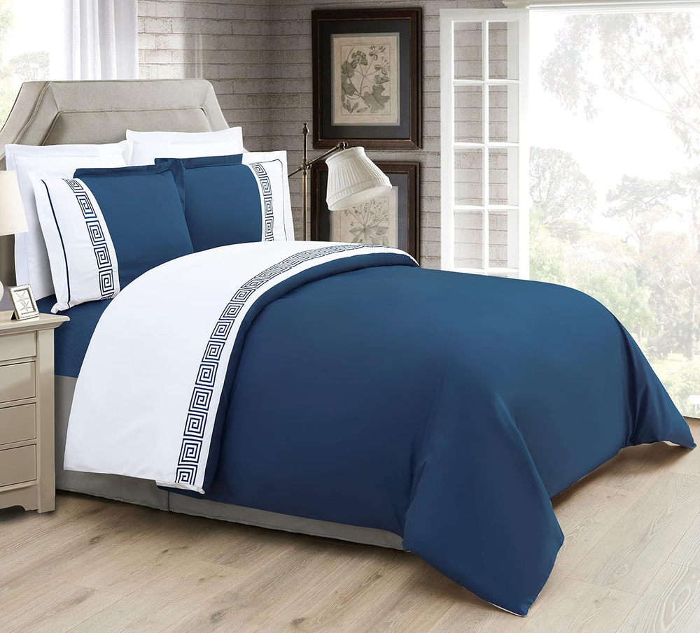 Included Components: Pillow Sham gtin13: 313104133124 Item model number: 75RW-GREEK-DVT-K-Navy Batteries required: No Unit Count: 1.0 Count Style: Elegant Closure Type: Button Pillowcase Quantity: 2 Theme: embroidery Item dimensions L x W x H: 8 x 3 x 8 inches Special Feature: Hypoallergenic Size: Does not apply Country of Origin: China Fabric Type: 100% Microfiber Product Care Instructions: Machine Wash, Do Not Bleach, Do Not Iron, Hand Washable, Low Stea Brand: Does not apply Color: Navy Blue/White Type: Does not apply Thread Count: 1500 Pattern: Solid UPC: 313104133124 Age Range (Description): Adult Item Weight: 3 pounds Product Dimensions: 8 x 3 x 8 inches Seasons: All, Winter, Summer, Spring Number of Pieces: 3 Material: Microfiber Sham Quantity: 2