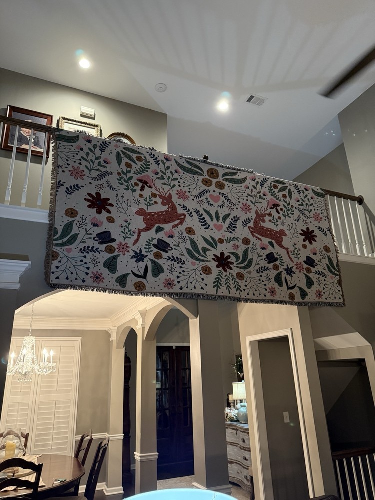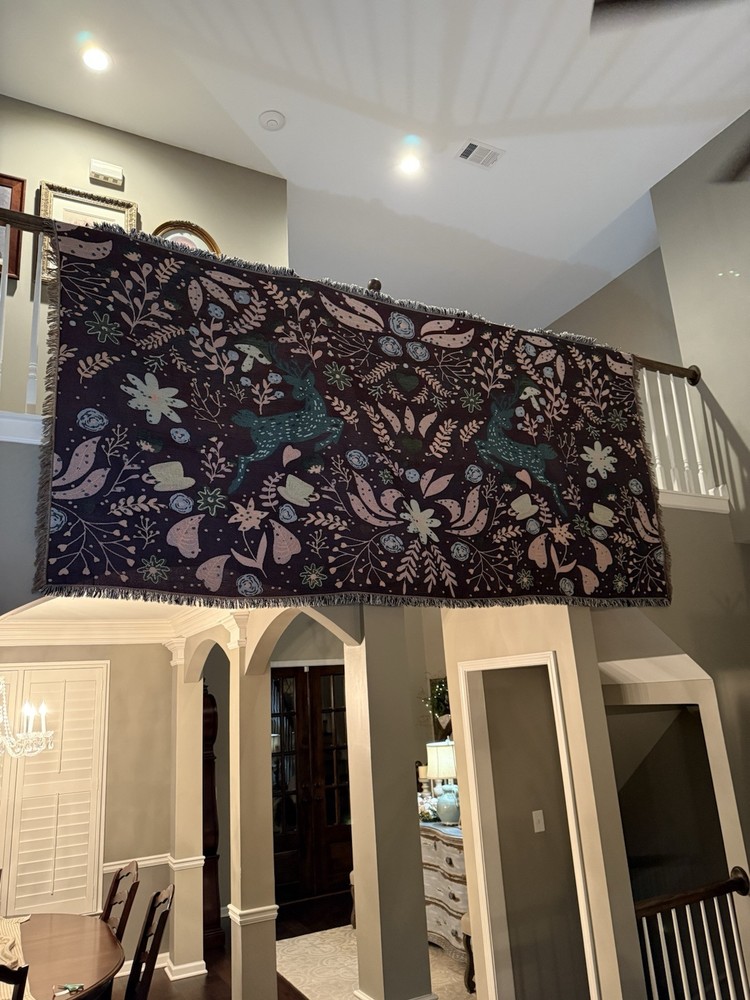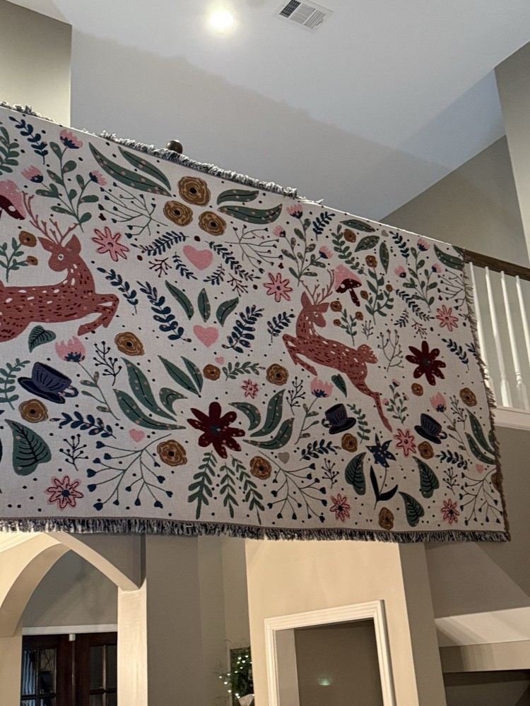 Woven Jacquard Throw Blanket (11 Ft x 5 Ft) Pre owned condition VERY large and VERY heavy • It features a pattern with deer, flowers, hearts, and teacups. • It's made of woven cotton with tasseled edges. • It can be used as a throw blanket, sofa cover, or décor. • It is suitable for all seasons. • It is machine washable.
