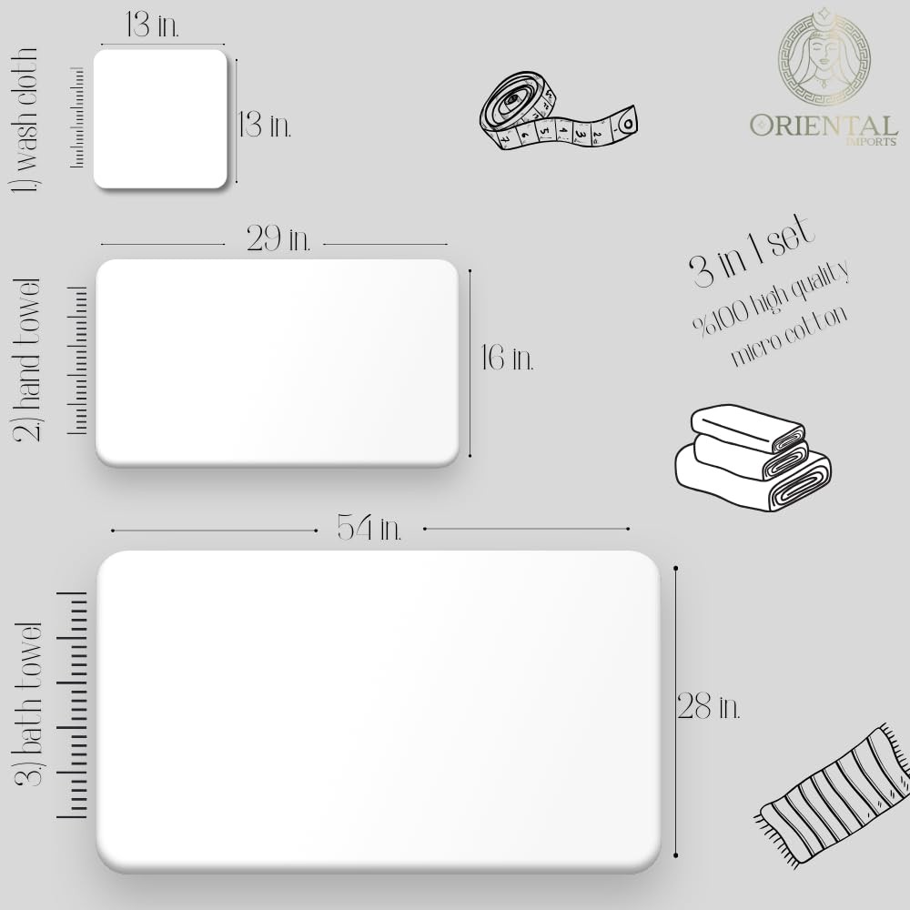 Package Included : - if you choose the ''set of 3'' : 1pc. Bath Towels(28x54inch), 1pc. Hand Towels(16x29inch), 1pc. Washcloths(13x13inch) - if you choose the ''set of 2'' : 2pcs.Washcloths(13x13inch) Towels features : Oriental towel sets for bathroom clearance are manufactured skillfully with 100% Turkish micro cotton making the towels ultra soft and highly absorbent. The premium quality of the bathroom towel set is meant to give a soft and delicate feel to your providing the care your skin desercroves. Usage Areas : Oriental Towels offers a luxurious experience and feel. The towel set is versatile and can be used in the bathroom at the beach, in the kitchen, at the poolside, at the spa. Care Instructions : - Wash the towels at around 30 degrees to preserve them for a long time and keep them soft. - Do not use bleach: Avoid using bleach, fabric softener, chemical, or iron on the towels. High Quality: 100% Turkish micro cotton ''set of 3'' : 1pc. Bath Towels(28x54inch), 1pc. Hand Towels(16x29inch), 1pc. Washcloths(13x13inch) ''set of 2'' : 2pcs. Washcloths (13x13inch) Care Instructions : - Wash the towels at around 30 degrees to preserve them for a long time and keep them soft. - Do not use bleach: Avoid using bleach, fabric softener, chemical, or iron on the towels.