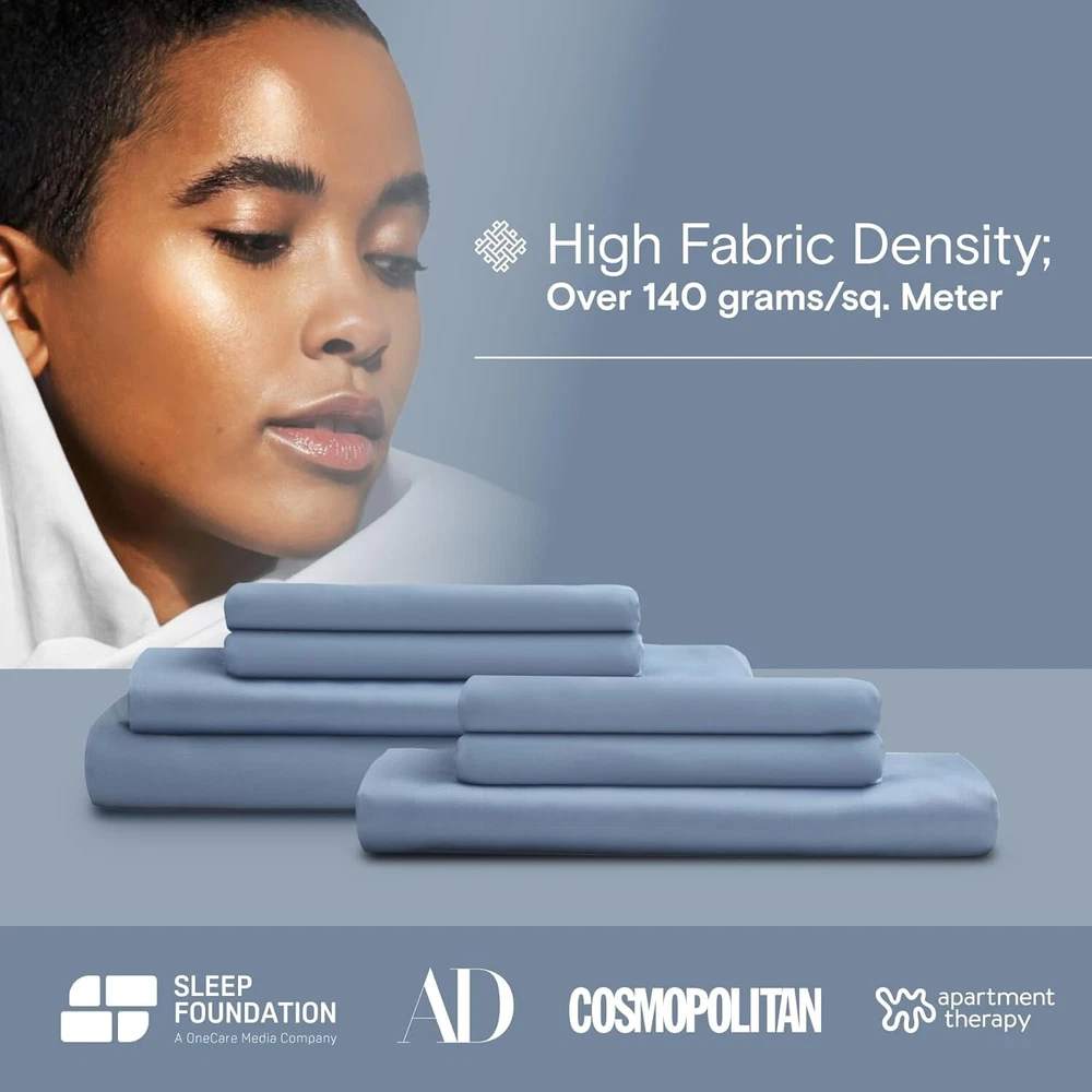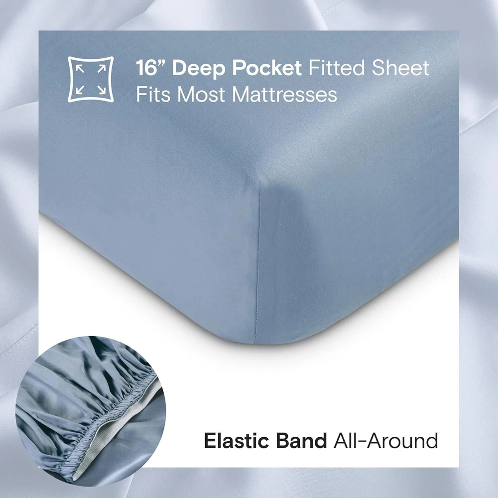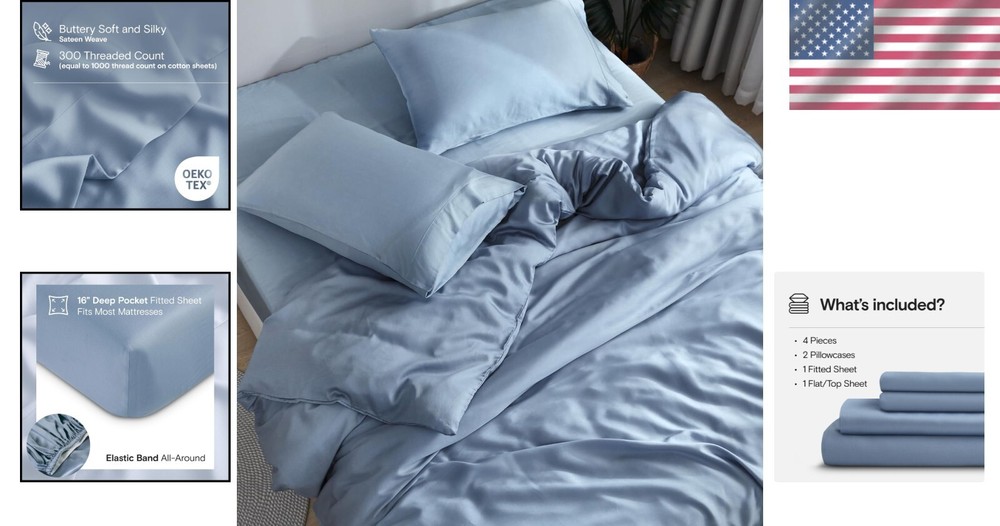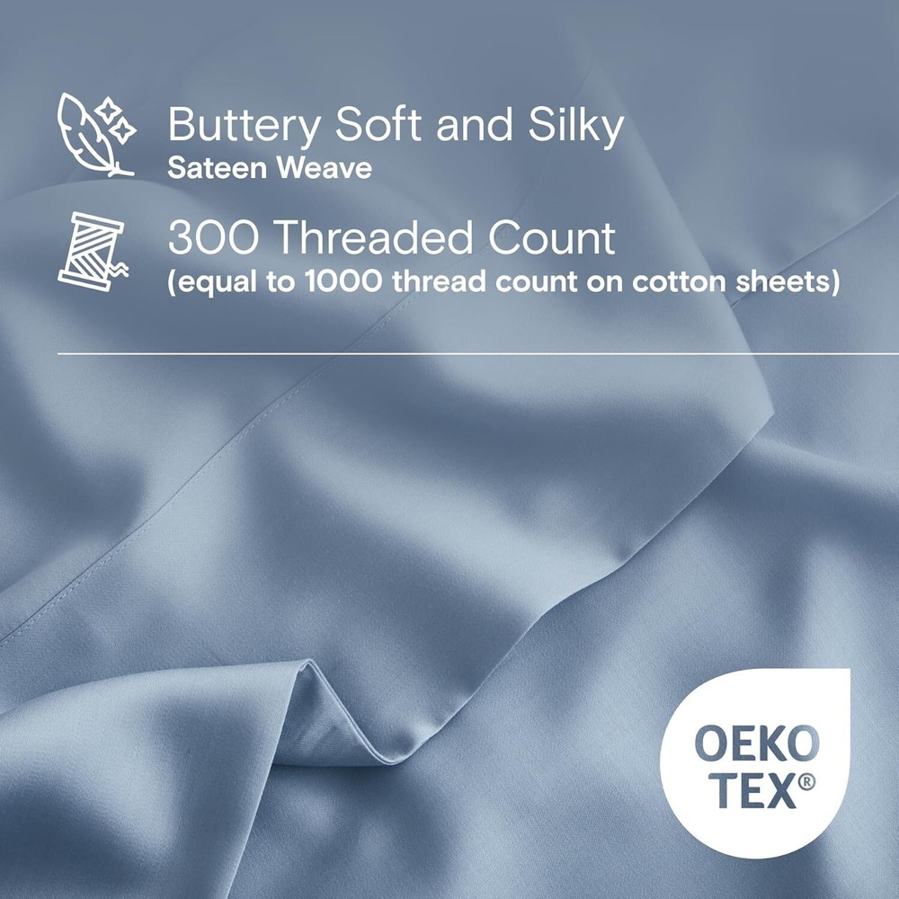 Unit Count: 4.0 Count Shape: Rectangular Features: Hypoallergenic, Cooling, Breathable, Deep Pocket, Lightweight GSM (Grams per Square Meter): Over 800 gtin13: Does Not Apply Pattern: Solid Fitted Sheet Pocket Depth: 16 Inches Item Weight: 5.92 Pounds Pillowcase Quantity: 1 Seasons: All Room: Bedroom Size: California King Product Care Instructions: Tumble Dry Color: Sky Material: 100% Viscose, Derived from Bamboo, Rayon Thread Count: 300 Theme: Solid Color Type: Sheet Set Closure Type: Pull-on Pillowcase Length: 29 Inches Style: Modern Number Of Pieces: 4 Department: Adults UPC: Does Not Apply Care Instructions: Tumble Dry, Machine Wash Included Components: Pillowcase, Fitted Sheet, Flat Sheet Age Range (description): Adult Package Dimensions: 14.84 X 11.57 X 4.29 Inches Weave Type: Sateen Brand: Unbranded
