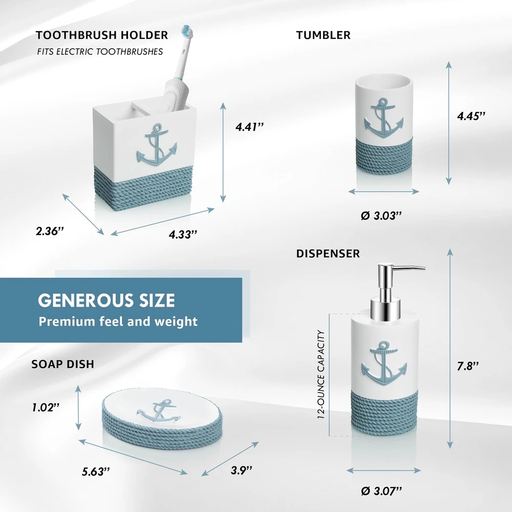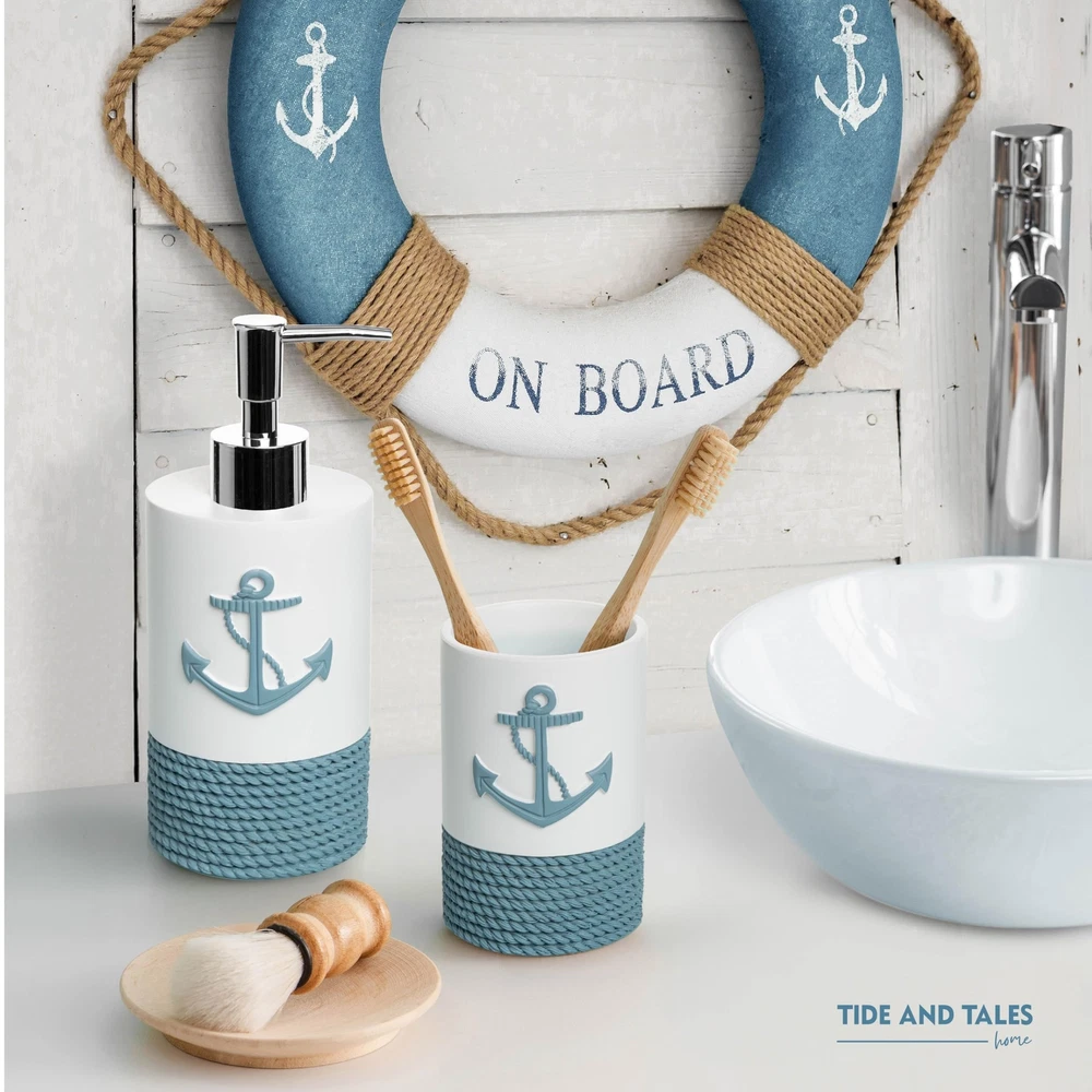 TideAndTales Luxury Nautical Bathroom Accessories Set (4 Piece) Rope and Anchor Beach Bathroom Decor with Ocean and Sea Theme Design, Countertop Coastal Soap Dispenser Set 4 Piece Bath Accessory Set with Nautical Theme: Smooth and heavy to touch, with textured rope design, including countertop essential items: a lotion dispenser/ soap pump, toothbrush holder, tumbler and a soap dish. Coastal Dreaming: Bring the spirit of the ocean home with this luxury set incorporating the anchor and rope nautical motifs. Carefully crafted with exquisite detail to enhance the serene relaxing feel of any bathroom. Modern Design And Quality: Soft Mediterranean tones and a smooth matte finish are ideal for coastal homes, lake houses, beach bathroom decor, and any nautical or marine theme interiors. Leak-proof Assured, Easy To Clean and Maintain: Each piece is crafted from durable materials for long lasting use and effortless care. Enhanced quality checks to prevent leaking. Gift Ready: This classy set of coastal bath accessories qrrives in a stylish box, ready to give to your seaside loving friends or family. SHIPPING Domestic Buyers - We have confidence in our products, but if you are not fully satisfied please contact us within 30 days of purchase and you will get full refund. - We ship within 3 business days of payment, usually sooner - We offer FREE shipping on all orders! - We only ship to the lower 48 states, no APO/FPO addresses or PO Boxes allowed International buyers – please note: Import duties, taxes, and charges aren't included in the item price or postage cost. These charges are the buyer's responsibility. - Please check with your country's customs office to determine what these additional costs will be prior to bidding or buying. * Order Cancellation Policy ** You can return a product for up to 30 days from the date you purchased it. 1. The seller reserves the right to cancel the special case only due to eBay cancellation fee. 2. The decision of seller is the final. 3. The seller will respond to the cancellation request within 2 business days. Please wait for the result of cancellation. 4. In case the cancellation is not completed by some reasons, the buyer can follow the options below to get the refund. 4.1 The buyer can reject the item when it arrives. 4.2 The buyer can send the item back to the seller within 30 days If the buyer receives item (USA Shipment ONLY). The seller will provide the FREE return label to the buyer when the buyer opens " Return Item" case on eBay by using the reason as "Change my mind" ONLY. 5. When buyer has placed the order. The order will be processed and completed by automatic warehouse system within 5 minutes. In case that buyer sends the cancellation request after 5 minutes of placing the order, the request will be rejected. **Sending direct message to cancel the order is not allowed for every case.* Return Policy For the return case - If buyer would like to return the items for refund or replacement, please CONTACT SELLER to receive the free return label from seller. The refund or replacement will be processed with the tracking number of return label which is provided by seller only. The other ways of return which are not approved by seller will not be processed for the refund or replacement.
