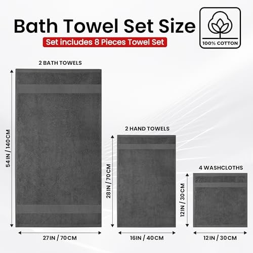 Return Policy Fast Delivery Trusted seller Luxury 100% Cotton Towel Set – 8 Piece Bathroom Towel Set (2 Bath Towels, 2 Hand Towels, 4 Washcloths) – Soft & Absorbent Towels for Bathroom (Shadow Grey) f Product Description Bath Towel Set: Our Towel set contains 2 Bath Towels size 27x54 inches, 2 Hand Towels size 16x28 inches, and 4 Washcloths size 12x12 inches. These towel set for the bathroom offers you a home of luxury and tenderness as you cuddle up. Made of 100% Cotton Ring-Spun. A Rewarding Experience: Our products are Standard 100 OEKO-TEX & Made in Green certified, indicating that it has been independently tested and meets the high standards for comfort and wellbeing. After bathing, drying your hands, or wiping your face with a washcloth, indulge in the comfort of enveloping yourself in bath towels. The towel set is the right balance of softness and resilience for regular use. Enduring Durability: Along with its exceptional durability, the premium class towel keeps its softness after several washes. Utilize the Infinite Xclusives Infinitee Bath Towels set for a luxurious bathing experience. Fine, double-needle stitching supports the towel's edges, preventing them from warping or fraying—no more unsightly bathroom towels. Remarkable Features: This plush towel set is ultra-plush, soft, and absorbent, and it grows softer with each wash. Made in Green certified the gold standard for items that are both healthy for you and the environment. Care Instructions: Separately wash for best results. Due to the 100% cotton towels, t may be some lint on the first wash, but it should diminish with subsequent washes. T will be no difference in the appearance, feel, or performance of your towel set. Avoid using skin care products to avoid towel spots or bleaching. Shipping Returns Payment Shipping Shipping is FREE to all addresses other than APO/PO boxes in the lower 48 states. All our stock ships from US-based warehouses. Shipped via USPS or UPS (depending on location and package weight) Unless stated otherwise, all orders will ship within 24-72 hours of your payment being processed. Check our feedback to see the great reviews of FAST shipping we offer. Returns Seller does not accept returns Payment We currently accept payment via eBay managed payments only. Once payment is cleared, we will dispatch your shipment within 1-3 business days. Please refer to the "Shipping" tab for more information regarding shipping speed to your destination.