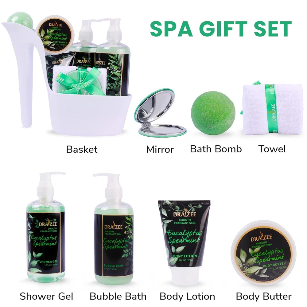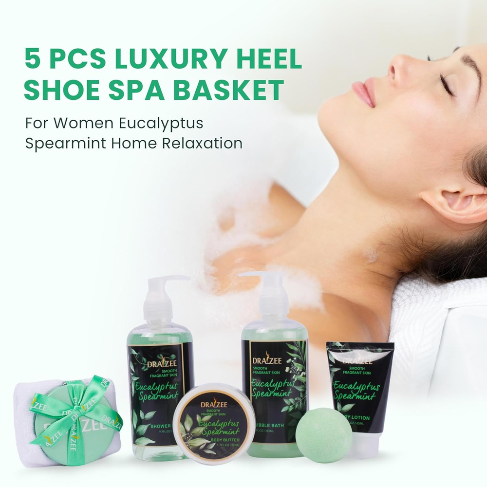 Store New Arrivals Add to Favorite View Feedback Contact Mothers Day Gifts for Mom-Spa Gift Baskets for Women-8 Pcs Luxury Eucalyptus Description Item model number DZ14527N Item Form Variety Product Dimensions 11 x 5.5 x 10.34 inches; 2.48 Pounds Country of Origin China Product Benefits Softening Skin Type All Scent Eucalyptus PERFECT FOR MOTHER'S DAY & SPECIAL OCCASIONS: Thoughtfully designed spa gifts for women, ideal for mothers day gifts, birthdays, anniversaries, and holidays. This beautifully packaged spa gift basket is perfect for your mom, wife, girlfriend, or any woman who deserves pampering. Whether it's for a birthday, Mother’s Day, or just because, this spa set makes an excellent gift that brings relaxation and joy to the recipient. COMPLETE HOME SPA EXPERIENCE: This stunning 8 pieces bath gift set includes 5 amazing Eucalyptus Sparemint scented bathing essentials and Bath Bomb, Towel, Mirror. The bath essentials are a shower gel, a bubble bath, a body butter and a body lotion. It rejuvenate the skin while transforming any bath into a soothing retreat. Perfect for self-care lovers, this spa set offers a calming and indulgent experience, leaving skin refreshed and pampered. BEAUTIFULLY PACKAGED & GIFT-READY: Elegant gift basket for women, perfect for gifting to moms, wives, girlfriends & moms birthday gift ideas. The beautifully arranged packaging enhances the gifting experience, making it an impressive and memorable present. No need for additional wrapping—this spa gift basket arrives ready to give, making it the ideal choice for any special occasion, including Christmas, Valentine’s Day, and anniversaries. PAMPERING & RELAXATION: A self-care basket designed to provide stress relief, featuring calming bath products and skincare essentials. Infused with nourishing ingredients and soothing scents, this luxurious spa kit helps create a serene atmosphere for relaxation. Ideal for busy moms, professionals, and anyone in need of a rejuvenating escape, this set offers a spa-like experience in the comfort of home. QUALITY YOU CAN TRUST: Made with nourishing ingredients, this spa gift set for women ensures a refreshing and rejuvenating experience. Each product is crafted to deliver maximum hydration and skin benefits, free from harsh chemicals. This makes it a safe and thoughtful choice for all skin types. Perfect for those who appreciate high-quality skincare and love indulging in a moment of self-care and pampering. Product Description Luxury Spa Gift Basket for Women – Perfect Mother’s Day & Birthday Gift for Mom HAVE YOU EVER SEEN SUCH A UNIQUE SPA BATH SET ur premium Eucalyptus Spearmint scent spa relaxation basket has the shape of a high heel shoe, which you can use as storage or decoration or your bathroom, bedroom or any room of your house! YOUR SKIN WILL BE SOFTER THAN EVER The bubble bath and the shower gel make super thick foam that will elevate your bathing experience, while the soft, pink EVA bath puff will massage and exfoliate your skin, leaving it soft and perfumed. LET THE AROMA OF Eucalyptus Spearmint RELAX YOU This stunning bath gift set includes 4 amazing Eucalyptus Spearmint scented bathing essentials and a rose shaped bath puff. The bath essentials are a shower gel, a bubble bath, a body butter and a body lotion. A GIFT THAT WOULD IMPRESS ANY WOMAN Draizee’s shower gift set with the high heel shoe case is guaranteed to make any woman happy, so place an order and give this unique bath gift basket to a special woman in your life as a birthday or holiday gift! ABOUT US We offer the best prices around on high quality products. Our E-store includes media such as books, movies, music and games while offering electronics, toys, sporting apparel, clothing, tools, general home, garden items and more. SHIPPING We are always working hard to ensure your package arrives as soon as possible. Please understand that some factors like weather, high postal traffic, and the performance of shipping companies are outside of our control. RETURNS We offer a 30-Day Return Policy on items which you are not completely satisfied with. You have the option for a full-refund or an exchange of the item. No returns are available on items shipped outside of the USA. PAYMENT We accept PayPal. CONTACT US This page content is yet to come Please ad us to your favorite seller and visit again later Thank You CUSTOMER SATISFACTION We try our very best to make sure every customer is completely satisfied. If there's a problem, message us! We're happy to help.