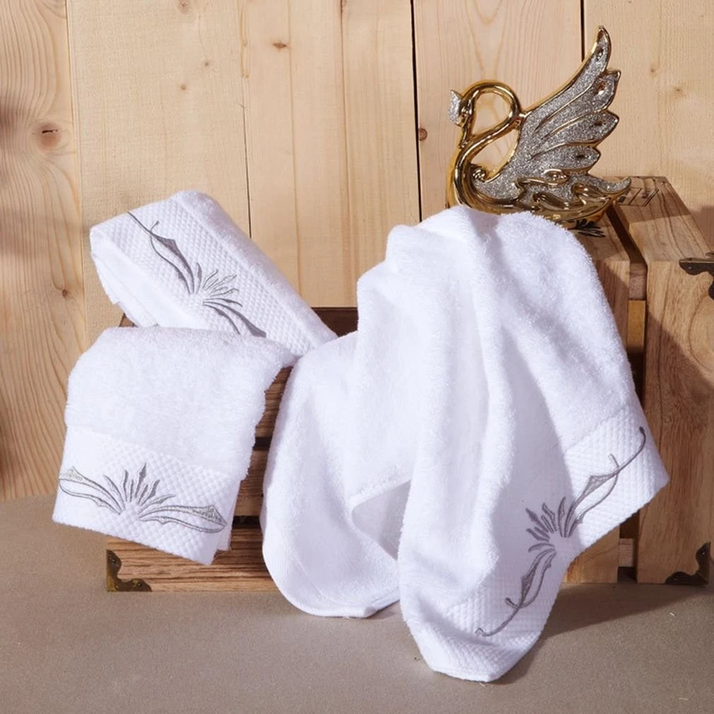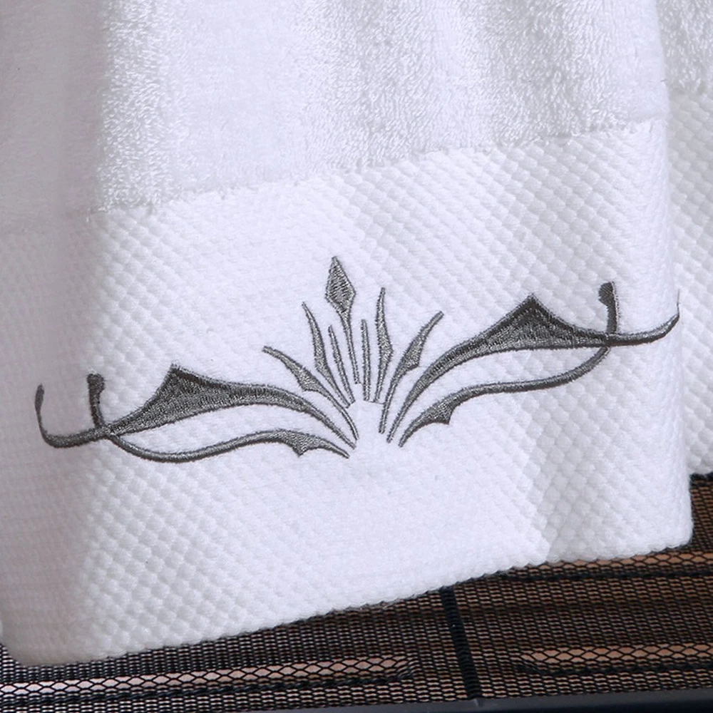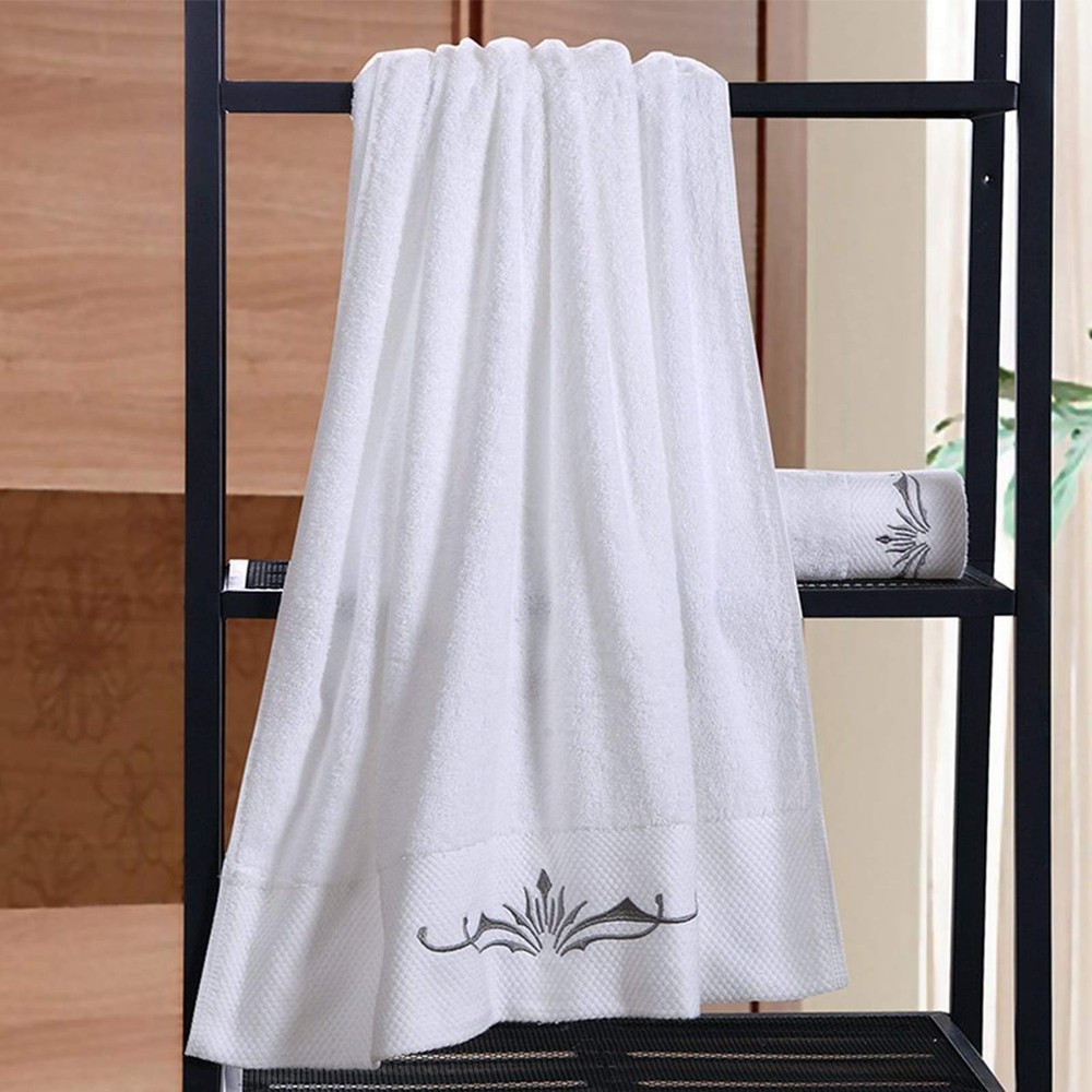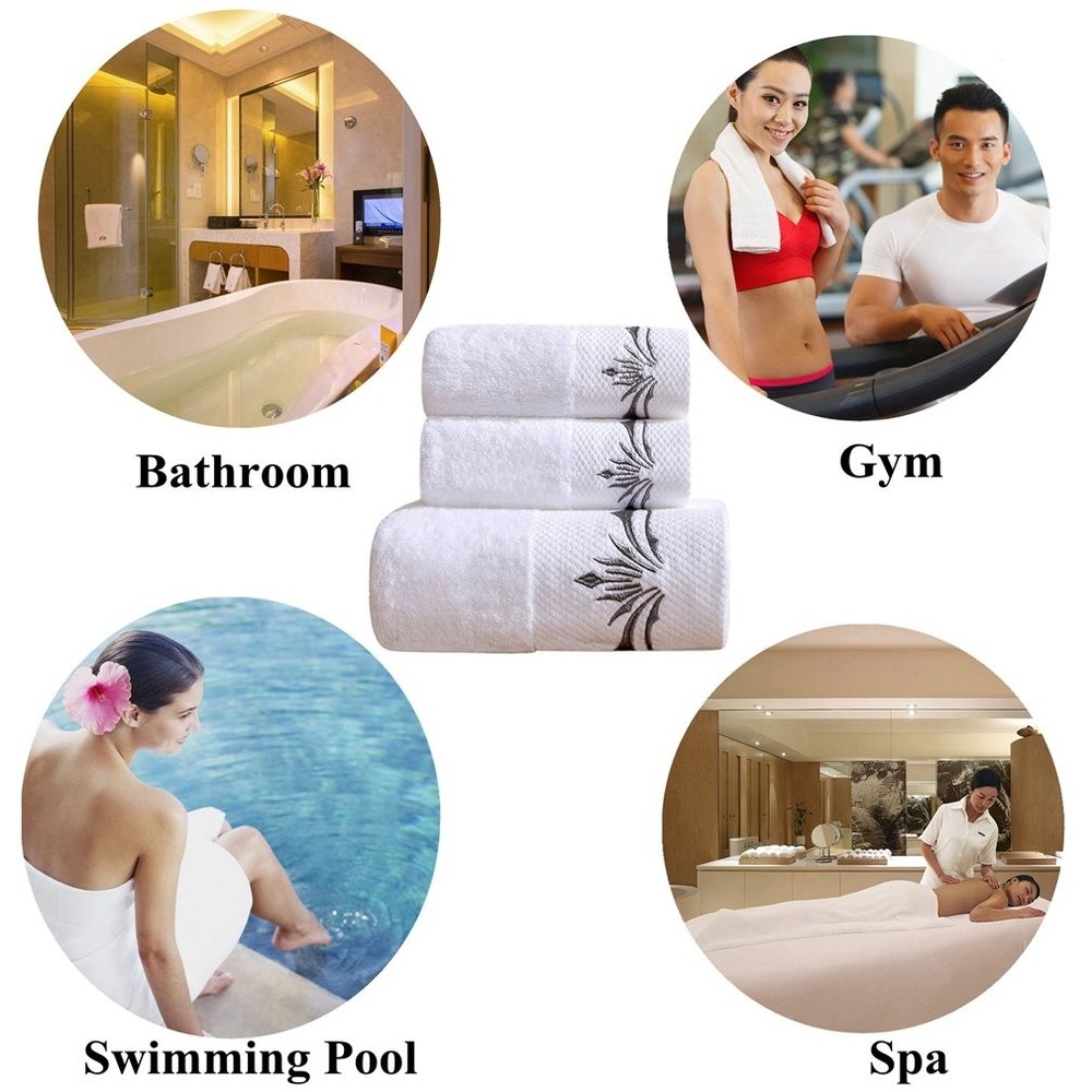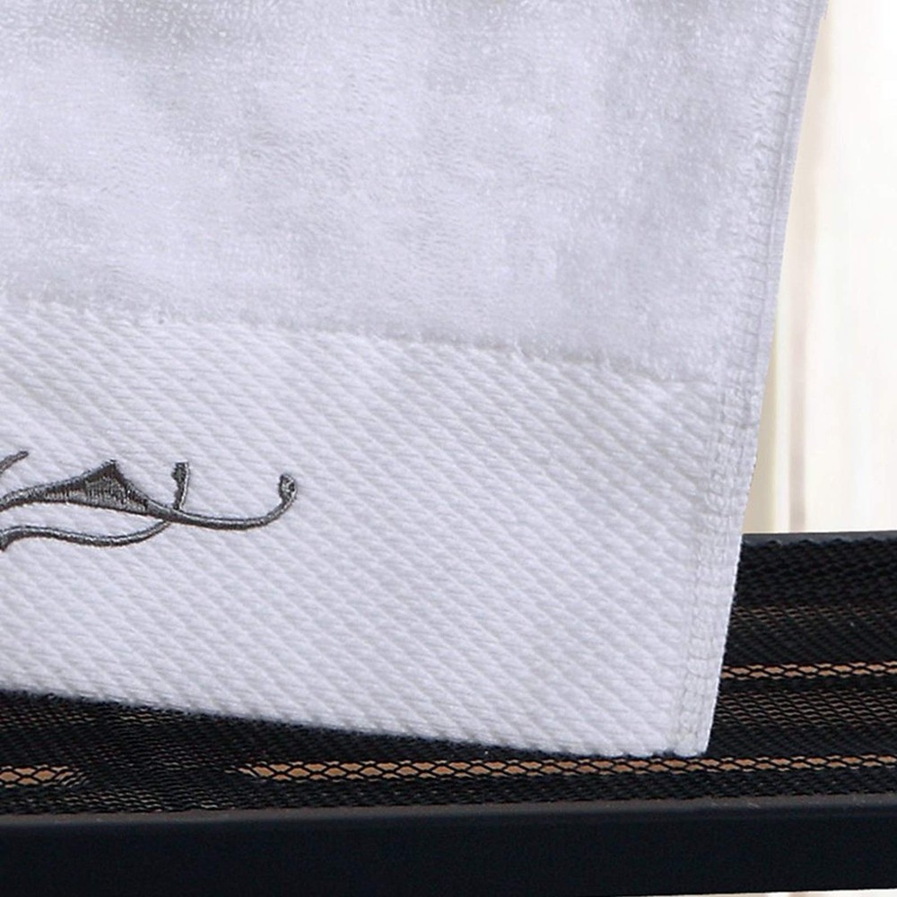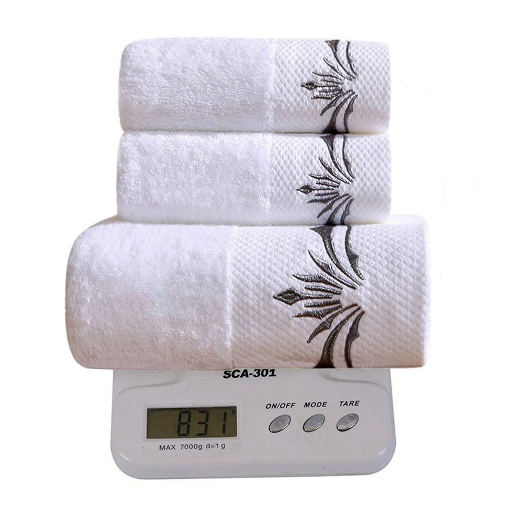 Exquisite Embroidery Patterns adding a flare of fashion to your bathroom. 100% Cotton provides optimal softness and absorbency. Perfect for bathing, drying, and beauty care ect There are many factors to consider when producing towels.Such as the water absorption, bulkiness, softness, thickness, hair loss, durability and embroidery of the towel, etc. We have tested that thicker towels will be more fluffy, but the water absorption is very poor, so we chose a medium-thickness towel on this basis. Many customers have also reflected that thick towels are very uncomfortable to use. You can use it for a while,if you don't like it, you can contact us.Any suggestions can tell us!We value our customers’ advice very much! We believe,you will definitely want to buy a second set of towels after use. Whether packaging or product quality, we are constantly correcting our shortcomings,hope to provide the most cost-effective products to every customer. Package Include:1* Bath Towels Set If you have any dissatisfaction, do not worry, please be sure to contact us. White towels and gray exquisite embroidery,you can easily match any kind of style bathroom.Exquisite embroidery patterns make your bathroom more stylish and luxurious. Towels with 900 GSM - like this Cotton Towel Set - offer a more luxurious, spa-like experience.Ideal for home, hotel, bathroom, gym, or salon use. Incredible soft and extra durability:Our towels gets fluffy and soft with each wash. Standard Size:Bath towel:about 28" * 55",about 600g; Hand towel :14" * 30",about 150g;Washcloths :13.8" * 13.8",about 70g About the thickness of towels:Because this towel is long plush, it is easier to be compressed.After cleaning and drying, you will find that the towel is more fluffy and soft.We proudly believe in our product softness, and quality.