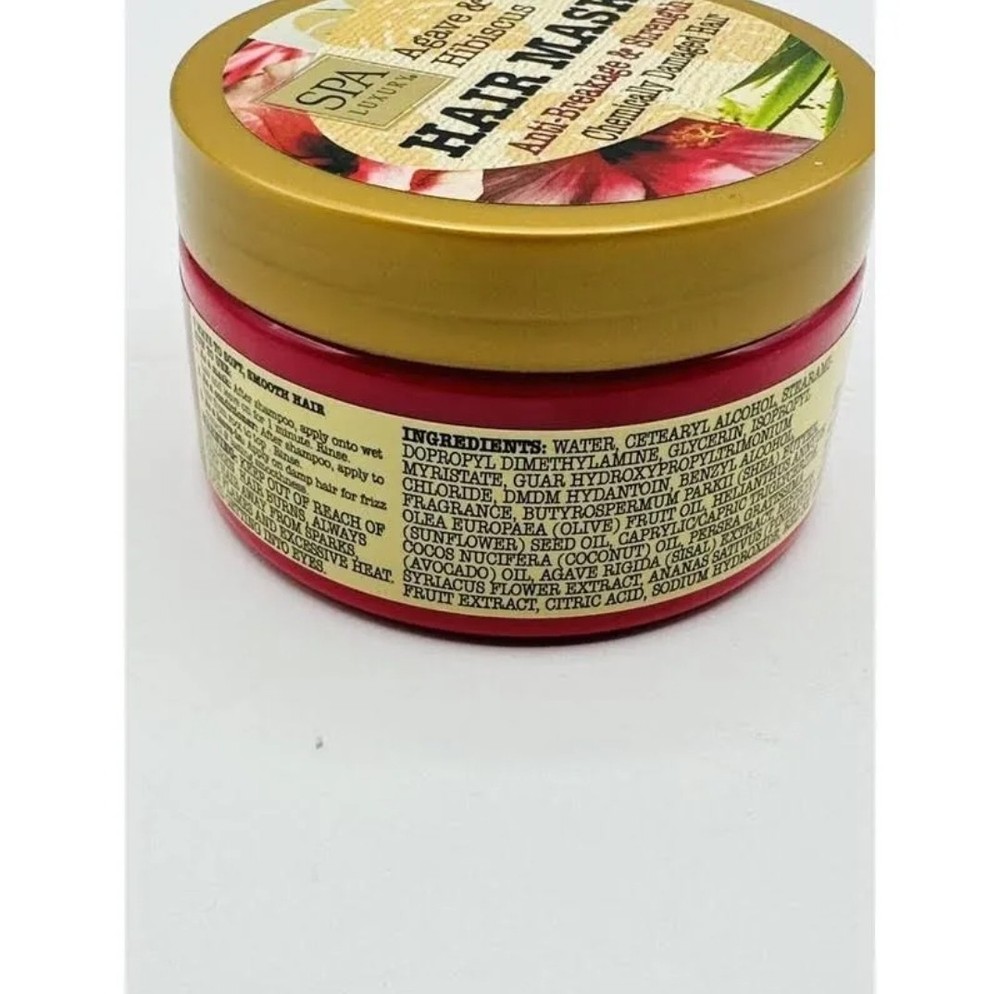Brand: Spa Luxury Styling Effect: Hair Repair, Deep Conditioning, Nourishing, Anti-Frizz, Detangling, Shine, Smoothing Formulation: Cream Volume: 6oz Size: 6oz Department: Unisex Features: Silicone-Free, Sulfate-Free, Cruelty-Free/No Animal Testing, Contains Minerals Type: Hair Mask Active Ingredients: Shea Butter, Olive Oil, Sunflower Seed Oil, Avocado Oil, Agave, Hibiscus, Pineapple, Coconut Oil Hair Type: Damaged Hair, All Hair Types Ingredients: agave, Hibiscus, Pineapple, Olive Oil, Coconut Oil, Avocado Oil, Sunflower Seed Oil, Shea Butter