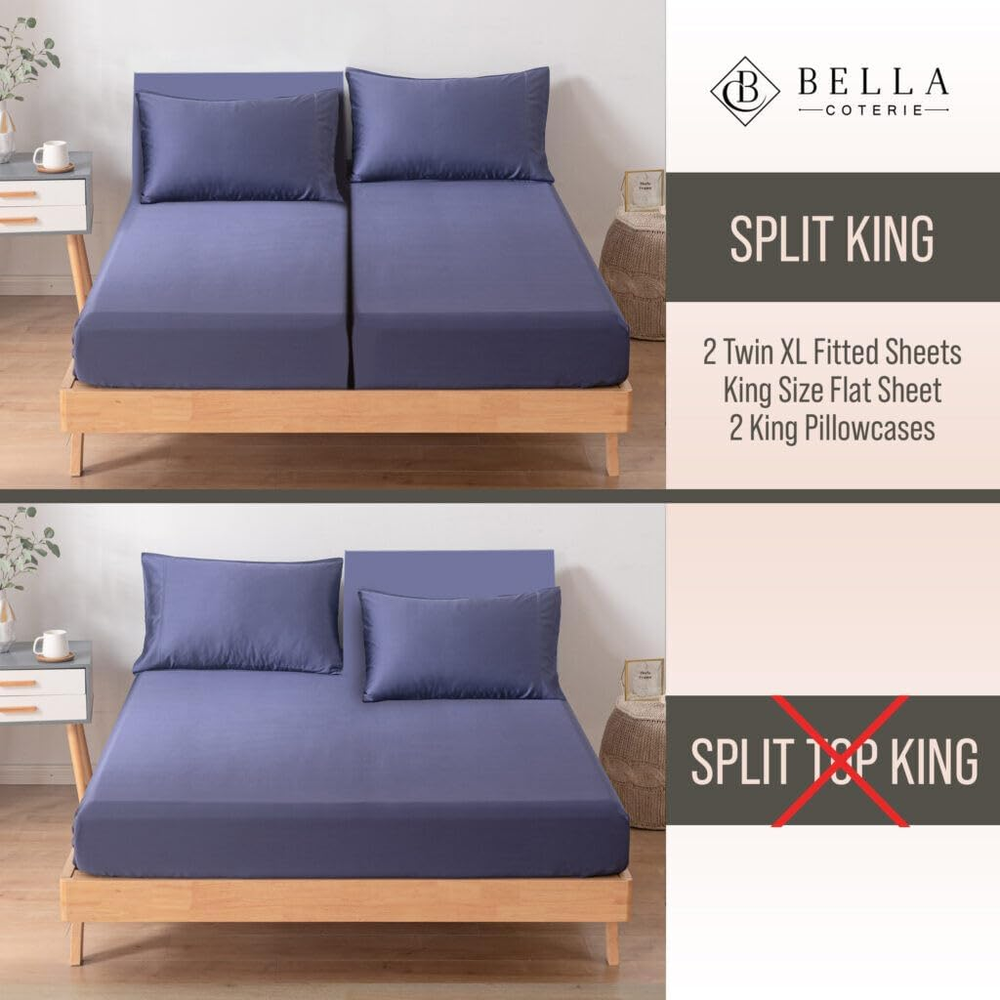 Store New Arrivals Add to Favorite View Feedback Contact Luxury Bamboo Split King Size Sheet Set | 100% Organically Grown Bamboo Viscose | Ultra Soft | Cooling for Hot Sleepers | 18" Deep Pocket [Twilight Blue] Description Style Luxury Bedding Weave Type Sateen Pattern Solid Country of Origin China Theme summer Number of Pieces 5 Unit Count 1 Count Pillowcase Quantity 2 Material Organically Grown | Viscose Made From Bamboo Item Display Dimensions 112 x 108 inches Age Range (Description) Adult Seasons Winter, Summer, Fall, Spring Package Dimensions 13.98 x 10.94 x 4.06 inches Closure Type Envelope Item Weight 7.04 pounds Sham Quantity 2 Special Feature Cooling, 18" Extra Deep Pocket, Hypoallergenic, Sateen Weave, Moisture Wicking Color Twilight Blue Thread Count 400 Included Components 2 Pillowcases, 2- 18" Extra Deep Pocket Fitted Sheets, Flat Sheet Product Care Instructions Machine Wash, Tumble Dry Size Split King RECHARGE YOUR SOUL- Embrace yourself in the luxury of 100% viscose made from bamboo sheets and you will wake up feeling renewed and refreshed. Lightweight and silky, hypoallergenic and moisture-wicking, these sheets keep you cool in summer and warm in winter. REDEFINE YOUR LIFESTYLE- With a 400 thread count, the superior quality of these 100% viscose derived from bamboo sheets are a dream to sleep on, getting softer with every wash. The 18" extra deep pocket fitted sheet will fit even the most plush pillow top mattresses. RENEW YOUR SLEEP - You can rest well in luxury bedding knowing that your sheets have been tested and certified to be free of over 100 harmful chemicals with the OEKO-TEX 100 certification. REINVIGORATE YOUR RELATIONSHIP - Enhance every part of your relationship as you cozy up with your loved one and enjoy the silky, soft, woven bliss of 100% viscose made from bamboo. ADD TO CART WITH CONFIDENCE in our 100% Customer Satisfaction Guarantee! Product Description Slip Into Luxurious Comfort With 100% Bamboo Viscose Bedding The video showcases the product in use. The video guides you through product setup. The video compares multiple products. The video shows the product being unpacked. How should I care for my Bella Coterie sheets to maintain their quality and durability? Simply wash and dry. Bella Coterie bamboo sheets are designed with durability in mind to resist fading and pilling. Are Bella Coterie sheets designed for a secure fit? From deep pockets that ensure a perfect fit, to non-slip straps that keep everything in place - Bella Coterie sheets are thoughtfully crafted for comfort and function. Are these sheets made from sustainable materials? Our 100% organically grown bamboo viscose sheets are OEKO-TEX Standard 100 certified, meaning every component has been tested for over 100 harmful chemicals. Rest easy knowing you're wrapped in sheets that are free from toxins and pesticides. Why choose Bella Coterie bamboo viscose sheets over cotton or synthetic? Bamboo is naturally cooling to reduce night sweats, hypoallergenic for sensitive skin, and is moisture wicking to keep your sheets dry and free of allergens.. Are Bella Coterie Sheets soft to the touch and breathable? Say goodbye to rough and scratchy sheets! Organically grown bamboo viscose offers unparalleled silky softness without synthetic fibers that can irritate skin. Experience cooling comfort - naturally breathable for temperature control. Bella Coterie Luxury Bedding Add to Cart Add to Cart Add to Cart Customer Reviews 4.4 out of 5 stars 3,688 4.4 out of 5 stars 98 4.5 out of 5 stars 423 4.5 out of 5 stars 287 Price $129.99 $ 129 . 99 $129.99 $ 129 . 99 $29.74 $ 29 . 74 — Material 100% Viscose from Bamboo 100% Viscose from Bamboo 100% Viscose from Bamboo 100% Pure 6A Mulberry Silk Secure Fit 18" Extra Deep Pockets 8 Corner Ties & Button Closure Envelope Sham Zipper Closure Fabric Feel Silky Smooth & Cool to Touch Silky Smooth & Cool to Touch Silky Smooth & Cool to Touch Ultra Soft & Breathable Temperature Regulating Breathable & Cooling Breathable & Cooling Breathable & Cooling Cozy & Cool Designer Color Collection 16+ Colors Available 14+ Colors Available 16+ Colors Available 10+ Colors Available Machine Washable ✔ ✔ ✔ ✔ Anti-Pilling / Anti-Fading ✔ ✔ ✔ ✔ OEKO TEX Certified ✔ ✔ ✔ ✘ ABOUT US We offer the best prices around on high quality products. Our E-store includes media such as books, movies, music and games while offering electronics, toys, sporting apparel, clothing, tools, general home, garden items and more. SHIPPING We are always working hard to ensure your package arrives as soon as possible. Please understand that some factors like weather, high postal traffic, and the performance of shipping companies are outside of our control. We offer free shipping to the lower 48 states and ship within 2 business days of payment, usually sooner. We do not accept P.O. Boxes. Please provide a physical address. For shipping outside of the continental USA, we only use eBay's Global Shipping Program.The item is shipped to KY and then sent to the rest of the world. International customers are responsible for all duties and taxes. Continue to check out in order to calculate costs for shipping the item to your country. Messages regarding eBay's Global Shipping Program MUST be directed at eBay EXCLUSIVELY. RETURNS We offer a 30-Day Return Policy on items which you are not completely satisfied with. You have the option for a full-refund or an exchange of the item. No returns are available on items shipped outside of the USA. PAYMENT We accept PayPal. CONTACT US This page content is yet to come Please ad us to your favorite seller and visit again later Thank You CUSTOMER SATISFACTION We try our very best to make sure every customer is completely satisfied. If there's a problem, message us! We're happy to help.