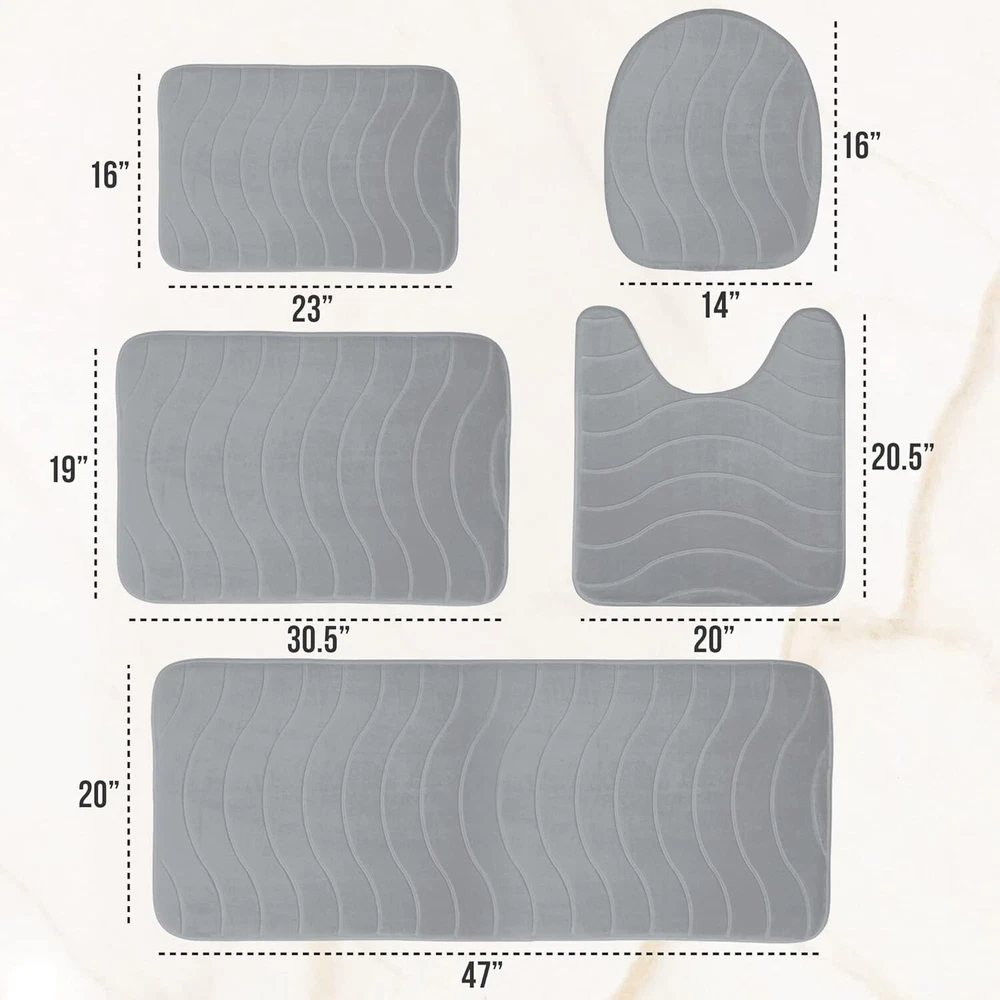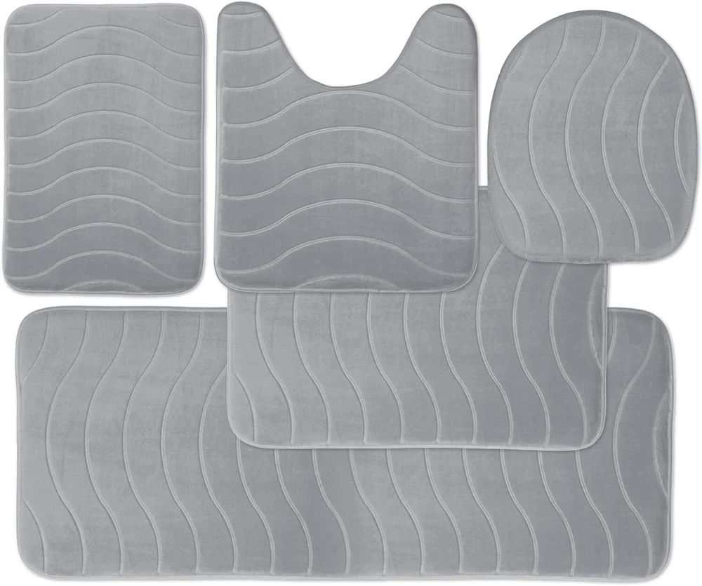Luxury Bathroom Rugs Set 5 Piece - Memory Foam Bath Mat Set, Toilet Rug Set. Strong Absorbent, Non-Slip, Ultra Soft, Easy to Clean, Gray