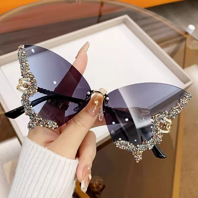 Luxury Diamond Butterfly Sunglasses 65*71mm Size Lense Rimless Oversized Eyewear