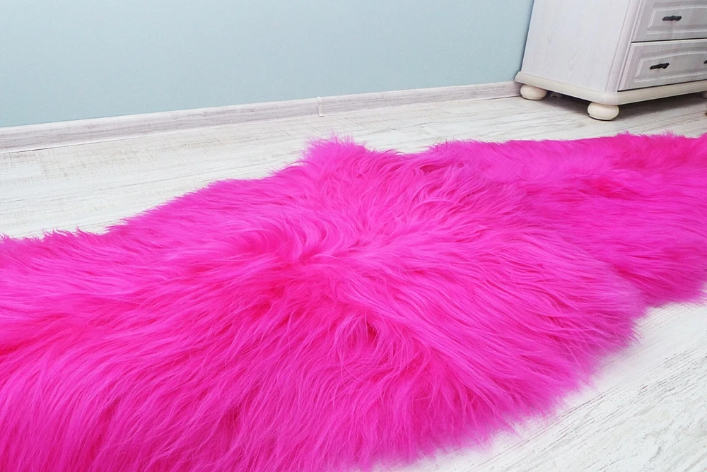 Double PELT Pink Sheepskin Carpet Genuine Sheepskin Throw Rug Fur Sofa Cover GENUINE SHEEPSKIN Throw double rug is the subject of the listing. Features: Very long and soft hair, Beautiful INTENSE PINK color. YOU BUY THE PRODUCT FROM THE PHOTOS SIZE: 200x75cm Characterized by its: GIANT size long and soft hair plush SOFT material nice shape and intense color Thanks to its great features pink sheepskin double rug can serve us a: floor decoration seat cover bedspread or sofa throw plush and warm wool blanket perfect for long winter evenings! Natural sheepskins keeps your body temperature The rug was prepared from sheep's skins that live in higher mountain areas, so that the skin itself is free from toxins. PLEASE NOTE: Our hides are measured in the widest and longest points includeing legs and hair of the skin. INTERNATIONAL SHIPPING time AFTER we dispatch the package by FEDEX (including customs clearance): 2-6 business days