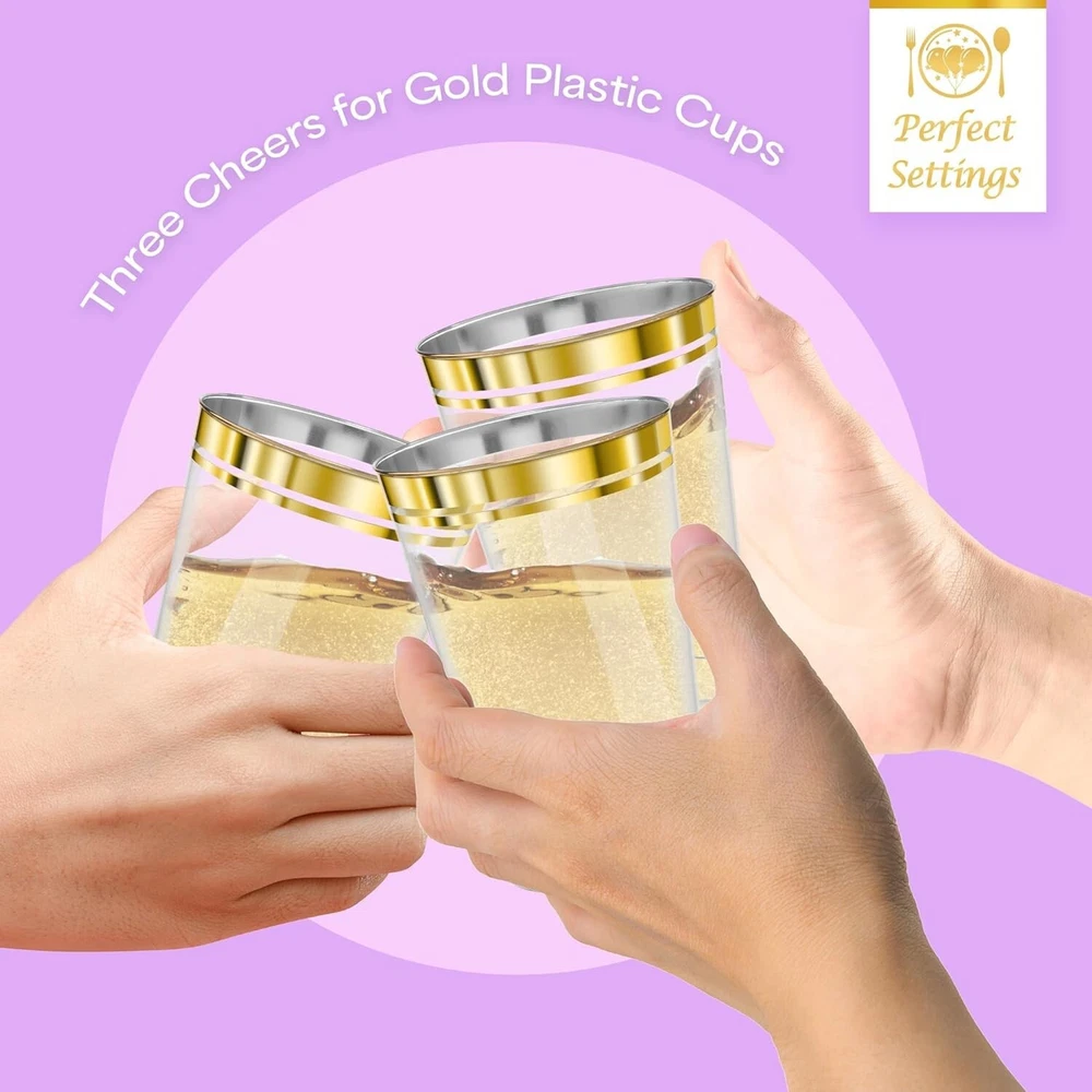 These elegant gold-trimmed cups instantly upgrade any gathering—perfect for parties, weddings, or casual drinks. The sturdy plastic feels premium, and the double gold rims add a luxe touch without the cleanup hassle. Holds beverages securely, and the 100-count ensures you’re always ready to host in style!