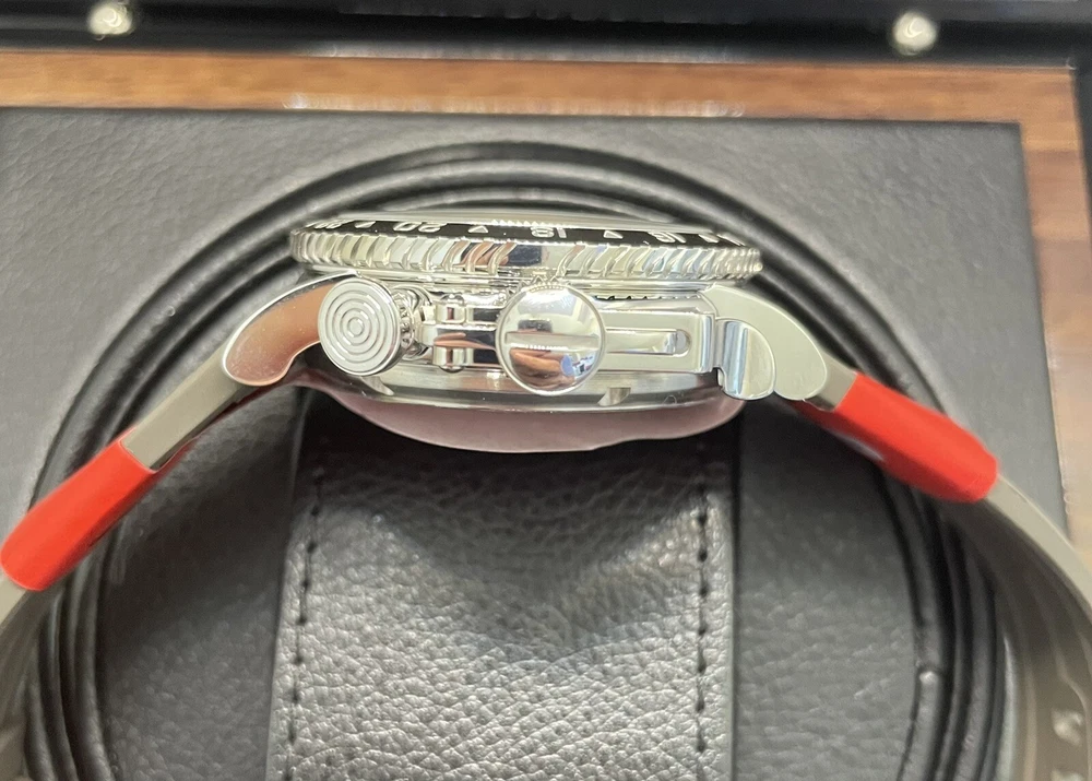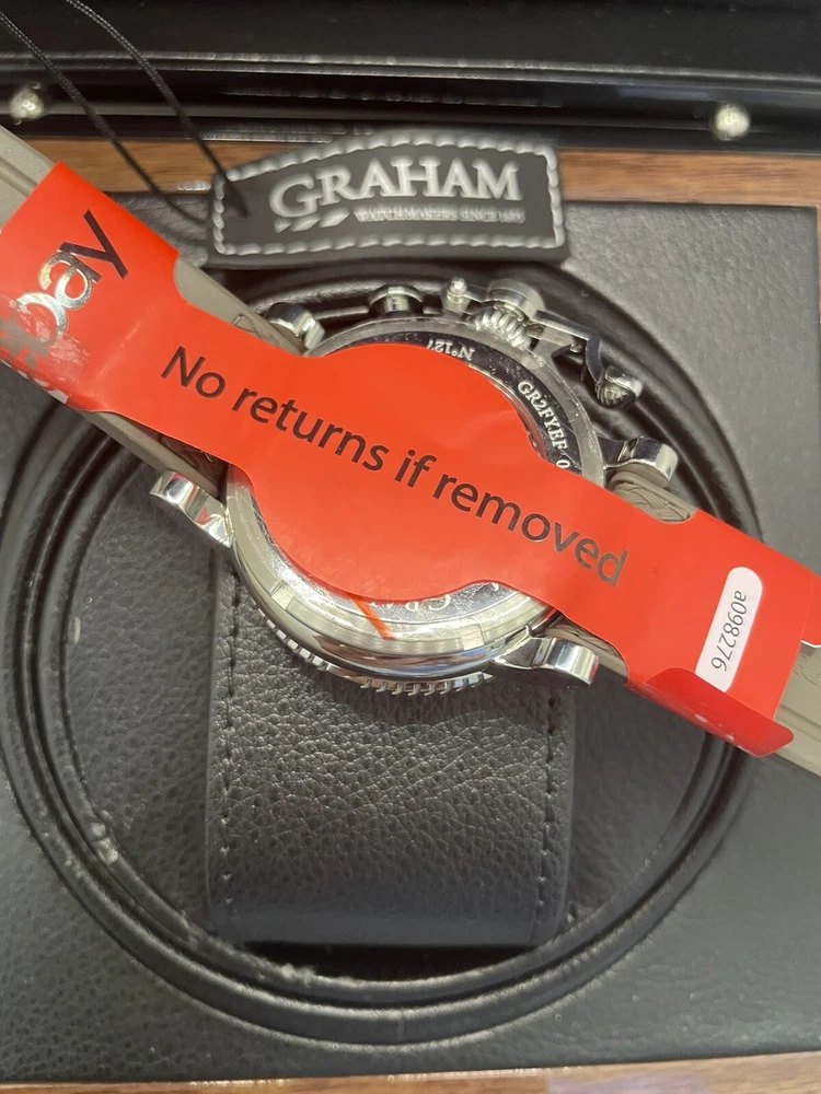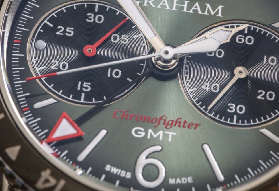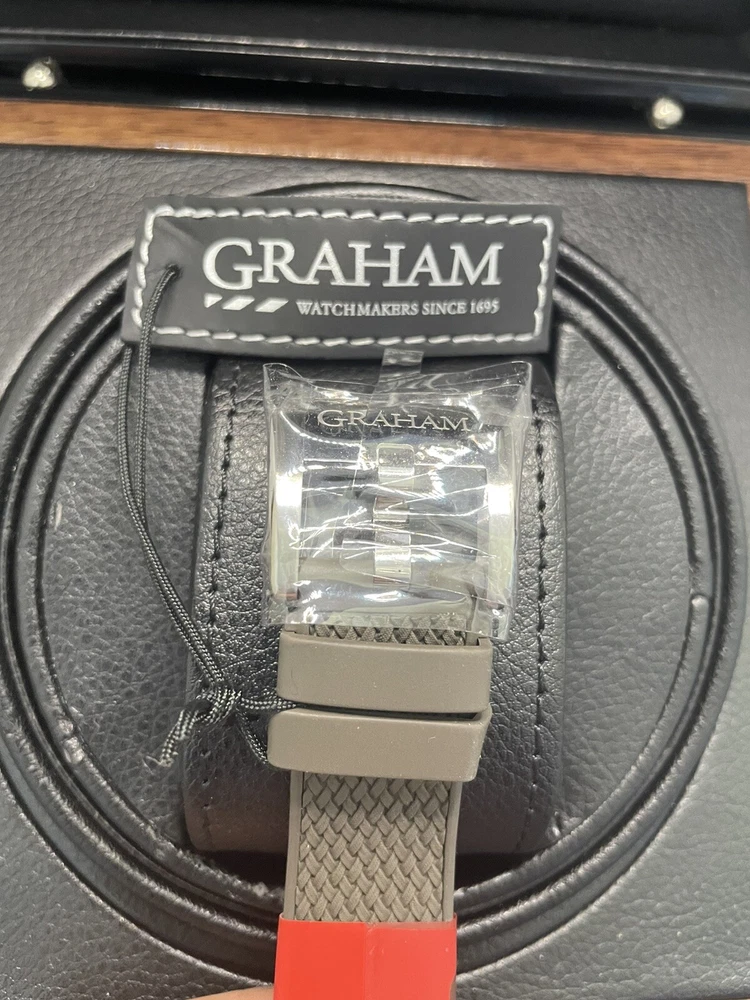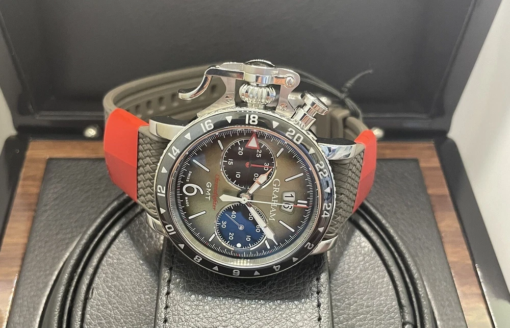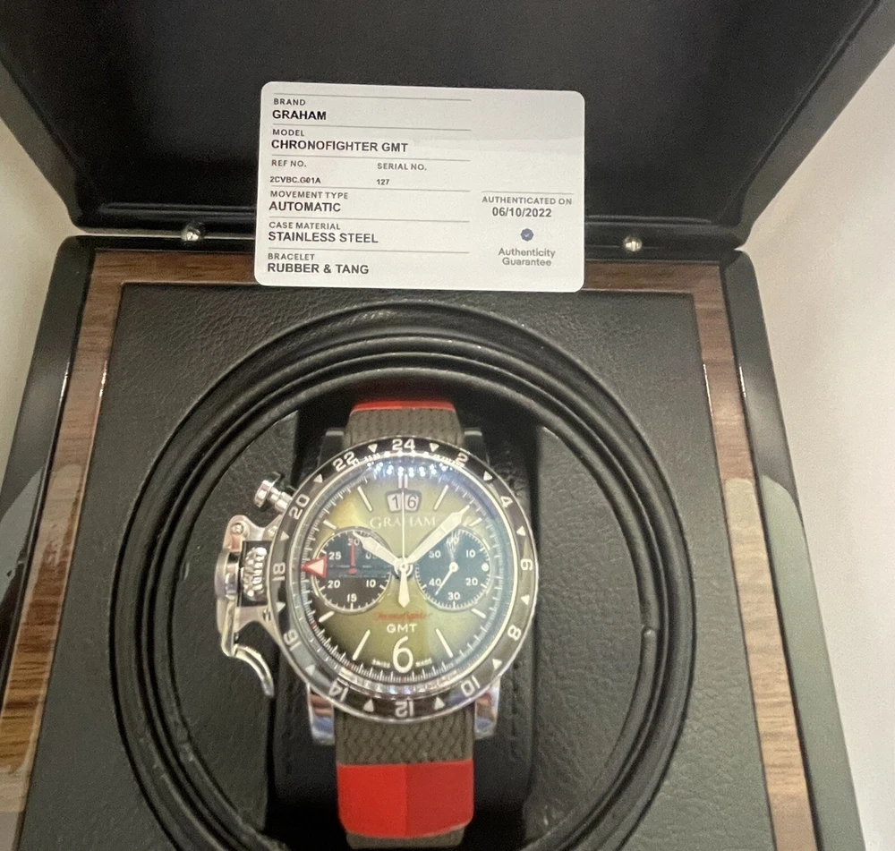 $200 Discount for Black Friday Only!! Graham Chronofighter Vintage Watch is a stunning timepiece with a round silver case and exhibition caseback. The watch features a green dial and a green rubber band, with a polished stainless steel case finish. It is a mechanical (automatic) movement watch with GMT features, and comes with its original box/packaging and manual/booklet. The watch is perfect for men who appreciate the elegance of a vintage watch. With a case size of 44 mm, it is a great addition to any watch collection. The Graham Chronofighter Vintage Watch is a Swiss-made timepiece and has a reference number of G01A. Get this luxurious watch on your wrist today!