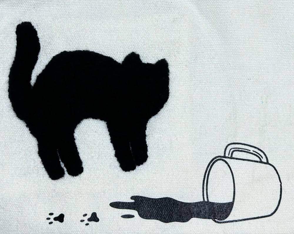 This mini canvas tote features a front panel of hand-dyed, recycled cashmere yarn, stitched using punch needle embroidery for a clean, textured finish. Simple, functional, and thoughtfully hand crafted. Made from sturdy cotton canvas with a soft structure, it’s sized just right for your daily essentials. BLACK COFFEE CAT - Cut pile punch needle embroidery Materials: 100% Cashmere Yarn - Recycled and Hand-dyed Natural Cotton Canvas Vinyl design Dimensions: Height: 8 in Width: 10 in Bottom Width: 7 in Depth: 3 in Handle Length: 8 in