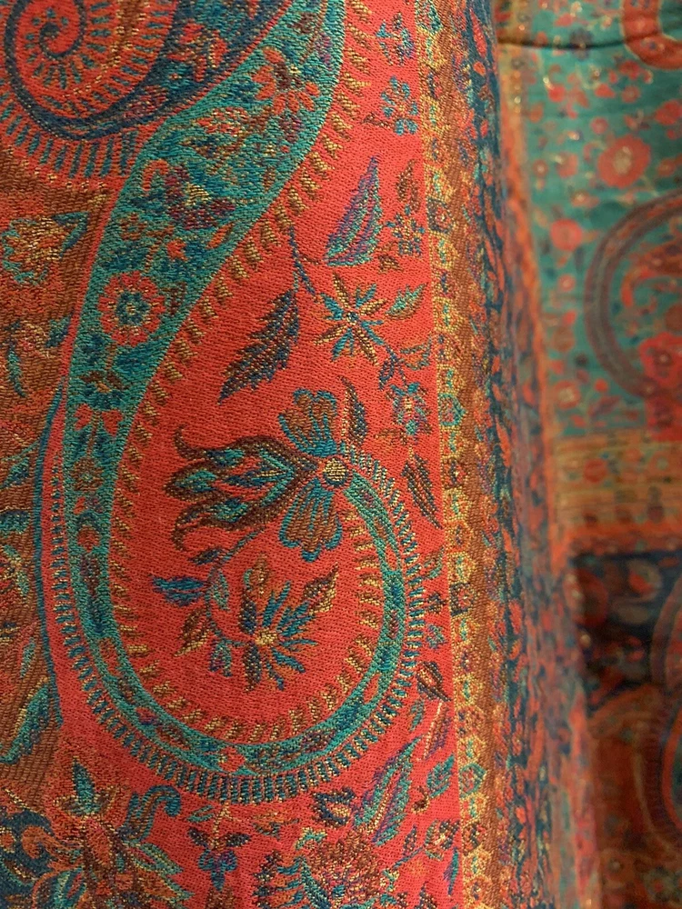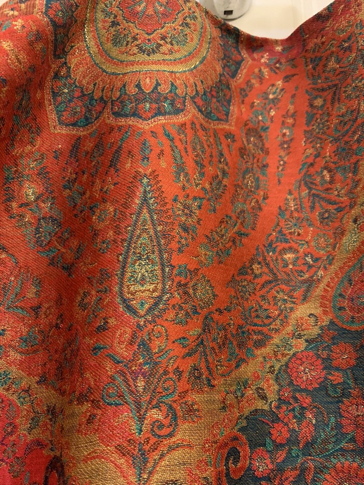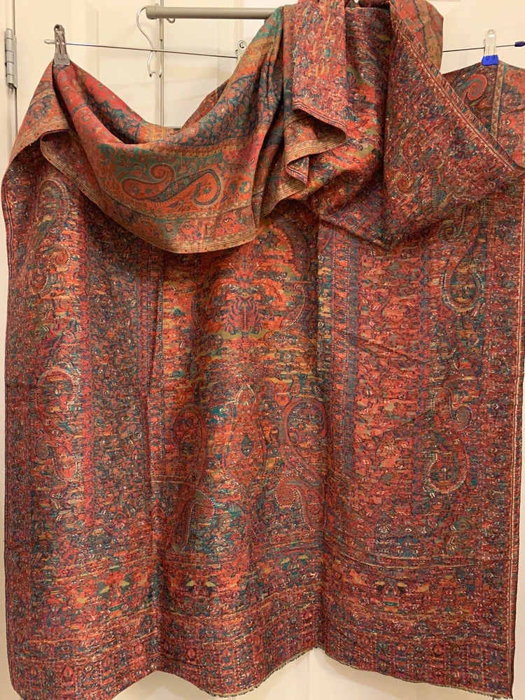 Brand new cashmere scarf(except embroidered line) Width: 44 inch, length 79 inch. Made in India Number #9506