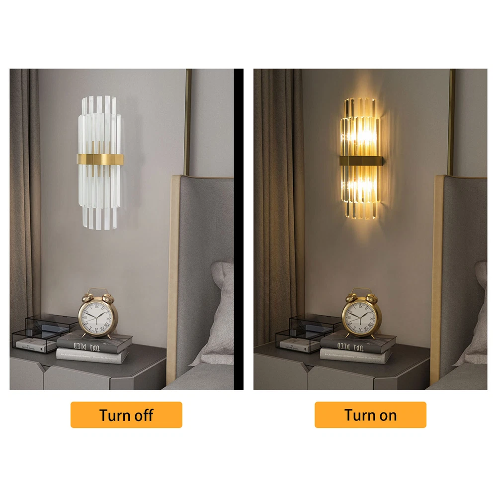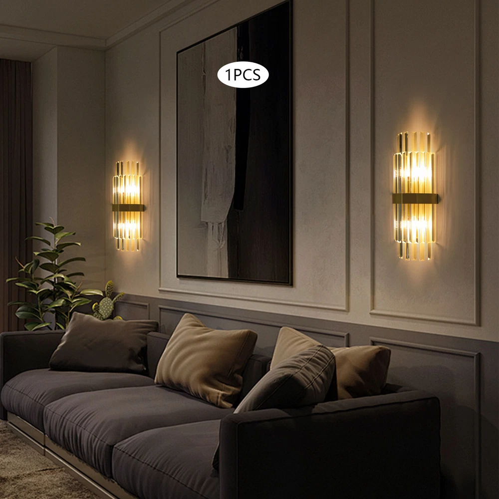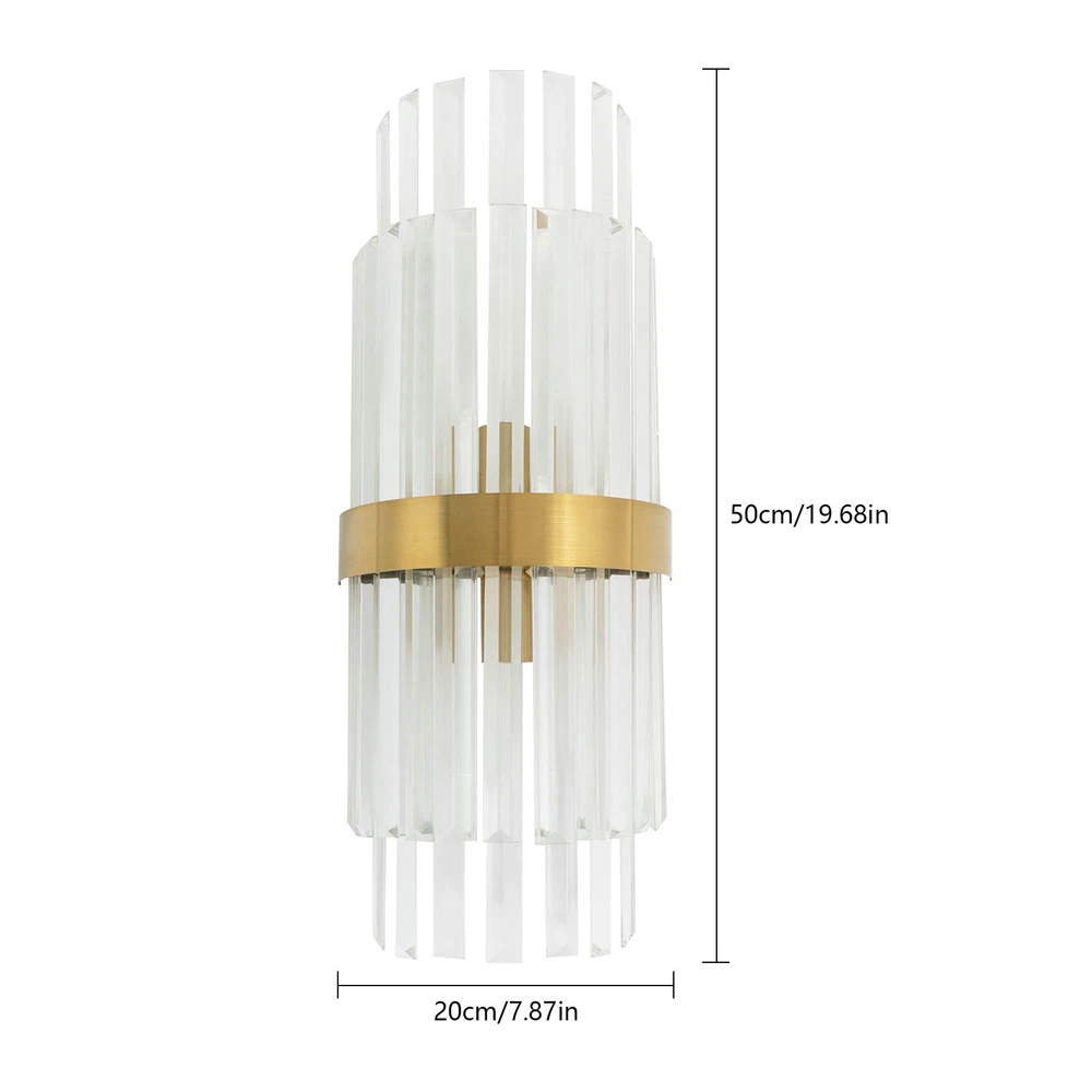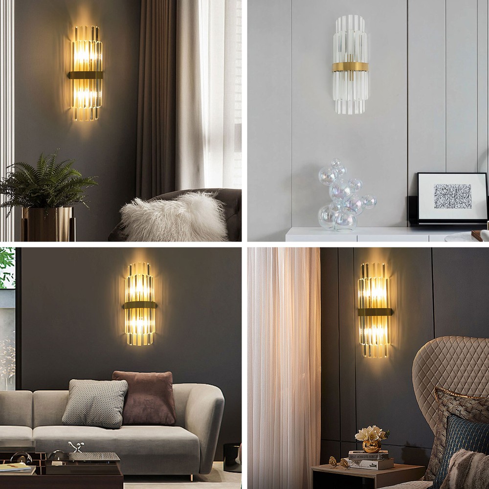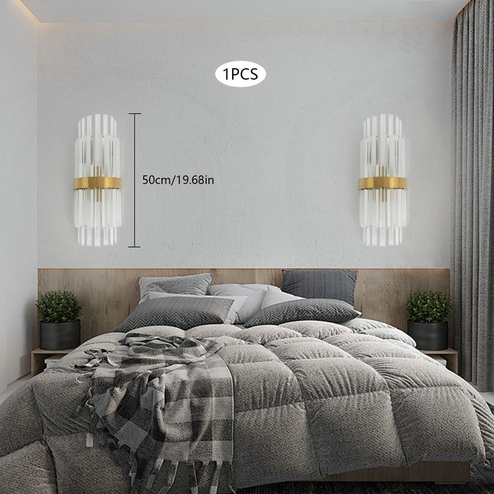 Modern Crystal Wall Sconce Golden Wall Light, Luxury Indoor Hallway Wall Lamp Description The gold wall lamp with its gorgeous colors and unique irregular design is not only an excellent tool to light up your room but also embellish your room with unique and beautiful elements. With exquisite workmanship and durable materials, it is not easy to fade. You can install two E14 bulbs yourself such as incandescent and LED bulbs to create different lighting atmospheres and express your unique taste. Key Features Build to Last: This product is made of high-quality iron and glass with the electroplating and polishing processes, which is corrosion-resistant, and wear-resistant, and can be used for a long time without frequent replacement. Eye-catching Appearance: Highly clear glass rods of varying lengths with an outer gold fixing ring add a touch of sophistication to the fixture. When the light is on, the colorful light reflected from the exquisite rods casts a fascinating glow on the wall, bringing you an extremely beautiful visual enjoyment. Comfortable Bedtime: Installing it in your bedroom, the lamp can fill your heart with warmth and emotion, making your monotonous life and room more vivid, and enhancing your sense of happiness in life, especially when you come home from a hard day's work. High Safety: The multiple heat dissipation holes and wide voltage (85-265V) design can effectively ensure safety and extend product life, so you can use it with confidence. Effortless Cleaning: The smooth surface, simple structure, and removable glass rods allow you to easily clean it with a dry towel. Assembly in a Breeze: Complete accessories, a clear installation diagram, and a simple structure allow you to easily install this product on the wall and start to use it in a short time. Ideal Gift: This product is so stylish and high-quality that you can choose it as a housewarming, birthday, or holiday gift for parents, friends, and loved ones. Protective Package: To prevent the product from being damaged during transportation, we packed it with foam to protect your products to the maximum extent possible. Guaranteed Customer Service: Our friendly customer service team would be happy to solve your issues with our table lamp. If you have any issues, feel free to contact us. Details Smooth Edges: The smooth and burr-free edges enhance the beauty of the product and better care for your skin when installing and cleaning it. Standard E14 Base: The standard E14 lamp holder can support the use of LEDs, Halogens, etc., making it very convenient for you to purchase and replace. Application Its applicable area is 86-107.6ft². It is suitable for almost all kinds of places, such as bedrooms, living rooms, kitchens, bedsides, bathrooms, dining rooms, corridors, staircases, studies, lofts, cafes, craft rooms, and bars. Specifications Material: Iron, Glass Process: Electroplating, Polishing Color: Gold, Clear Style: Modern Light Source Type:‎2* E14 Bulbs(Not Included) Assembly Required: Yes Indoor/Outdoor Usage: Indoor Light Fixture Form: ‎Wall Lamp Mount Type: ‎Wall-mounted Voltage: 85-265V Efficiency: E EU Energy Label Efficiency Labeling Class: A++to E Max. Single Bulb Power: 40W Applicable Area: 8-10m²/86-107.6ft ² Product Size(L*H): 20*50cm/7.87*19.68in Package Included 1* Gold Wall Lamp 1* English Installation Diagram All Accessories for Installation Notes This package does not include E14 bulbs, and you need to buy two yourself. Please do not install the lamp in a wet place or use it outdoors. Please do not install the light next to the high-temperature object such as the exhaust pipe to avoid damage. Please cut off the power supply when the lamp is abnormal. Please wear electric insulation gloves (not included) and avoid scratching the surface of the lamp and the electric wire when installing. Please make sure that the power supply has been cut off before installation, and conduct a power test before installation. Please install it by a licensed electrician if necessary. Please use the lamp within the applicable voltage range and clean it regularly. Please cut off the power supply when you clean the light. Please wipe with a soft and dry cloth, it is not suitable to clean with cleaning agents and water. Normally, the expansion screw will blow up after the force is applied. Please allow the slight color difference caused by the shooting light and 1-3cm error due to manual measurement, and make sure you do not mind before you order. Payment Delivery details Terms of sales About us Contact us Payment We accept ebay payment 。 Fees such as import duties, taxes are not included in the item price or shipping costs. These charges are the buyer's responsibility. Delivery details Shipping: 2-9 working days to: USA Terms of sales We maintain high standards of excellence and strive for hundred percent customer satisfaction. Feedback is very important to us. We hope that you contact us immediately before you give neutral or negative feedback, so that we can address your concerns. It is impossible to address issues if we do not know about them! About us Your satis faction is our ultimate goal. We work hard to earn your trust and future business. Our certified technicians have tested each item before shipping. The unit comes with 1 year limited warranty on all manufacturing defects. a) If you receive a defective item, you may return it or ask for a discount. Please contact us within 14 days after you receive the package. b) What you returned must be intact and in its original packaging as re? u. Customer is responsible for shipping costs of the returned item. c) We will cover the cost of shipping back t with the shipping rate indicated in the registration page. We will send you a new unit or refund the full payment you paid. Thank you. Contact us Business Hour Business Hour: Monday To Friday: 8:30 AM to 5:00 PM (Beijing China time) Due to time zones, our reply to your questions may not be immediately. But within abo