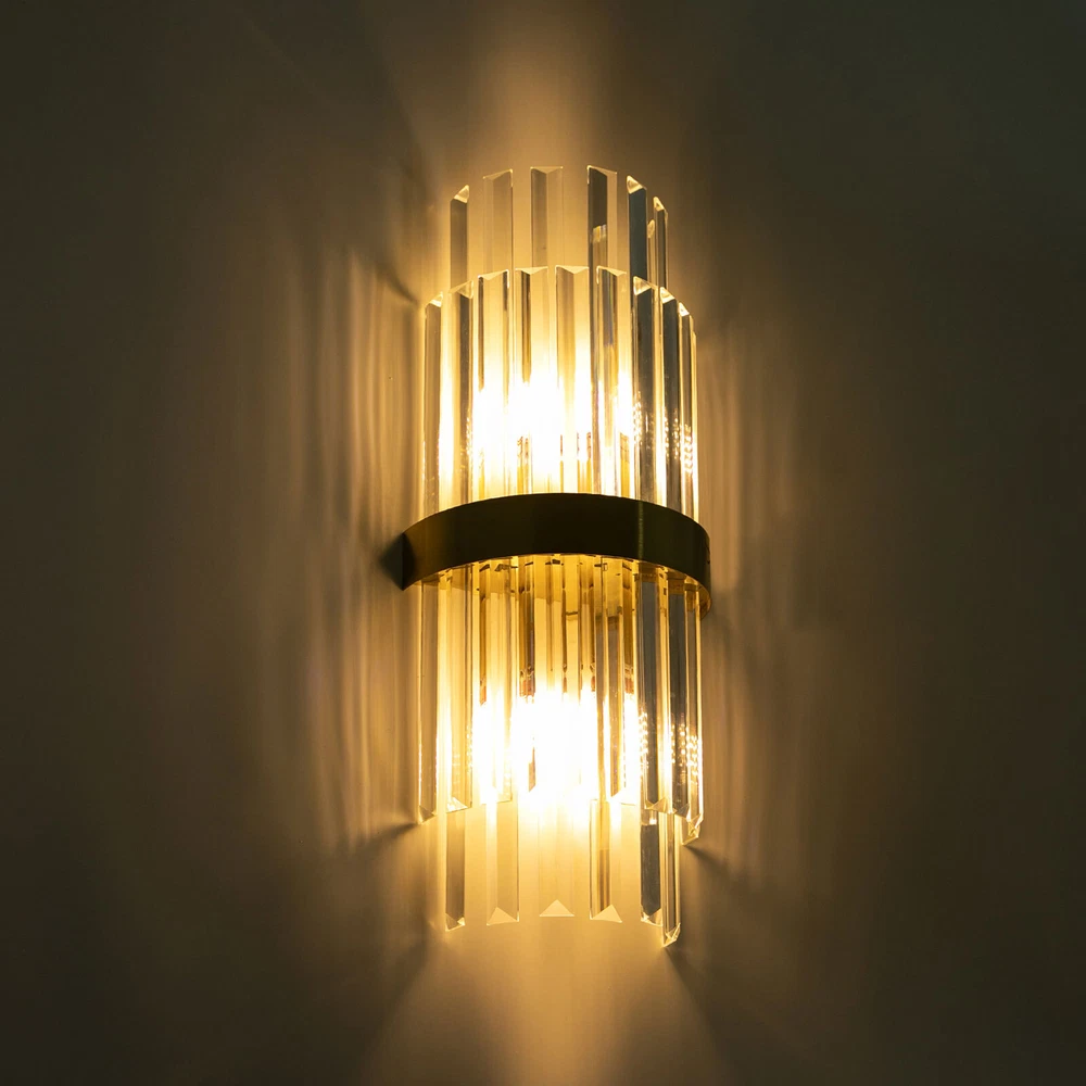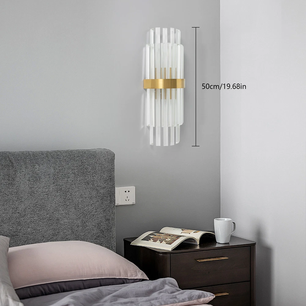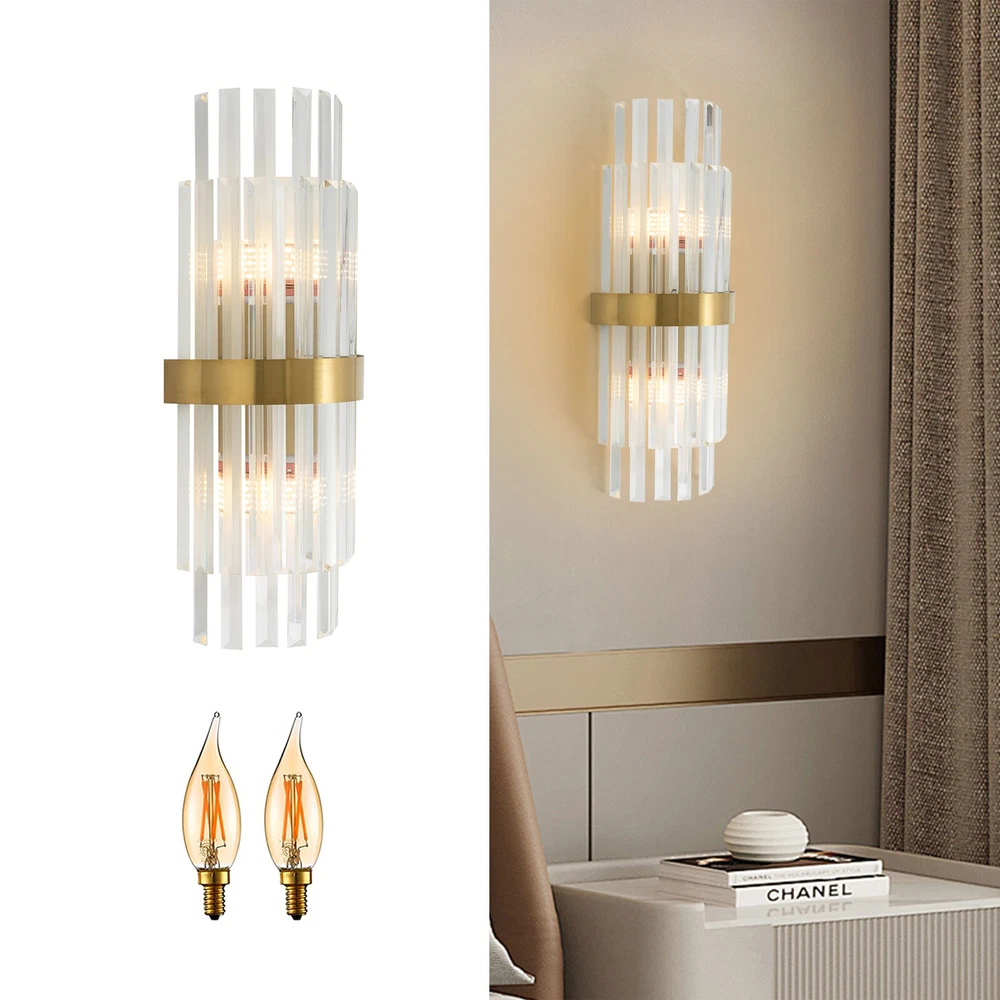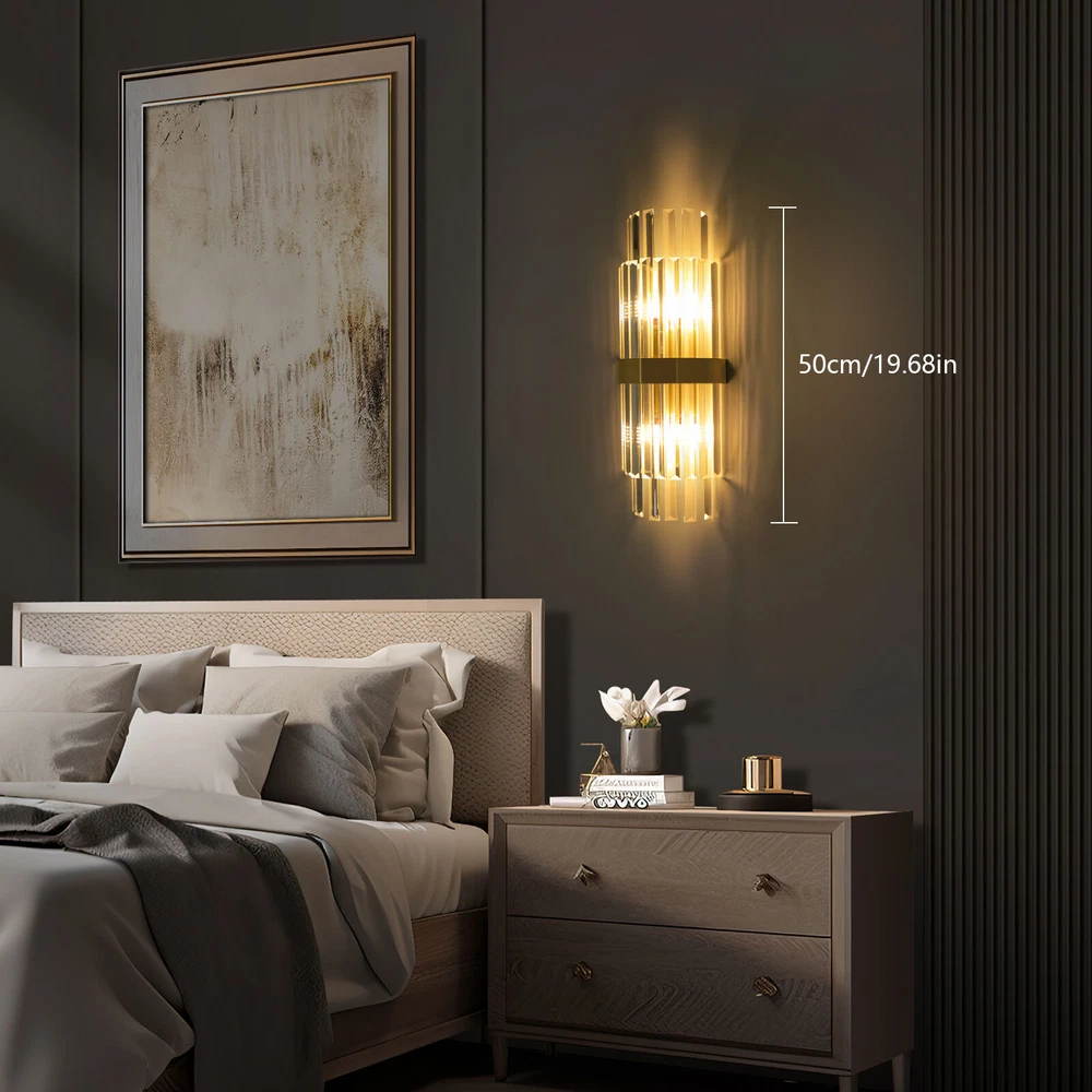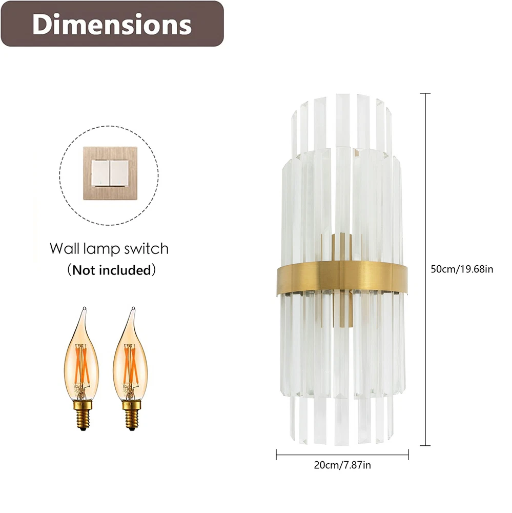 Modern Crystal Wall Sconce Golden Wall Light, Luxury Indoor Hallway Wall Lamp Description The gold wall lamp with its gorgeous colors and unique irregular design is not only an excellent tool to light up your room but also embellish your room with unique and beautiful elements. With exquisite workmanship and durable materials, it is not easy to fade. You can install two E14 bulbs yourself such as incandescent and LED bulbs to create different lighting atmospheres and express your unique taste. Key Features Build to Last: This product is made of high-quality iron and glass with the electroplating and polishing processes, which is corrosion-resistant, and wear-resistant, and can be used for a long time without frequent replacement. Eye-catching Appearance: Highly clear glass rods of varying lengths with an outer gold fixing ring add a touch of sophistication to the fixture. When the light is on, the colorful light reflected from the exquisite rods casts a fascinating glow on the wall, bringing you an extremely beautiful visual enjoyment. Comfortable Bedtime: Installing it in your bedroom, the lamp can fill your heart with warmth and emotion, making your monotonous life and room more vivid, and enhancing your sense of happiness in life, especially when you come home from a hard day's work. High Safety: The multiple heat dissipation holes and wide voltage (85-265V) design can effectively ensure safety and extend product life, so you can use it with confidence. Effortless Cleaning: The smooth surface, simple structure, and removable glass rods allow you to easily clean it with a dry towel. Assembly in a Breeze: Complete accessories, a clear installation diagram, and a simple structure allow you to easily install this product on the wall and start to use it in a short time. Ideal Gift: This product is so stylish and high-quality that you can choose it as a housewarming, birthday, or holiday gift for parents, friends, and loved ones. Protective Package: To prevent the product from being damaged during transportation, we packed it with foam to protect your products to the maximum extent possible. Guaranteed Customer Service: Our friendly customer service team would be happy to solve your issues with our table lamp. If you have any issues, feel free to contact us. Details Smooth Edges: The smooth and burr-free edges enhance the beauty of the product and better care for your skin when installing and cleaning it. Standard E14 Base: The standard E14 lamp holder can support the use of LEDs, Halogens, etc., making it very convenient for you to purchase and replace. Application Its applicable area is 86-107.6ft². It is suitable for almost all kinds of places, such as bedrooms, living rooms, kitchens, bedsides, bathrooms, dining rooms, corridors, staircases, studies, lofts, cafes, craft rooms, and bars. Specifications Material: Iron, Glass Process: Electroplating, Polishing Color: Gold, Clear Style: Modern Light Source Type:‎2* E14 Bulbs(Not Included) Assembly Required: Yes Indoor/Outdoor Usage: Indoor Light Fixture Form: ‎Wall Lamp Mount Type: ‎Wall-mounted Voltage: 85-265V Efficiency: E EU Energy Label Efficiency Labeling Class: A++to E Max. Single Bulb Power: 40W Applicable Area: 8-10m²/86-107.6ft ² Product Size(L*H): 20*50cm/7.87*19.68in Package Included 1* Gold Wall Lamp 1* English Installation Diagram All Accessories for Installation Notes This package does not include E14 bulbs, and you need to buy two yourself. Please do not install the lamp in a wet place or use it outdoors. Please do not install the light next to the high-temperature object such as the exhaust pipe to avoid damage. Please cut off the power supply when the lamp is abnormal. Please wear electric insulation gloves (not included) and avoid scratching the surface of the lamp and the electric wire when installing. Please make sure that the power supply has been cut off before installation, and conduct a power test before installation. Please install it by a licensed electrician if necessary. Please use the lamp within the applicable voltage range and clean it regularly. Please cut off the power supply when you clean the light. Please wipe with a soft and dry cloth, it is not suitable to clean with cleaning agents and water. Normally, the expansion screw will blow up after the force is applied. Please allow the slight color difference caused by the shooting light and 1-3cm error due to manual measurement, and make sure you do not mind before you order. Payment Delivery details Terms of sales About us Contact us Payment We accept ebay payment 。 Fees such as import duties, taxes are not included in the item price or shipping costs. These charges are the buyer's responsibility. Delivery details Shipping: 2-9 working days to: USA Terms of sales We maintain high standards of excellence and strive for hundred percent customer satisfaction. Feedback is very important to us. We hope that you contact us immediately before you give neutral or negative feedback, so that we can address your concerns. It is impossible to address issues if we do not know about them! About us Your satis faction is our ultimate goal. We work hard to earn your trust and future business. Our certified technicians have tested each item before shipping. The unit comes with 1 year limited warranty on all manufacturing defects. a) If you receive a defective item, you may return it or ask for a discount. Please contact us within 14 days after you receive the package. b) What you returned must be intact and in its original packaging as re? u. Customer is responsible for shipping costs of the returned item. c) We will cover the cost of shipping back t with the shipping rate indicated in the registration page. We will send you a new unit or refund the full payment you paid. Thank you. Contact us Business Hour Business Hour: Monday To Friday: 8:30 AM to 5:00 PM (Beijing China time) Due to time zones, our reply to your questions may not be immediately. But within abo