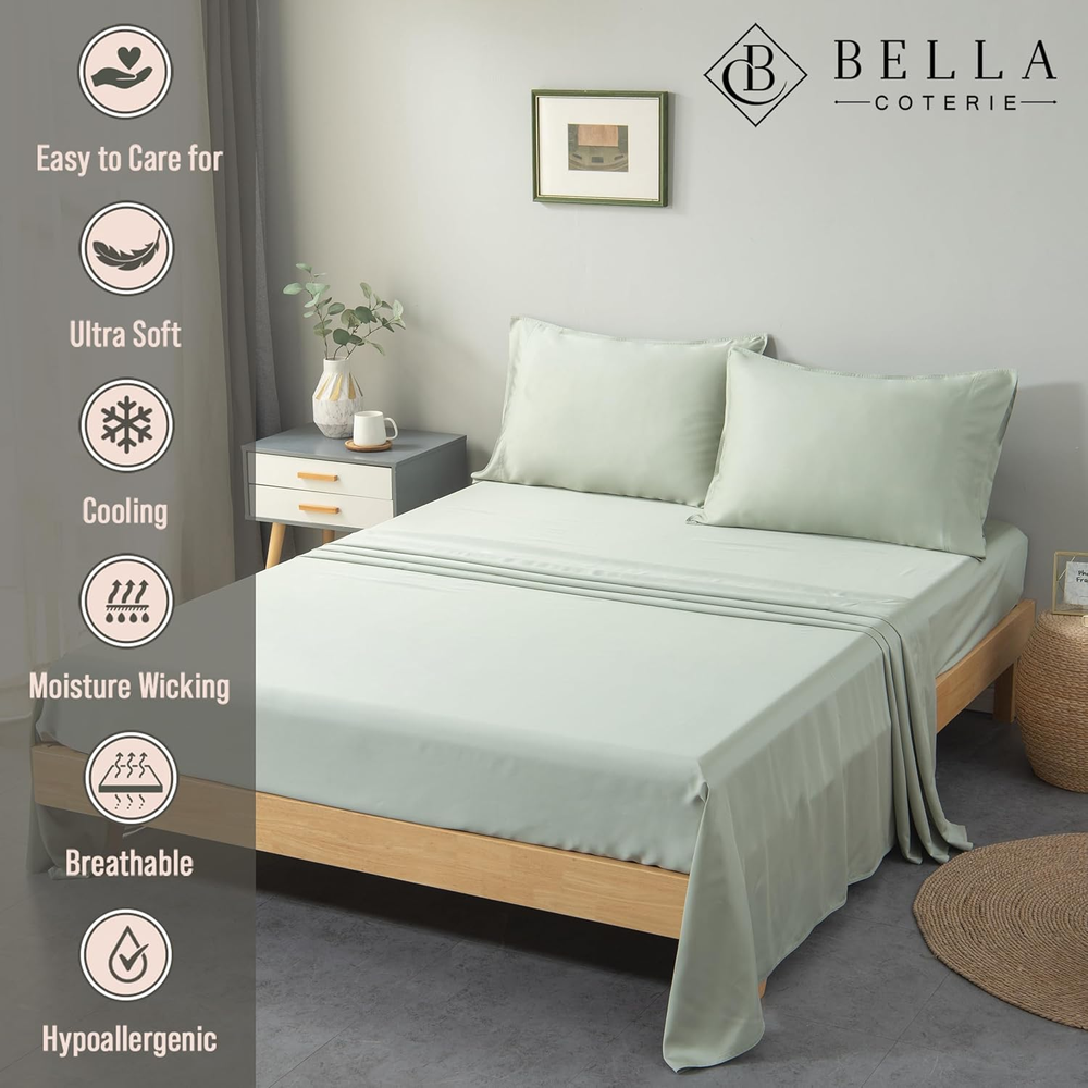 Store New Arrivals Add to Favorite View Feedback Contact Luxury Bamboo Queen Size Sheet Set | 100% Organically Grown Bamboo Viscose | Ultra Soft | Cooling for Hot Sleepers | 18" Deep Pocket [Sea Glass] Description Item model number HU-XI-201 Style Luxury Bedding Weave Type Sateen Pattern Solid Country of Origin China Theme summer Number of Pieces 4 Unit Count 1.0 Count Pillowcase Quantity 2 Material Organically Grown | Viscose Made From Bamboo Item Display Dimensions 96 x 105 inches Age Range (Description) Adult Seasons Winter, Summer, Fall, Spring Package Dimensions 14.02 x 11.65 x 3.31 inches Included Components 2 Pillowcases, Fitted Sheet, Flat Sheet Closure Type Envelope Item Weight 5.46 pounds Sham Quantity 2 Special Feature Cooling, 18" Extra Deep Pocket, Hypoallergenic, Sateen Weave, Moisture Wicking Color Sea Glass Thread Count 400 Product Care Instructions Machine Wash, Tumble Dry Size Queen RECHARGE YOUR SOUL- Embrace yourself in the luxury of 100% viscose made from bamboo sheets and you will wake up feeling renewed and refreshed. Lightweight and silky, hypoallergenic and moisture-wicking, these sheets keep you cool in summer and warm in winter. REDEFINE YOUR LIFESTYLE- With a 400 thread count, the superior quality of these viscose derived from bamboo sheets are a dream to sleep on, getting softer with every wash. The 18" extra deep pocket fitted sheet will fit even the most plush pillow top mattresses. RENEW YOUR SLEEP - You can rest well in luxury bedding knowing that your sheets have been tested and certified to be free of over 100 harmful chemicals with the OEKO-TEX 100 certification. REINVIGORATE YOUR RELATIONSHIP - Enhance every part of your relationship as you cozy up with your loved one and enjoy the silky, soft, woven bliss of viscose made from bamboo. ADD TO CART WITH CONFIDENCE in our 100% Customer Satisfaction Guarantee! Product Description Slip Into Luxurious Comfort With 100% Bamboo Viscose Bedding The video showcases the product in use. The video guides you through product setup. The video compares multiple products. The video shows the product being unpacked. How should I care for my Bella Coterie sheets to maintain their quality and durability? Simply wash and dry. Bella Coterie bamboo sheets are designed with durability in mind to resist fading and pilling. Are Bella Coterie sheets designed for a secure fit? From deep pockets that ensure a perfect fit, to non-slip straps that keep everything in place - Bella Coterie sheets are thoughtfully crafted for comfort and function. Are these sheets made from sustainable materials? Our 100% organically grown bamboo viscose sheets are OEKO-TEX Standard 100 certified, meaning every component has been tested for over 100 harmful chemicals. Rest easy knowing you're wrapped in sheets that are free from toxins and pesticides. Why choose Bella Coterie bamboo viscose sheets over cotton or synthetic? Bamboo is naturally cooling to reduce night sweats, hypoallergenic for sensitive skin, and is moisture wicking to keep your sheets dry and free of allergens.. Are Bella Coterie Sheets soft to the touch and breathable? Say goodbye to rough and scratchy sheets! Organically grown bamboo viscose offers unparalleled silky softness without synthetic fibers that can irritate skin. Experience cooling comfort - naturally breathable for temperature control. Bella Coterie Luxury Bedding Add to Cart Add to Cart Add to Cart Customer Reviews 4.4 out of 5 stars 3,688 4.4 out of 5 stars 98 4.5 out of 5 stars 423 4.5 out of 5 stars 287 Price $129.99 $ 129 . 99 $129.99 $ 129 . 99 $29.74 $ 29 . 74 — Material 100% Viscose from Bamboo 100% Viscose from Bamboo 100% Viscose from Bamboo 100% Pure 6A Mulberry Silk Secure Fit 18" Extra Deep Pockets 8 Corner Ties & Button Closure Envelope Sham Zipper Closure Fabric Feel Silky Smooth & Cool to Touch Silky Smooth & Cool to Touch Silky Smooth & Cool to Touch Ultra Soft & Breathable Temperature Regulating Breathable & Cooling Breathable & Cooling Breathable & Cooling Cozy & Cool Designer Color Collection 16+ Colors Available 14+ Colors Available 16+ Colors Available 10+ Colors Available Machine Washable ✔ ✔ ✔ ✔ Anti-Pilling / Anti-Fading ✔ ✔ ✔ ✔ OEKO TEX Certified ✔ ✔ ✔ ✘ ABOUT US We offer the best prices around on high quality products. Our E-store includes media such as books, movies, music and games while offering electronics, toys, sporting apparel, clothing, tools, general home, garden items and more. SHIPPING We are always working hard to ensure your package arrives as soon as possible. Please understand that some factors like weather, high postal traffic, and the performance of shipping companies are outside of our control. We offer free shipping to the lower 48 states and ship within 2 business days of payment, usually sooner. We do not accept P.O. Boxes. Please provide a physical address. For shipping outside of the continental USA, we only use eBay's Global Shipping Program.The item is shipped to KY and then sent to the rest of the world. International customers are responsible for all duties and taxes. Continue to check out in order to calculate costs for shipping the item to your country. Messages regarding eBay's Global Shipping Program MUST be directed at eBay EXCLUSIVELY. RETURNS We offer a 30-Day Return Policy on items which you are not completely satisfied with. You have the option for a full-refund or an exchange of the item. No returns are available on items shipped outside of the USA. PAYMENT We accept PayPal. CONTACT US This page content is yet to come Please ad us to your favorite seller and visit again later Thank You CUSTOMER SATISFACTION We try our very best to make sure every customer is completely satisfied. If there's a problem, message us! We're happy to help.