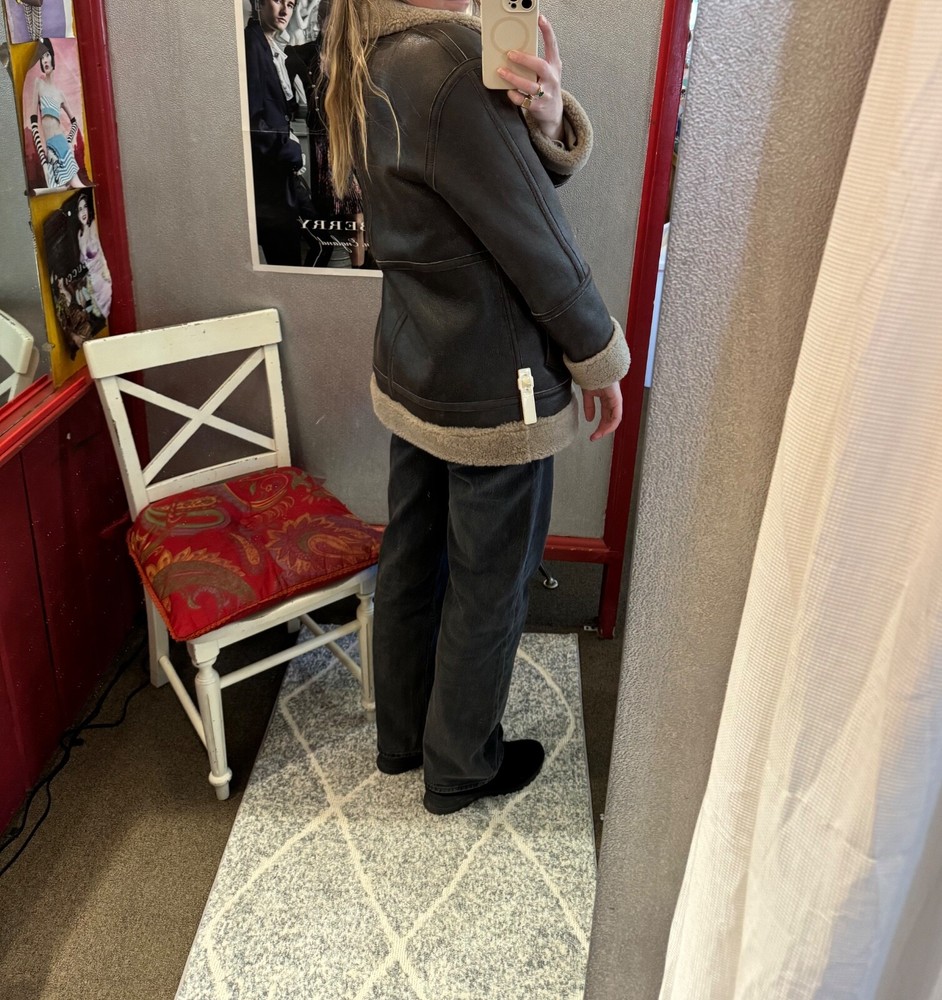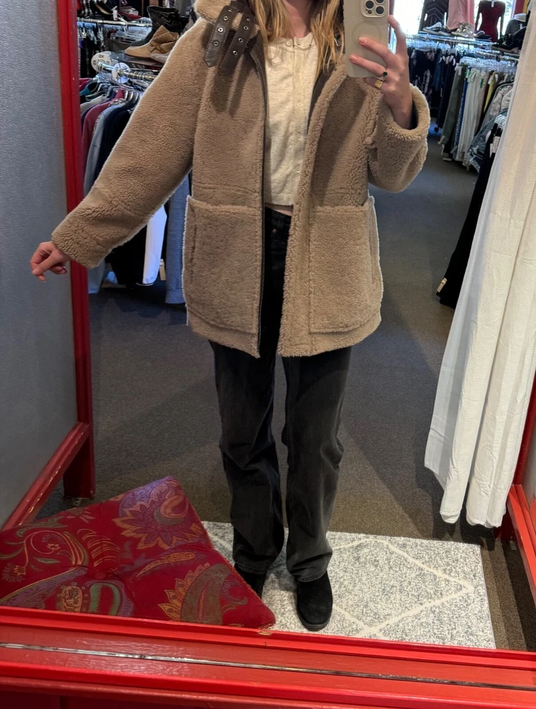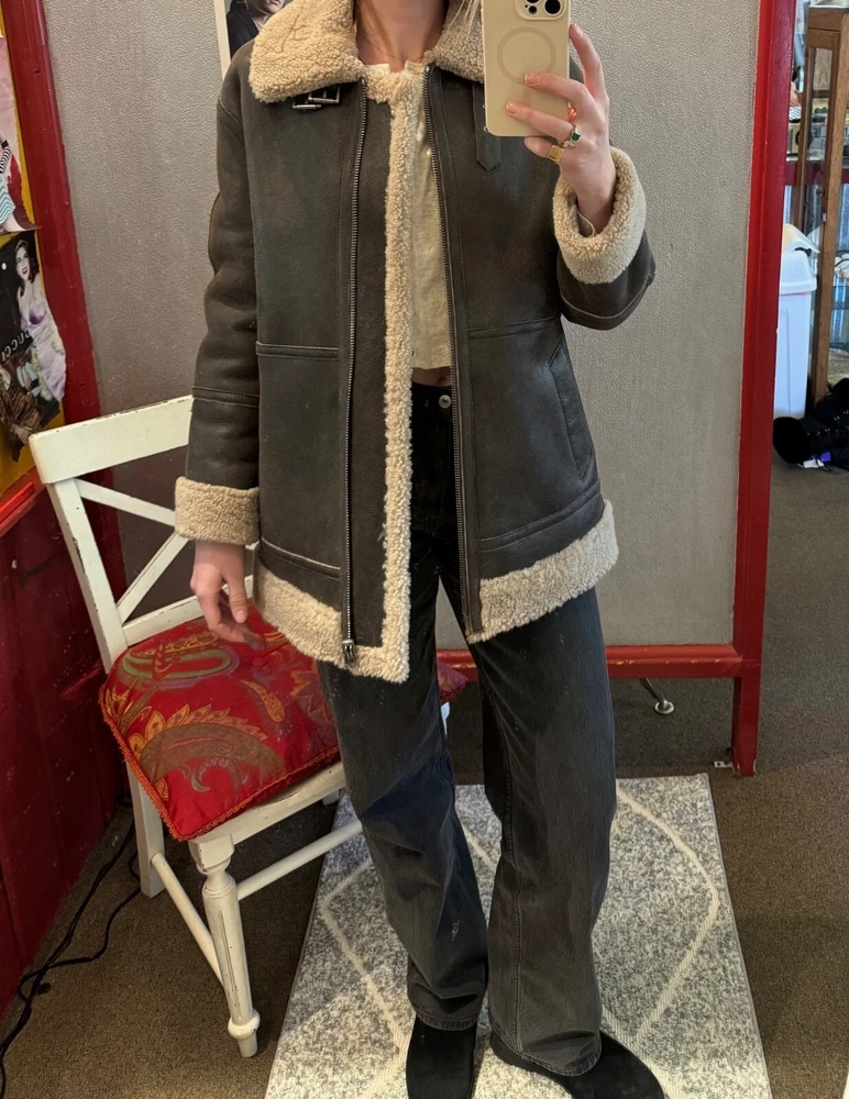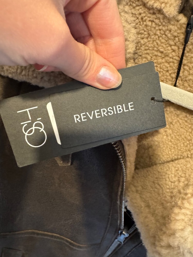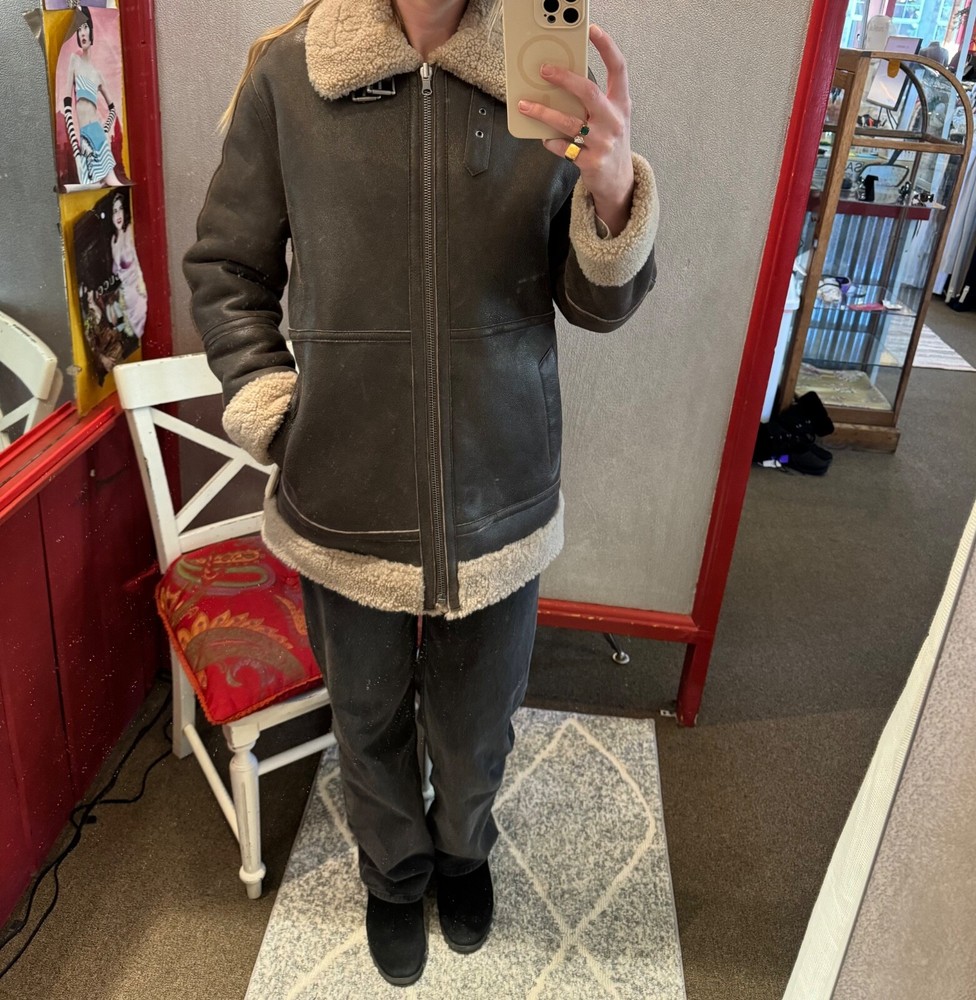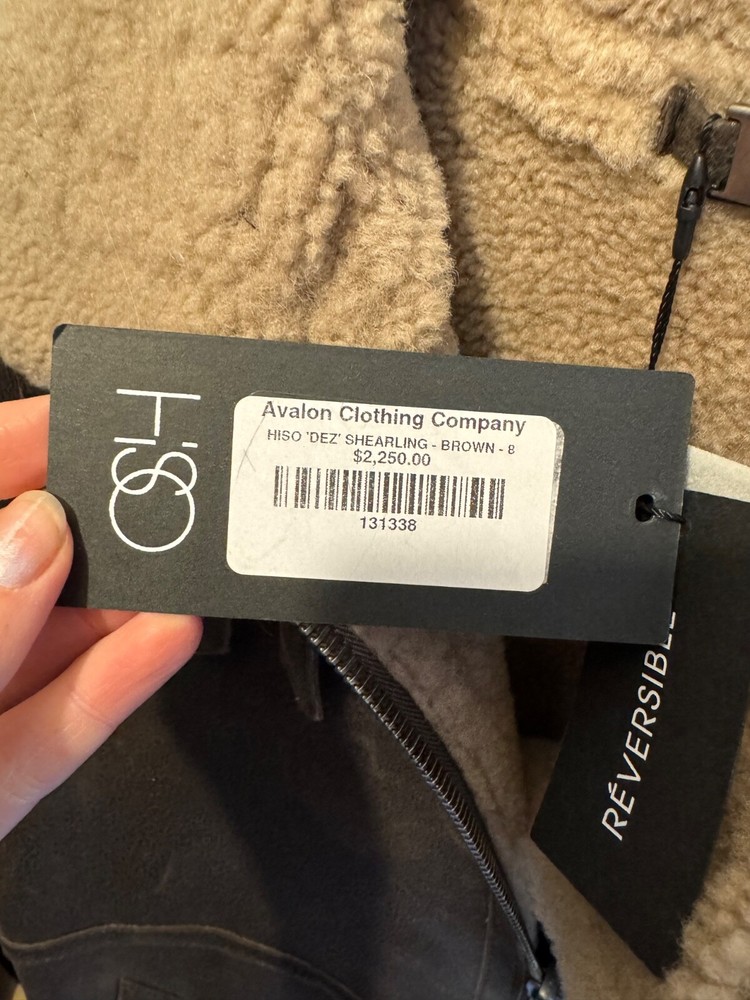 Brand new reversible warm winter coat. Zero wear, and extremely well made with real leather and sherpa. Color is a nice taupe/brown leather with beige shearling. Got in Aspen, CO as a gift and do not need in my wardrobe. Thanks!